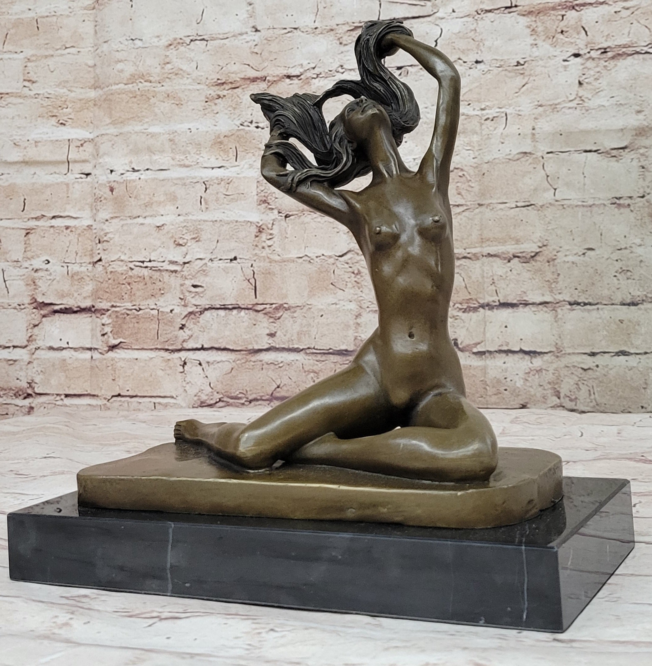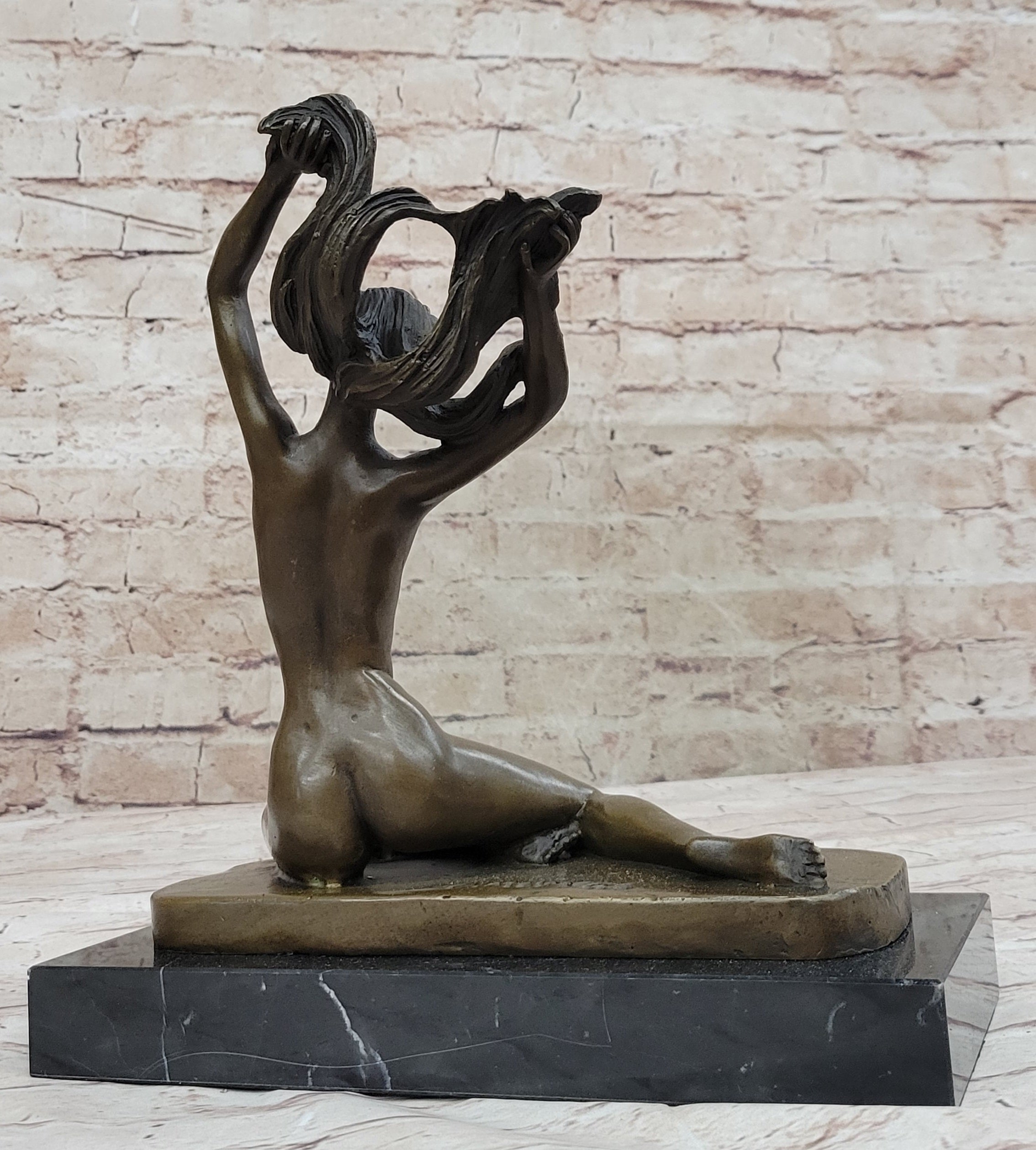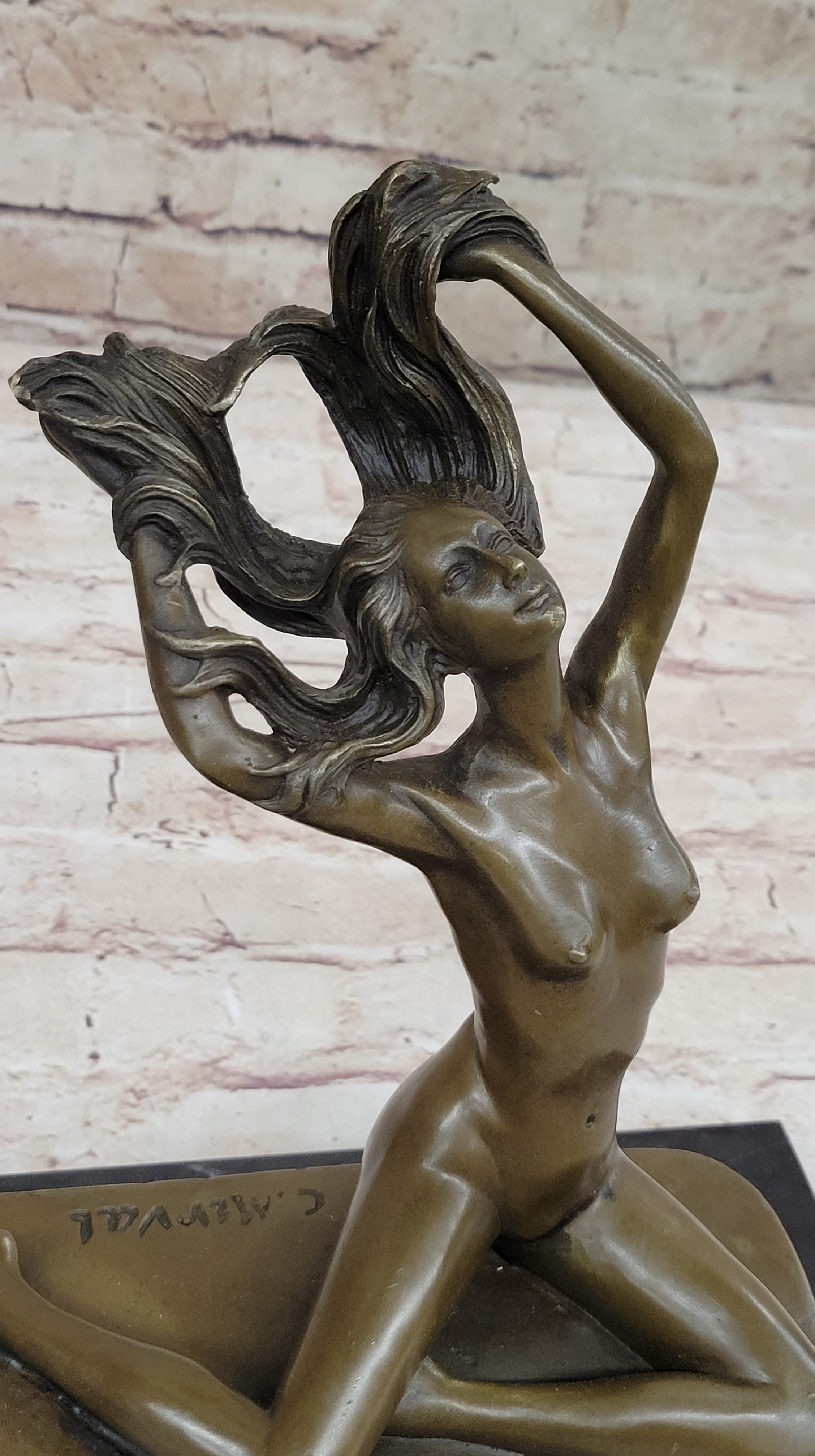 Introducing an exquisite bronze sculpture that captures the essence of an artist's muse. This captivating piece portrays a woman confidently posing in the nude, as she becomes the source of inspiration for the strokes of the artist's paintbrush. Comfortable in her natural state, she elegantly folds her long legs before the easel, gracefully reaching up to toss her flowing hair. Meticulous attention has been dedicated to every detail, highlighting the exquisite lines of her ribcage as her body extends. Handcrafted with utmost care, this sculpture is made from 100% bronze using the revered "Lost Wax Method." The rich brown patina adds depth and character, enhancing the beauty of the artwork. Expertly mounted on a sleek black marble base, this sculpture stands as a testament to the artist's skill and vision. The piece is signed by the esteemed artist, C. Mirval, ensuring its quality and value. Invite the timeless allure of the artist's muse into your space with this remarkable bronze sculpture. Perfect for art enthusiasts and collectors alike, it serves as a captivating centerpiece that evokes emotion and showcases the beauty of the human form in its most natural state.