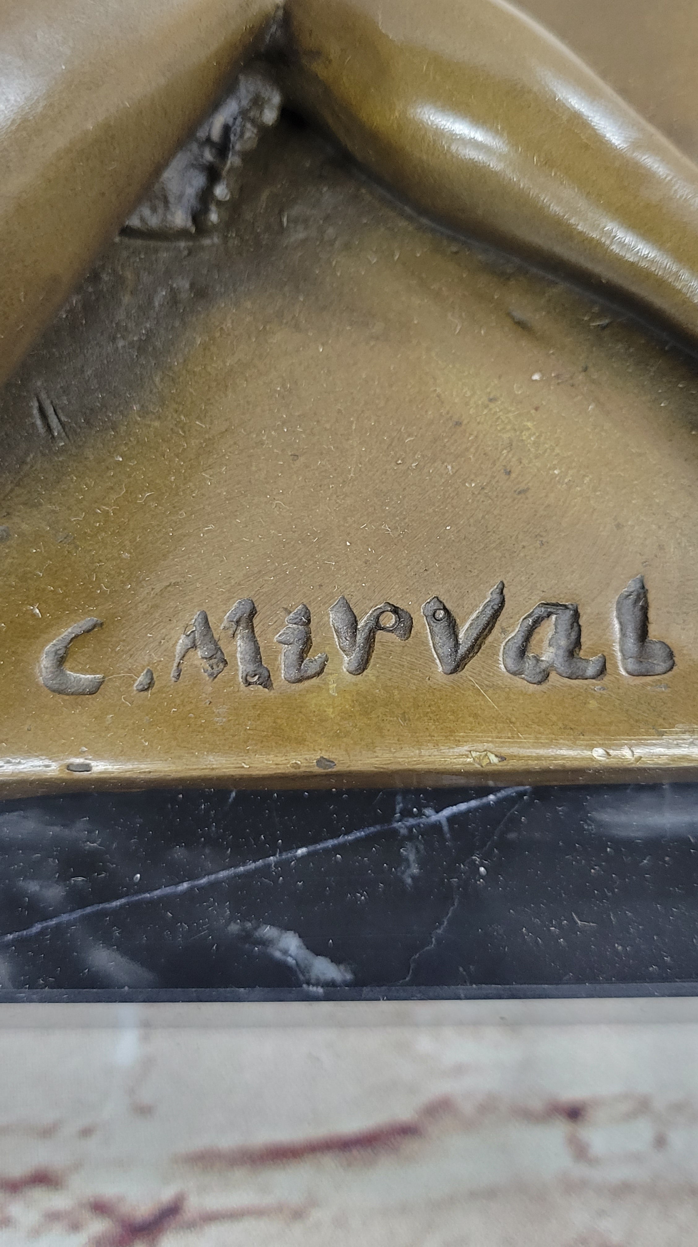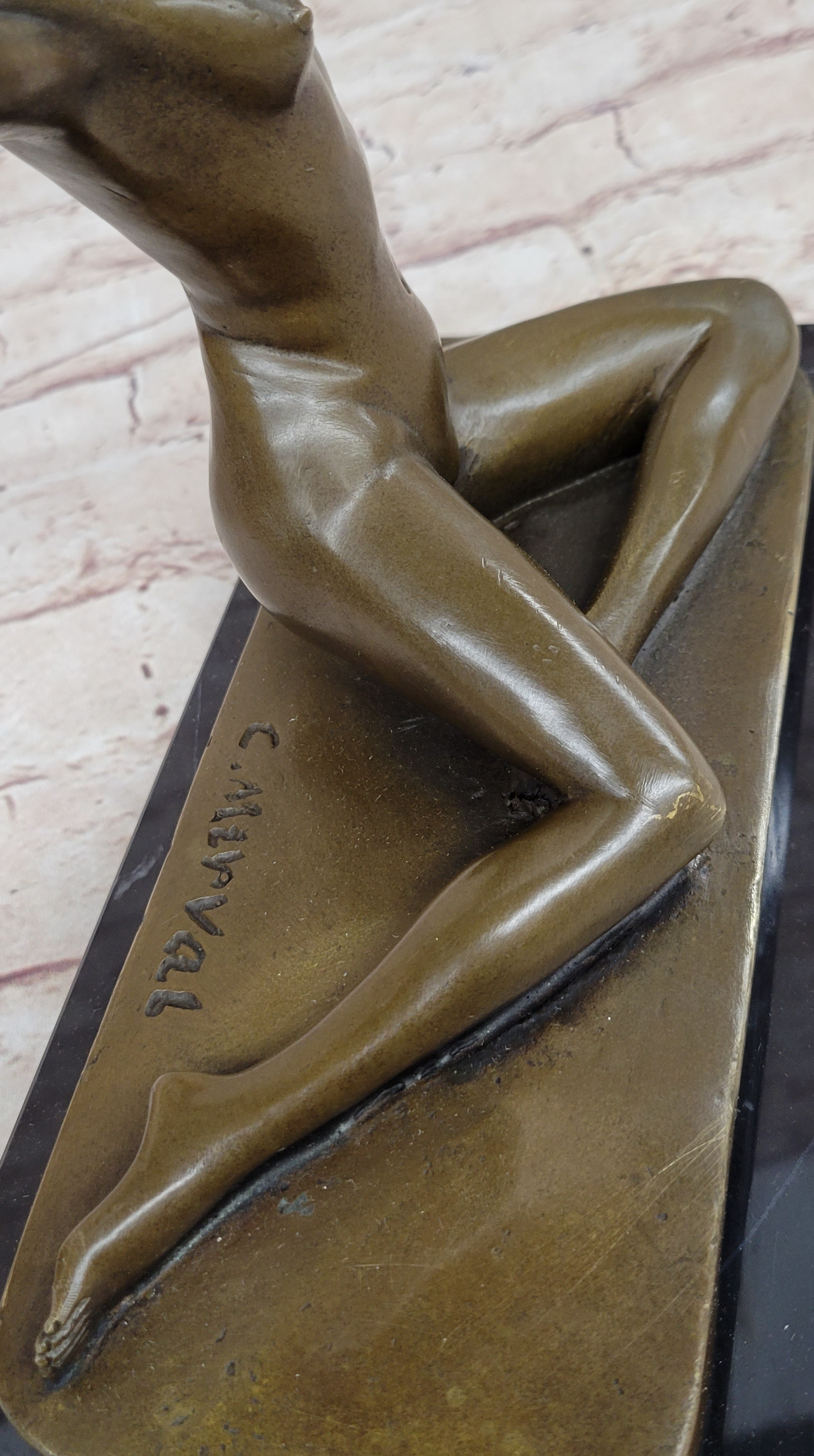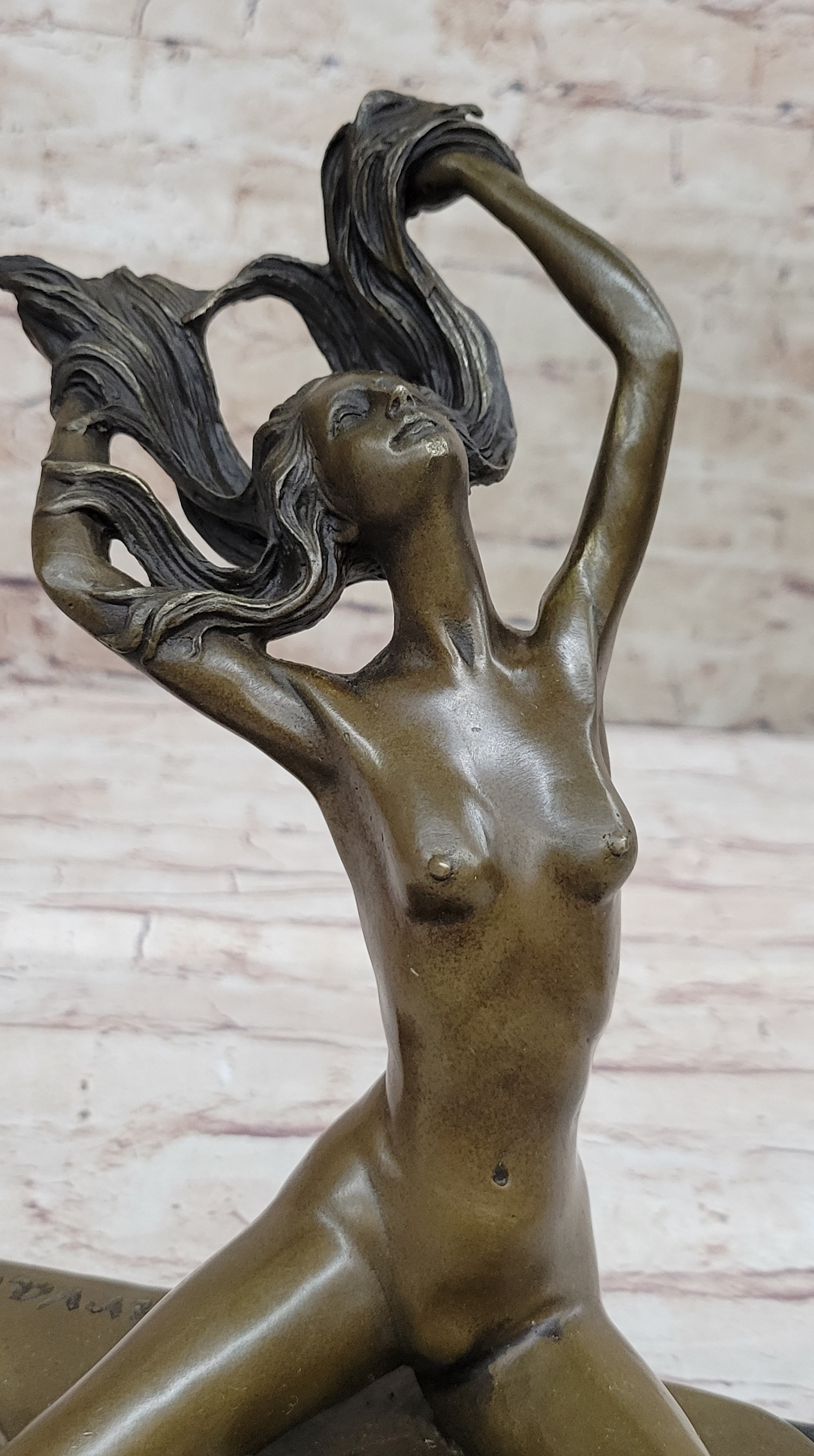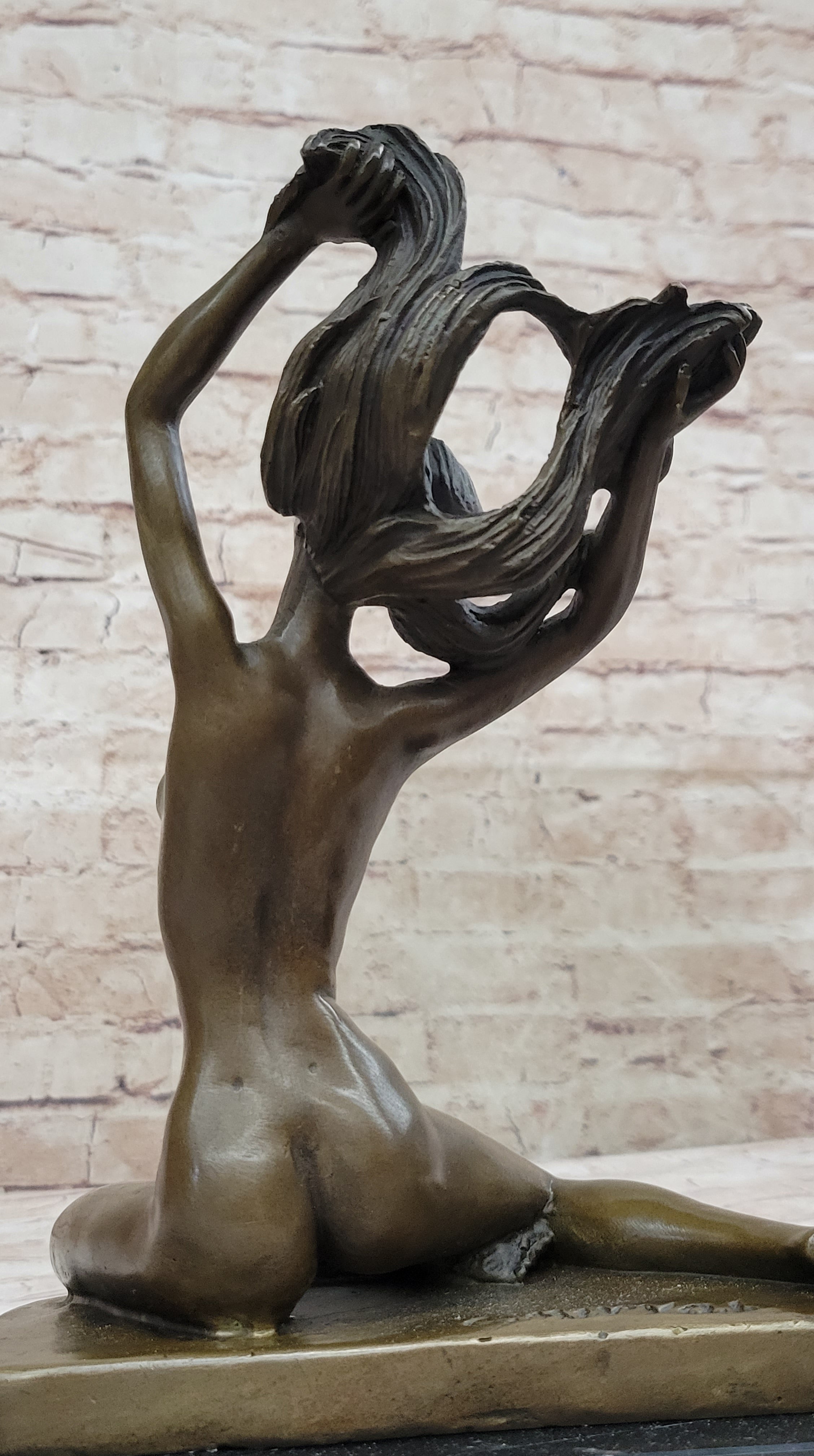 Introducing an exquisite bronze sculpture that captures the essence of an artist's muse. This captivating piece portrays a woman confidently posing in the nude, as she becomes the source of inspiration for the strokes of the artist's paintbrush. Comfortable in her natural state, she elegantly folds her long legs before the easel, gracefully reaching up to toss her flowing hair. Meticulous attention has been dedicated to every detail, highlighting the exquisite lines of her ribcage as her body extends. Handcrafted with utmost care, this sculpture is made from 100% bronze using the revered "Lost Wax Method." The rich brown patina adds depth and character, enhancing the beauty of the artwork. Expertly mounted on a sleek black marble base, this sculpture stands as a testament to the artist's skill and vision. The piece is signed by the esteemed artist, C. Mirval, ensuring its quality and value. Invite the timeless allure of the artist's muse into your space with this remarkable bronze sculpture. Perfect for art enthusiasts and collectors alike, it serves as a captivating centerpiece that evokes emotion and showcases the beauty of the human form in its most natural state.