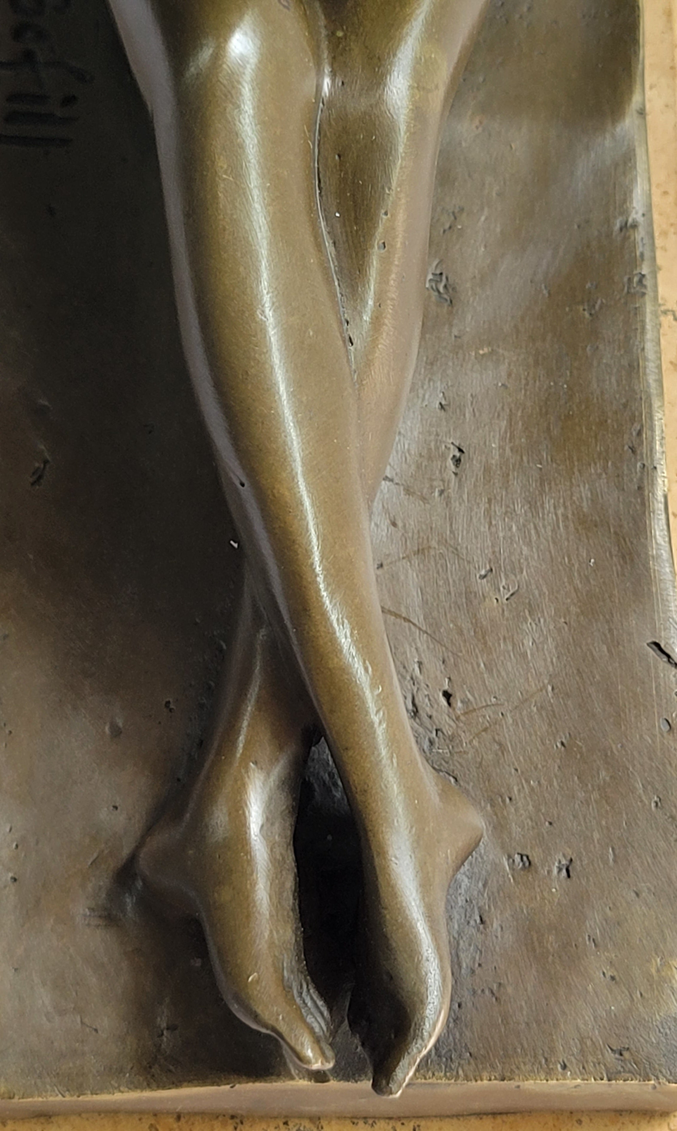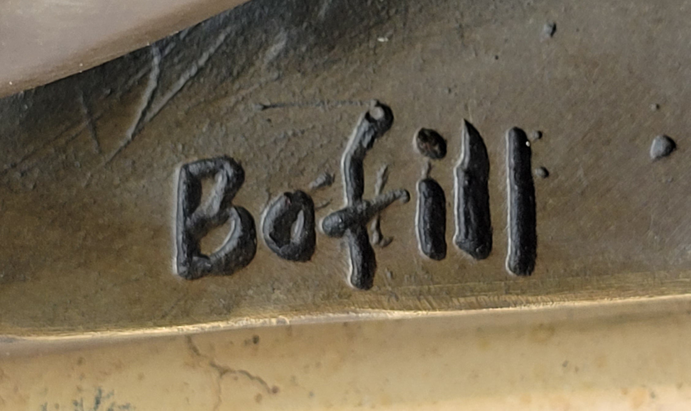 Crafted using the time-honored "Lost Wax Method," this captivating sculpture captures the essence of the ancient art form, preserving the intricate details and nuances of the woman's form with exquisite precision. Adorned with a rich brown patina finish, the sculpture radiates a timeless allure, underscoring the enduring beauty and artistry inherent in its craftsmanship. Meticulously fashioned entirely by hand and cast in 100% bronze, the sculpture rests gracefully upon a Beige marble base, elevating its visual appeal and accentuating its seamless integration within any space. Bearing the signature of the esteemed artist Bofill, this exceptional piece stands as a testament to the enduring allure and timeless grace embodied by the feminine form amidst the splendor of nature's bountiful beauty.Bronze Dimensions with Marble Base: Height 8.5" x Width 8.5"