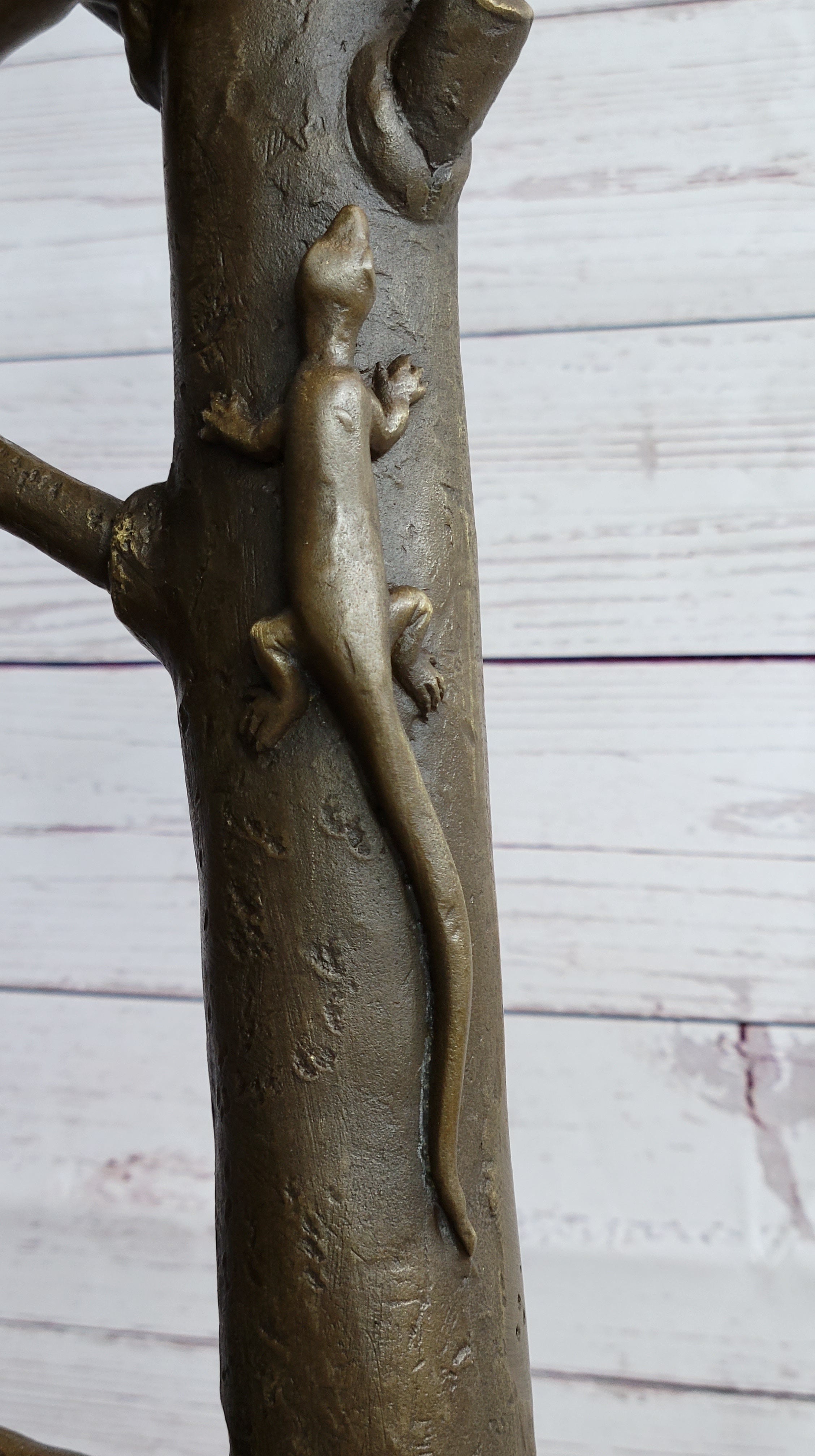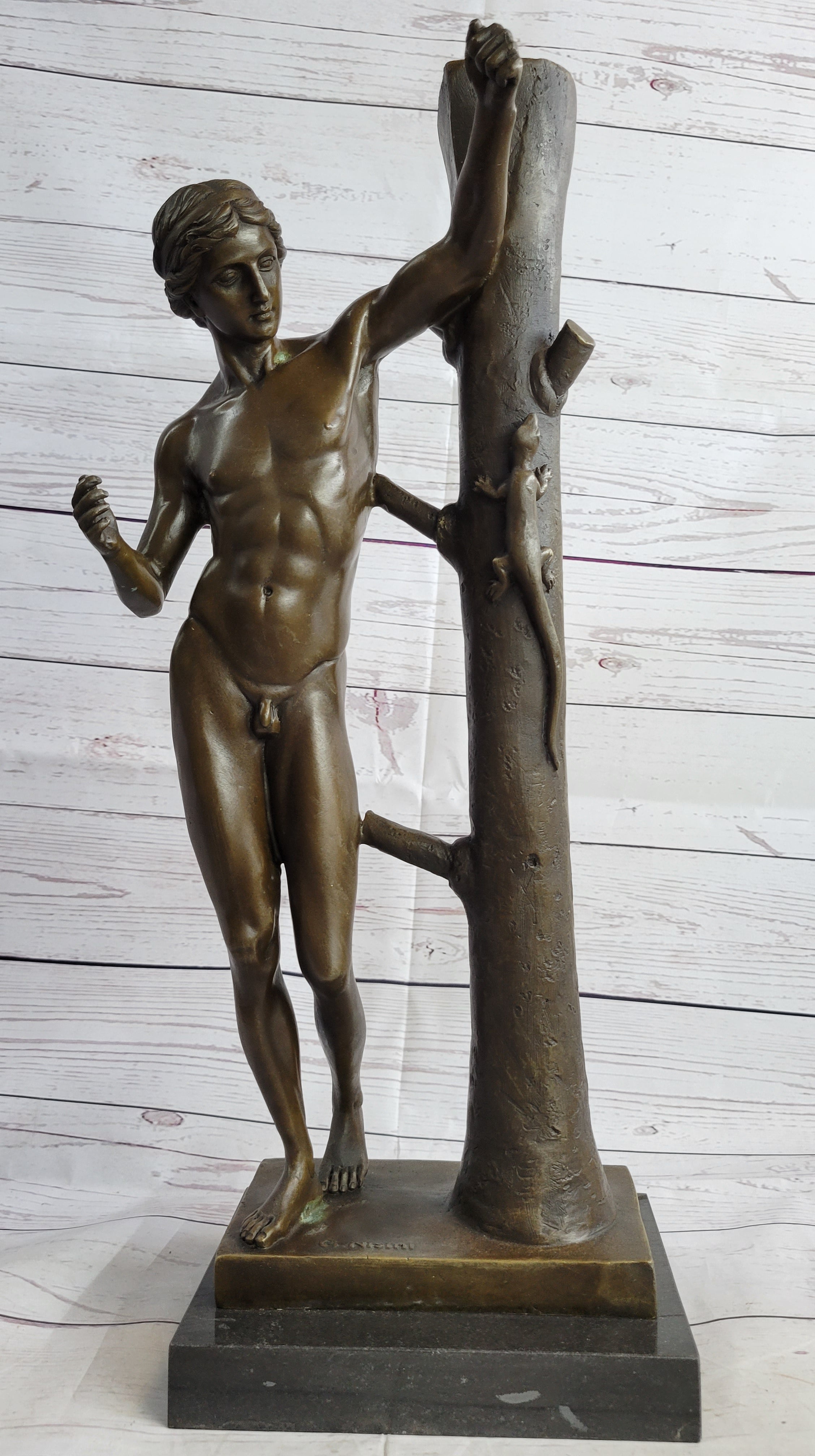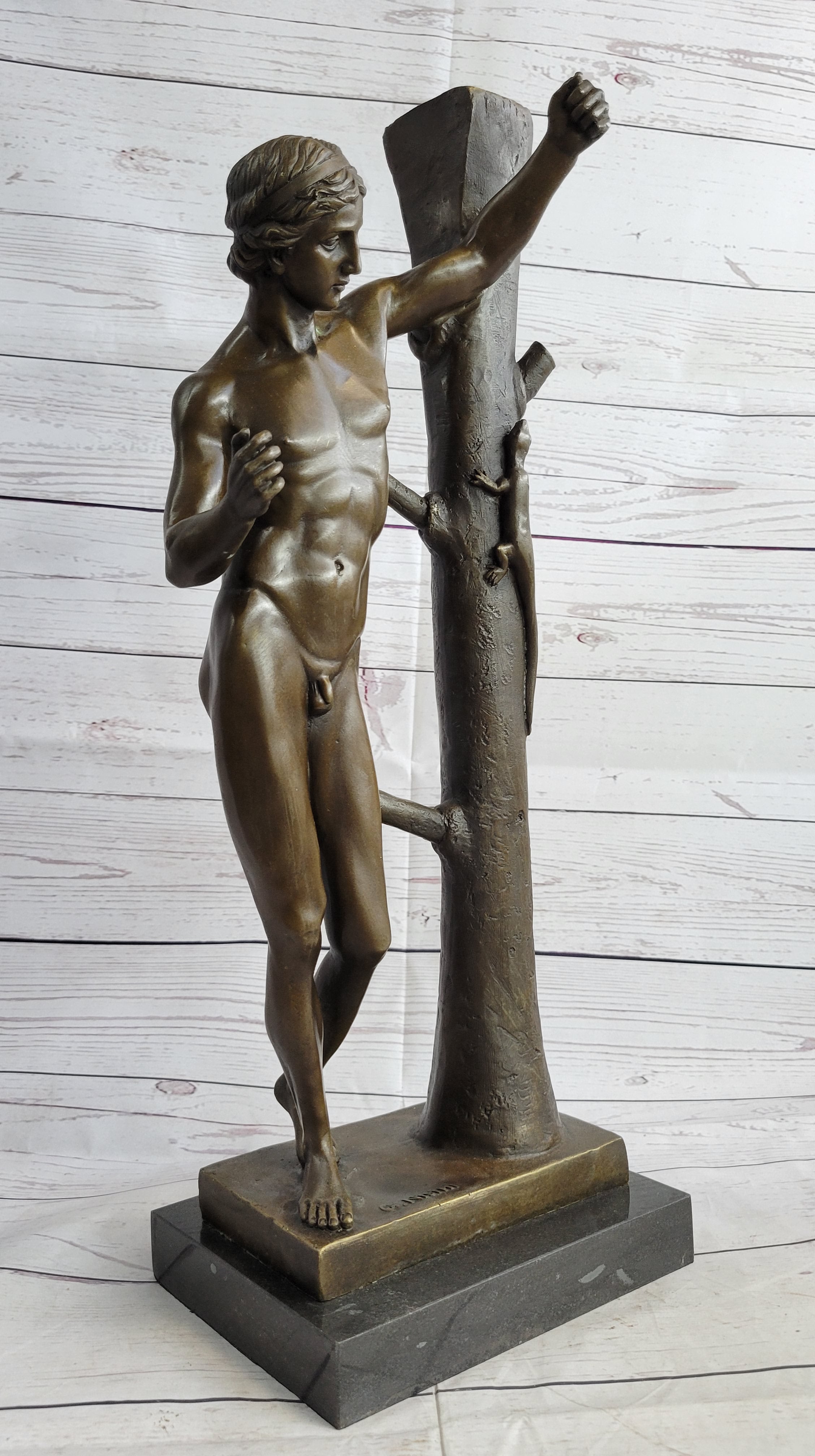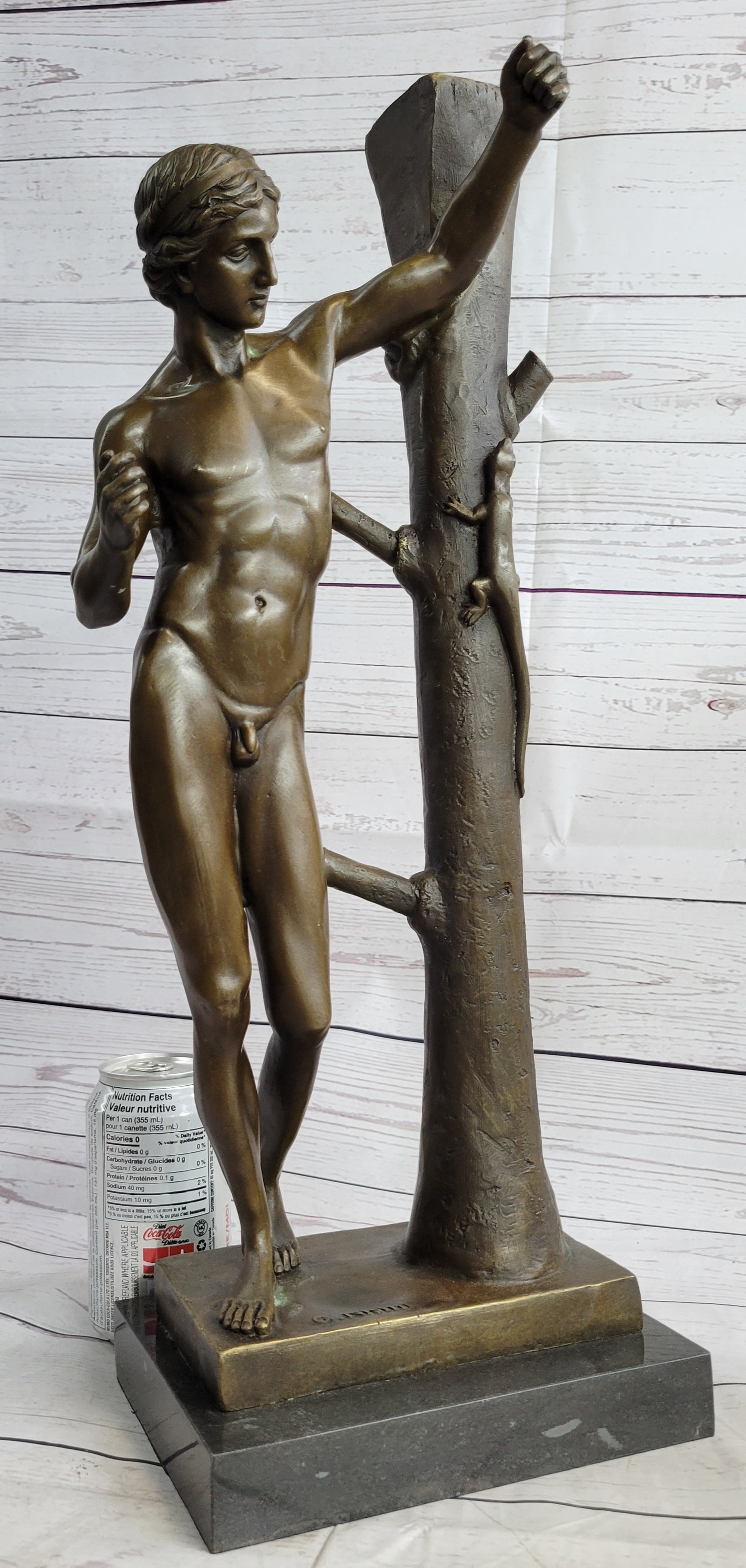 Transport yourself to the tranquility of a wooded garden with this mesmerizing bronze sculpture. Here, in the heart of nature, a nude male figure takes a leisurely stroll, his attention captivated by a lizard gracefully making its way up a tree. Enthralled by the lizard's graceful ascent, he pauses, resting his left forearm against the tree trunk, his gaze locked on the reptile's elegant climb towards the canopy above.