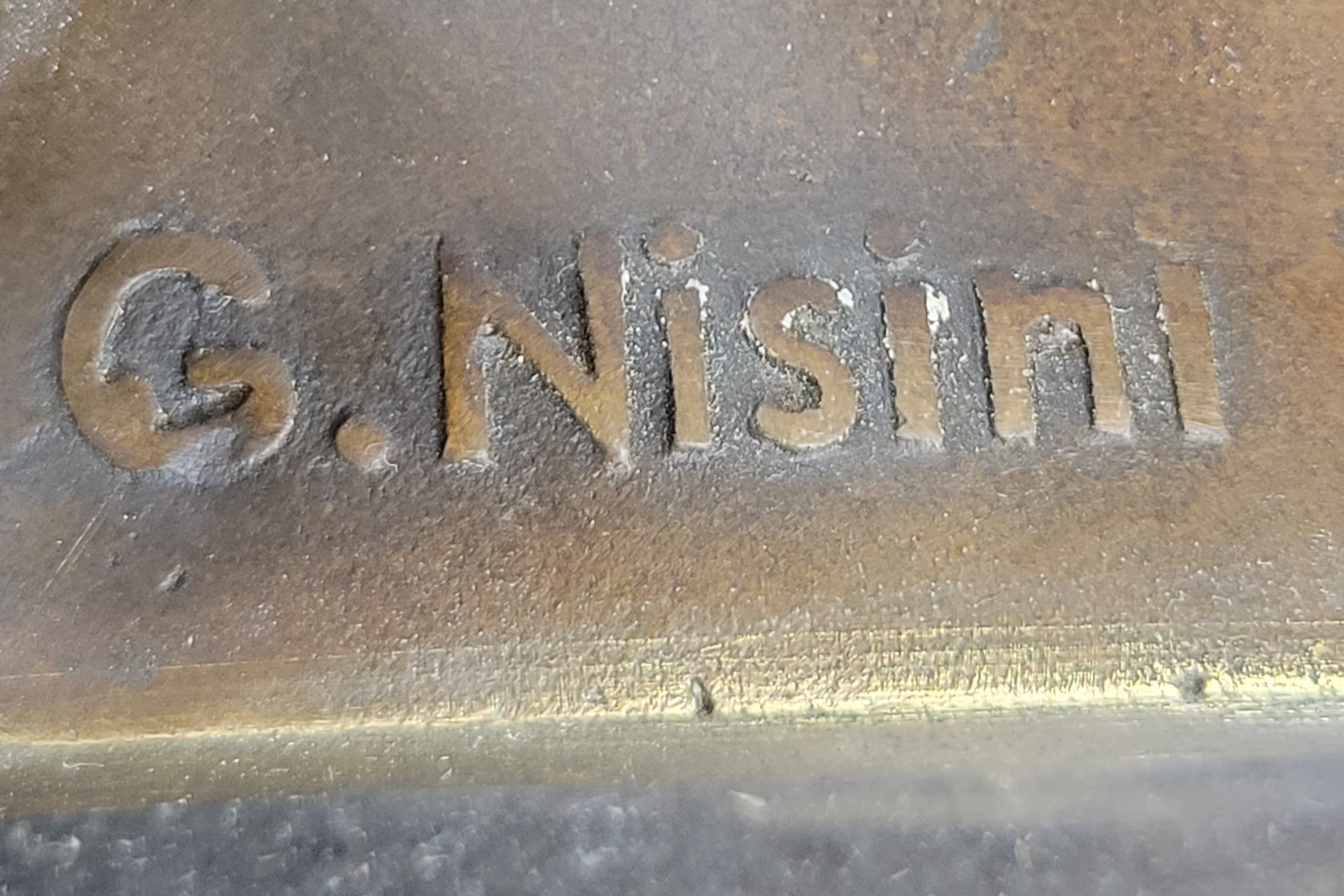 Crafted with meticulous precision, this bronze sculpture embodies the time-honored technique of lost-wax casting, ensuring that every intricate detail is faithfully preserved, guaranteeing its enduring beauty. Enhanced with a lustrous brown patina finish, it exudes an ageless charm that transcends time. Poised atop an elegant black marble base, this masterpiece bears the unmistakable signature of the renowned artist G. Nisini.