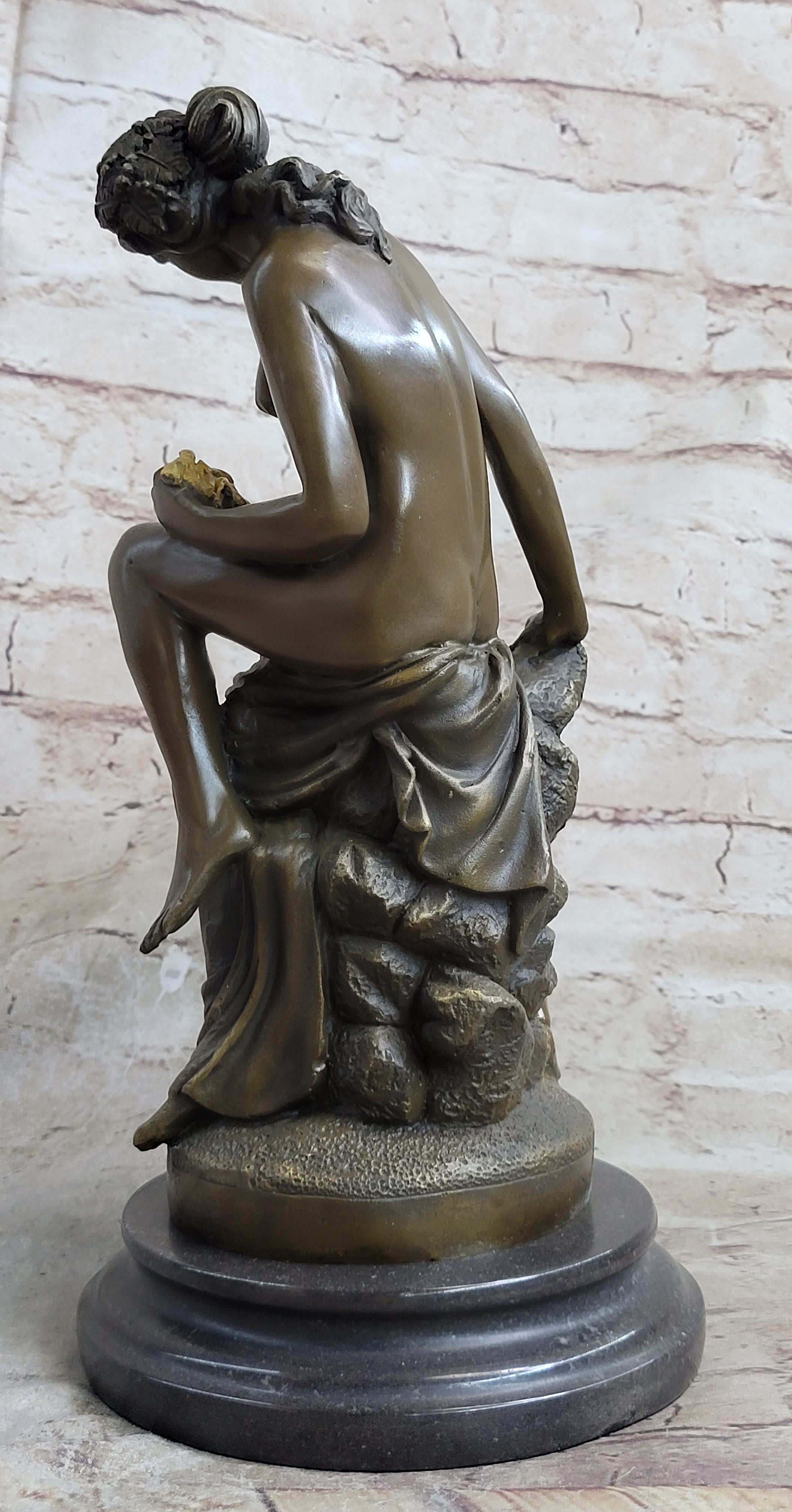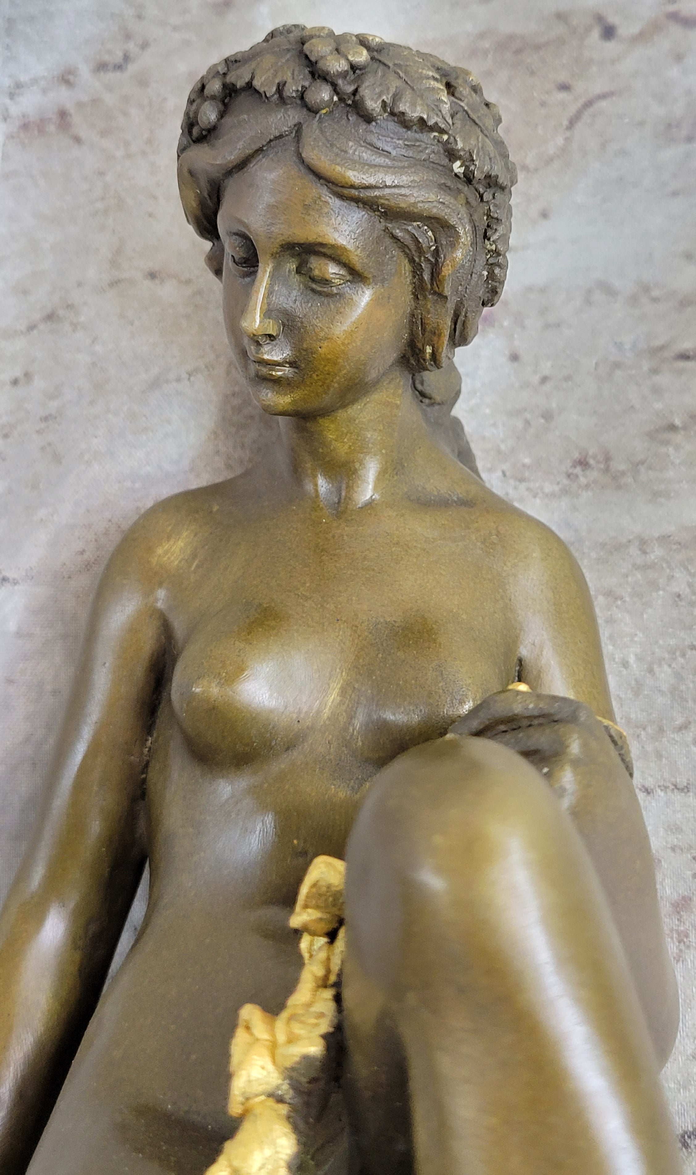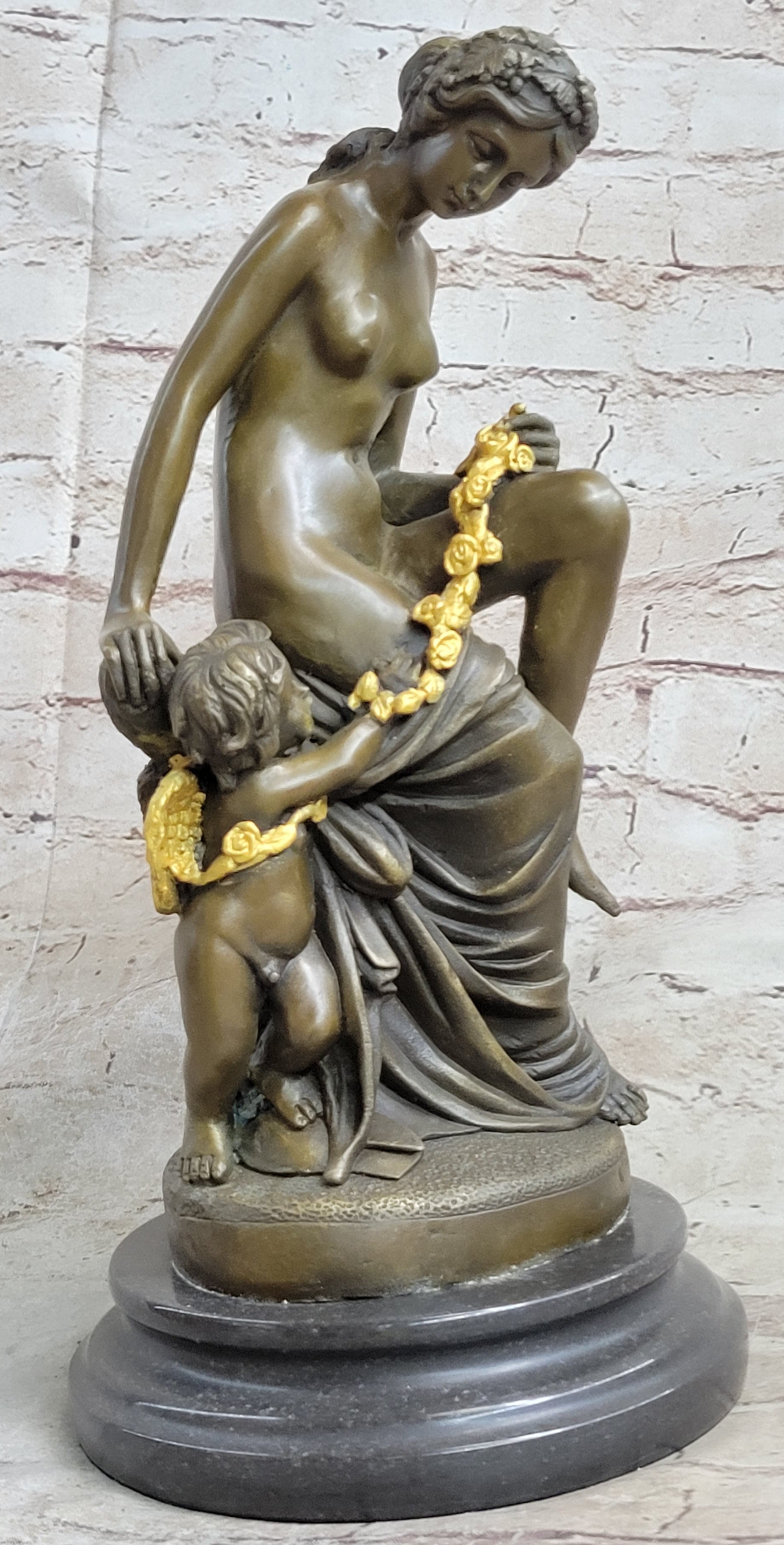 The woman, portrayed with exquisite beauty, sits in an almost complete state of undress, her garment elegantly draped around one thigh and cascading to the ground in gentle ripples. Holding a row of rose buds, she adds a touch of natural elegance to the composition, enhanced by the intricate detailing achieved through the lost wax method. The sculpture is handcrafted with meticulous care, featuring a brown patina that adds depth and warmth to the bronze. Gold accents further elevate the piece, contributing a touch of opulence and highlighting key elements within the artwork.