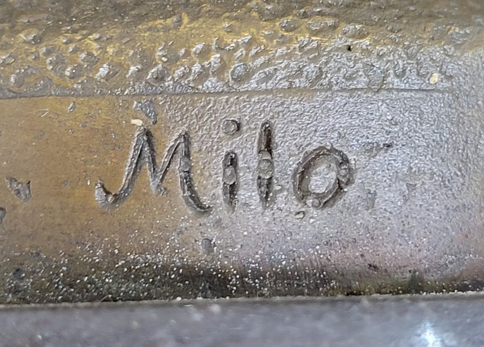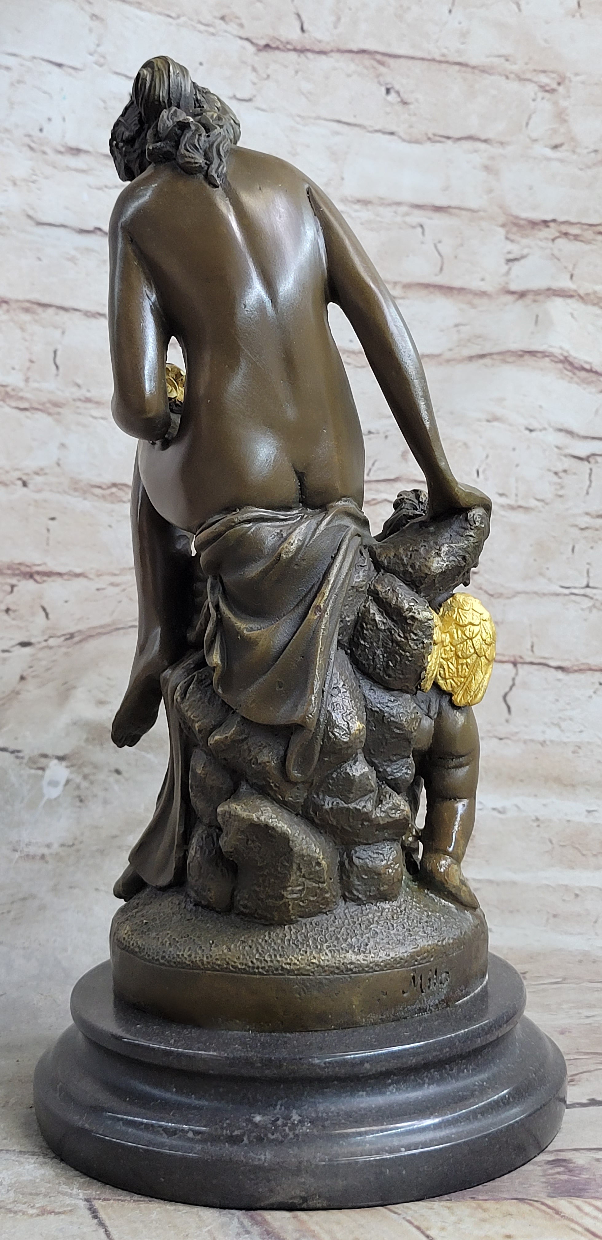 Crafted with precision using the lost wax method, this sculpture attains a level of detail that brings the scene to life. The artist, Milo, leaves his signature on the piece, signifying his role in creating this captivating and evocative artwork. Mounted on a black marble base, the sculpture not only provides stability but also complements the overall composition, creating a visually striking presentation. The result is a harmonious blend of artistic skill, narrative richness, and timeless beauty captured in a moment of connection between the cherub and the enchanting woman.Bronze Dimensions with Marble Base: Height 13" X Width 6"