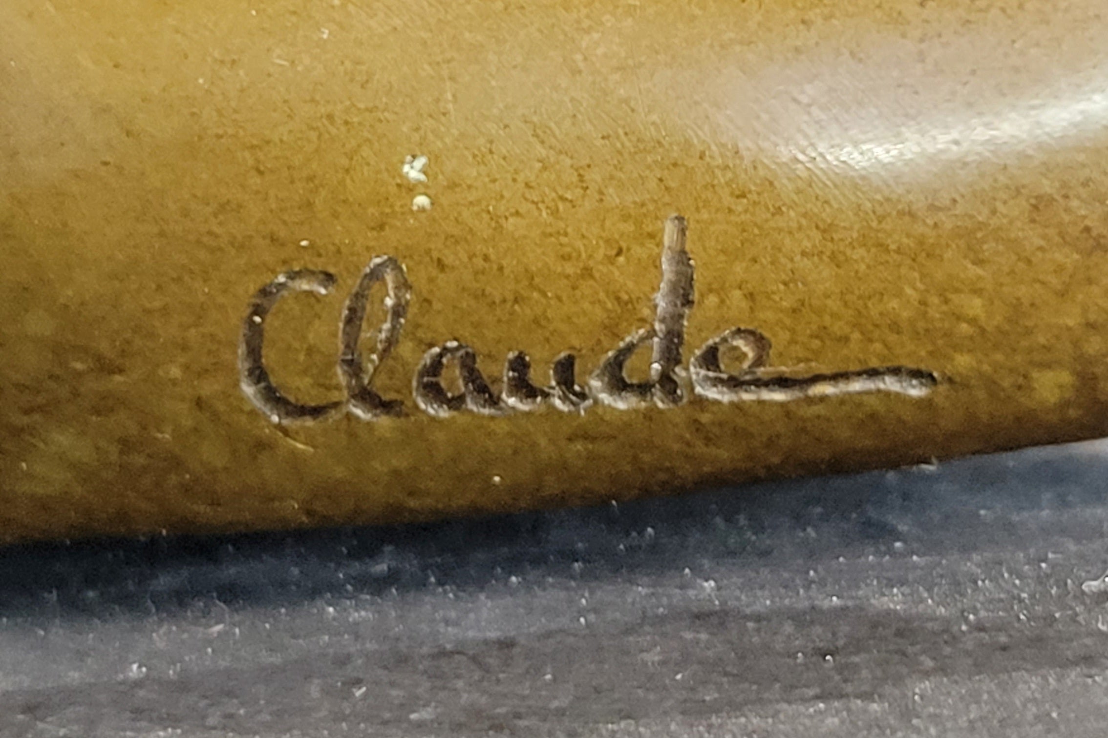 Mounted upon a sleek black marble base, the sculpture is both grounded and elevated, providing a stark contrast to the warmth of the bronze. The artist's signature, "Claude," is discreetly etched into the base, a final mark of craftsmanship. This piece stands as a powerful testament to the timeless allure of the feminine form, immortalized in bronze and marble.Bronze Dimensions with Marble Base: Height 7" x Width 7"