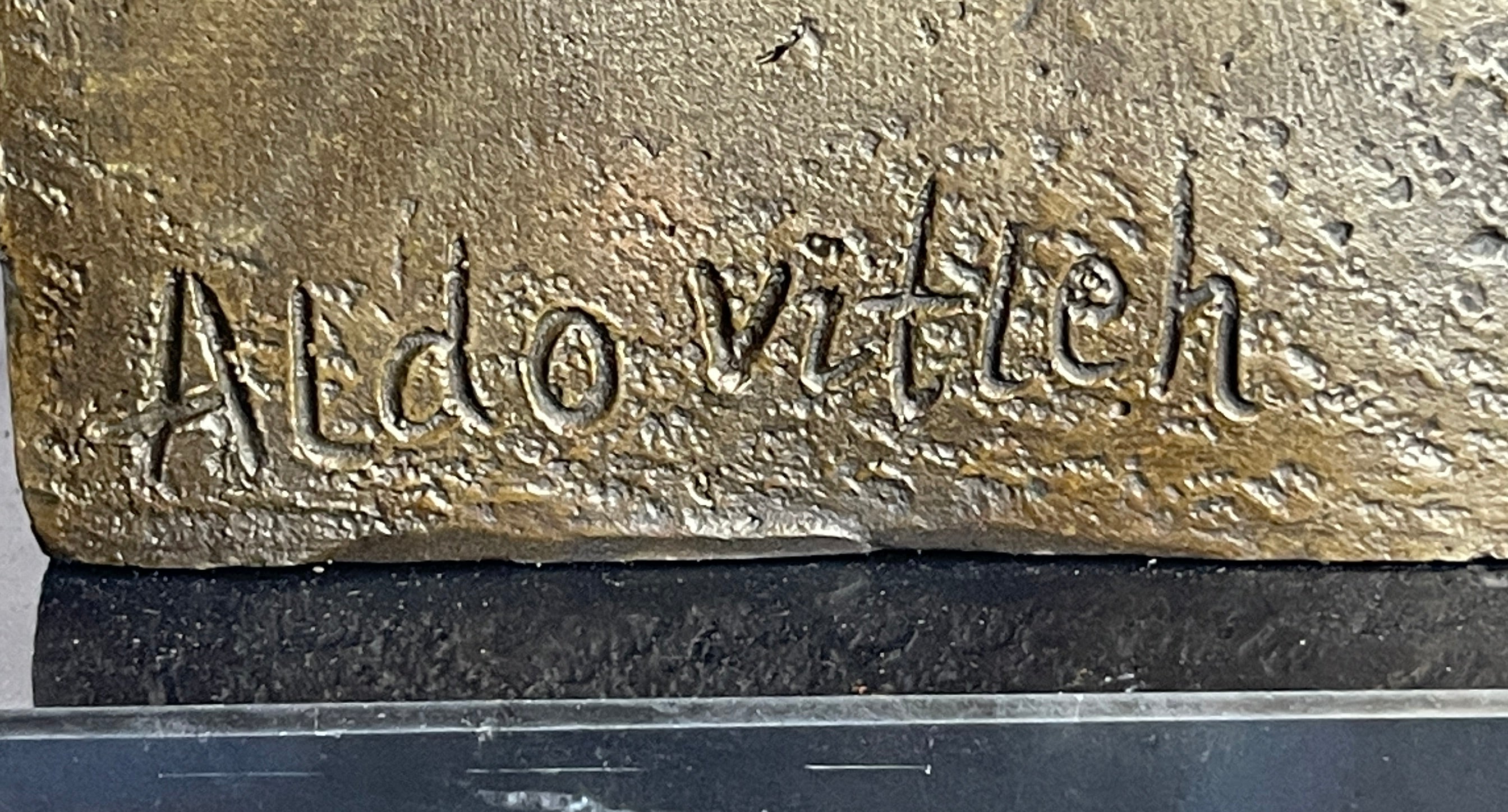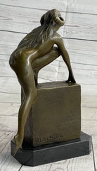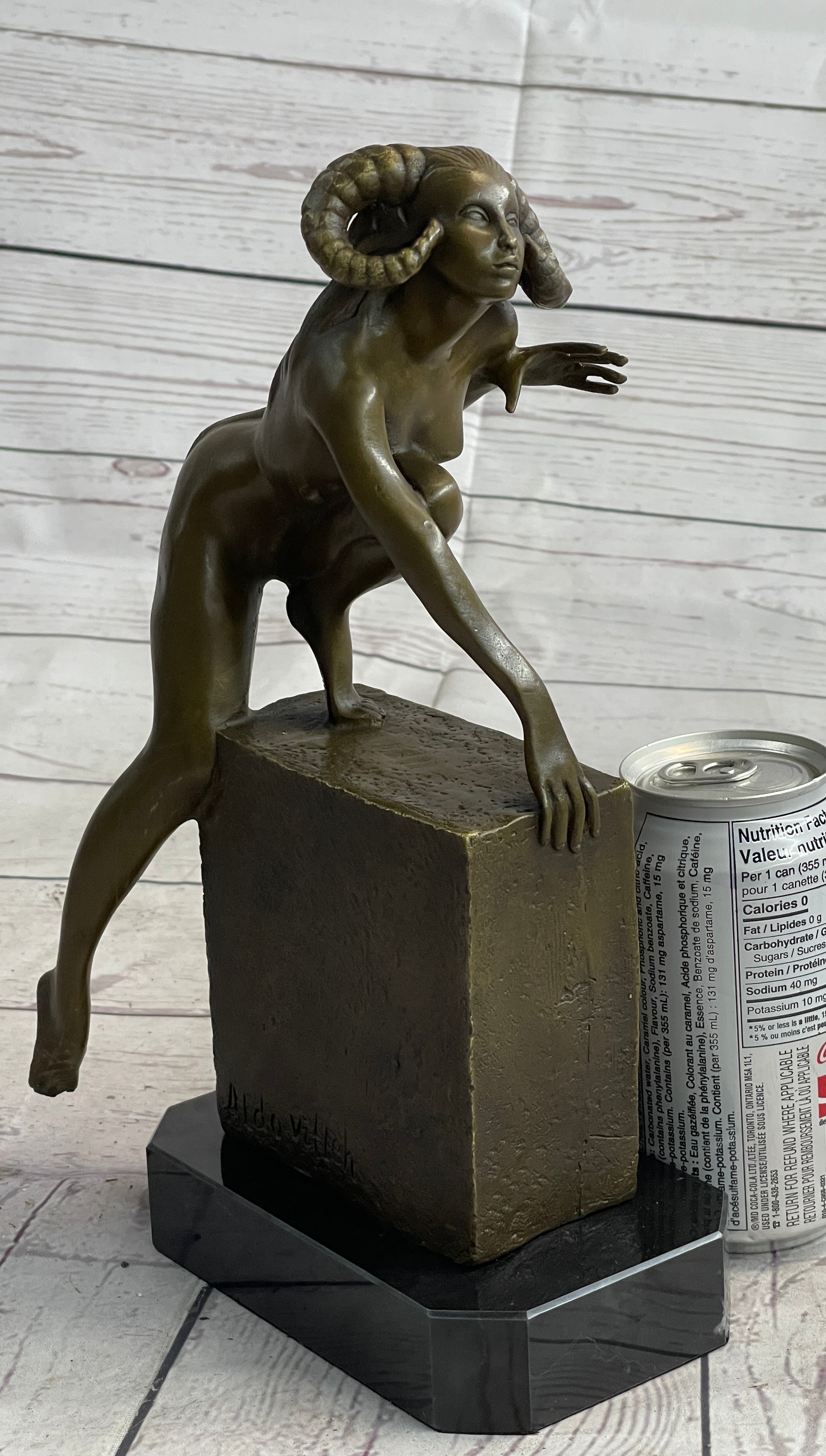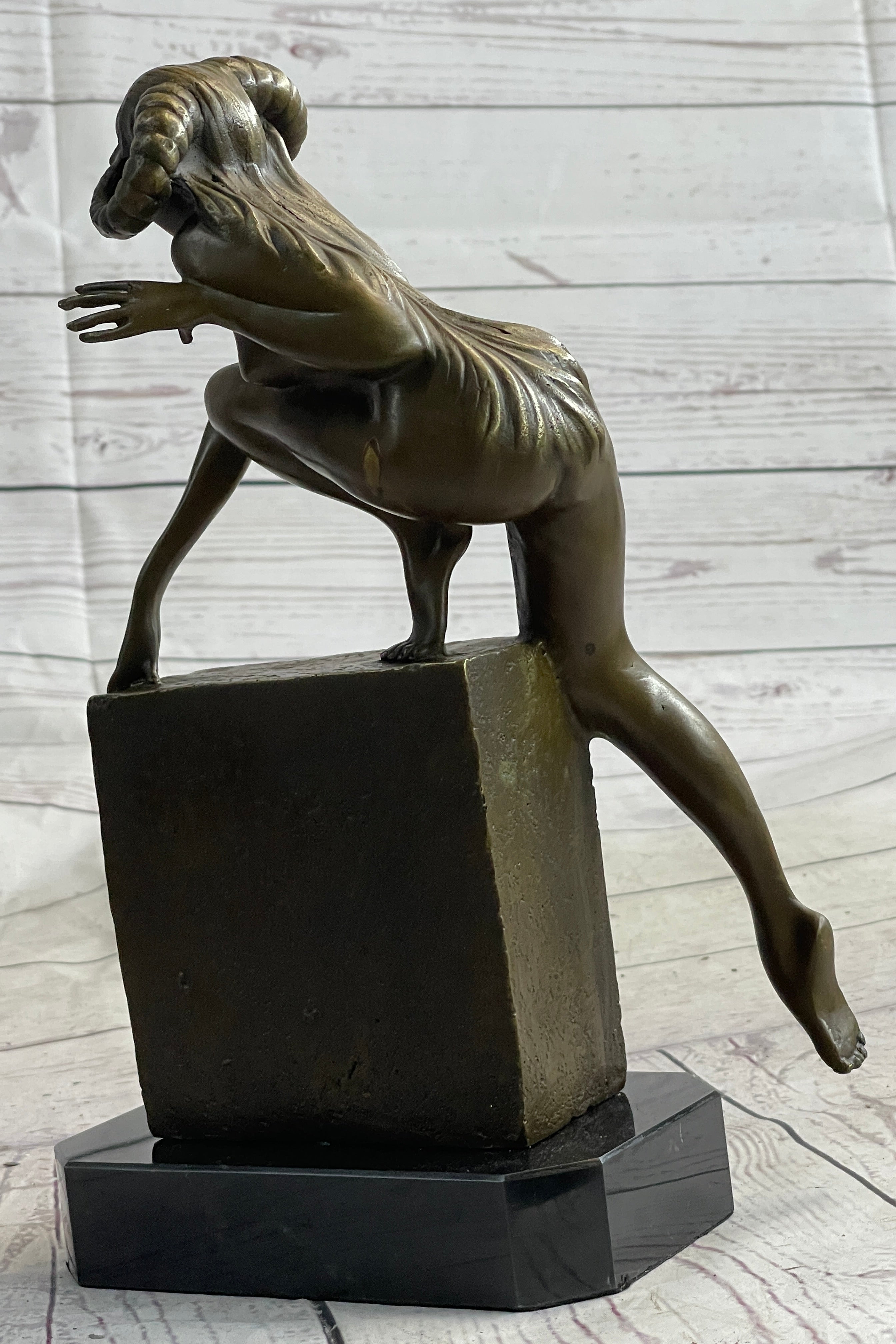 This sculpture, crafted from solid bronze, brings the captivating allure of the succubus into tangible form. Utilizing the "Lost Wax Method," a traditional casting technique renowned for its precision and detail preservation, the artwork captures the essence of the mythical being. The sculpture is adorned with a brown patina finish, enhancing its visual depth and providing a timeless quality. Elevated on a round black marble base, the piece stands as a testament to the fusion of artistry and craftsmanship, creating a striking representation of the seductive allure attributed to succubi in folklore. Artist Aldo Vitaleh's signature graces this creation, further solidifying its authenticity and artistic merit.Bronze Dimensions with Marble Base: Height 11" X Width 5 1/2"