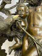With a melodic lullaby on her lips, the dryad serenades her child and the surrounding forest, filling the air with a sense of peace and serenity. As she succumbs to slumber, a majestic eagle gracefully descends, unfurling its wings to create a protective canopy over the mother and child. Every intricate detail of this sculpture has been meticulously crafted, showcased through a stunning combination of a rich brown patina and delicate gold highlights, enhancing the lifelike beauty of the dryad, her child, and the eagle.