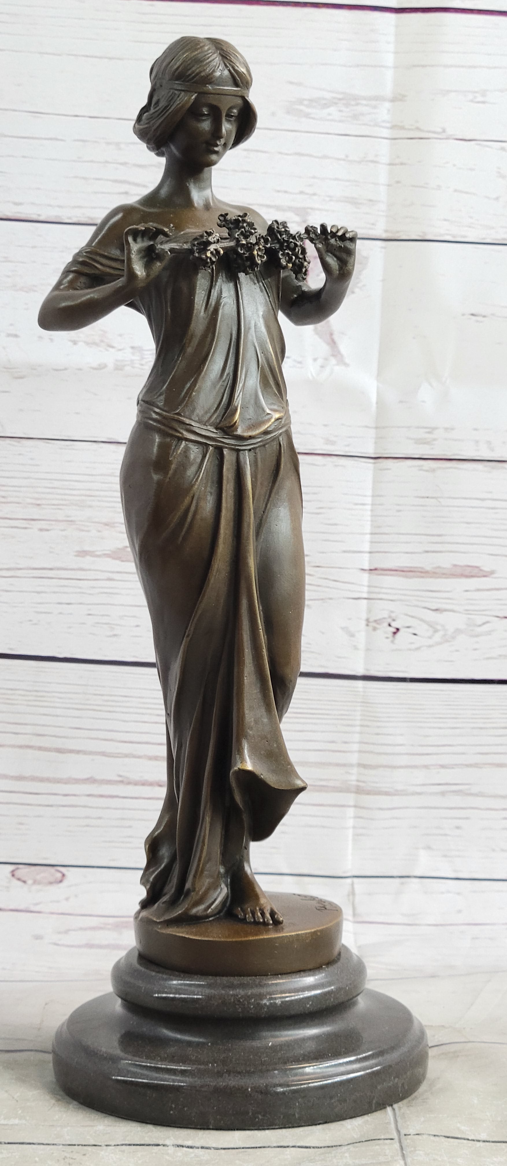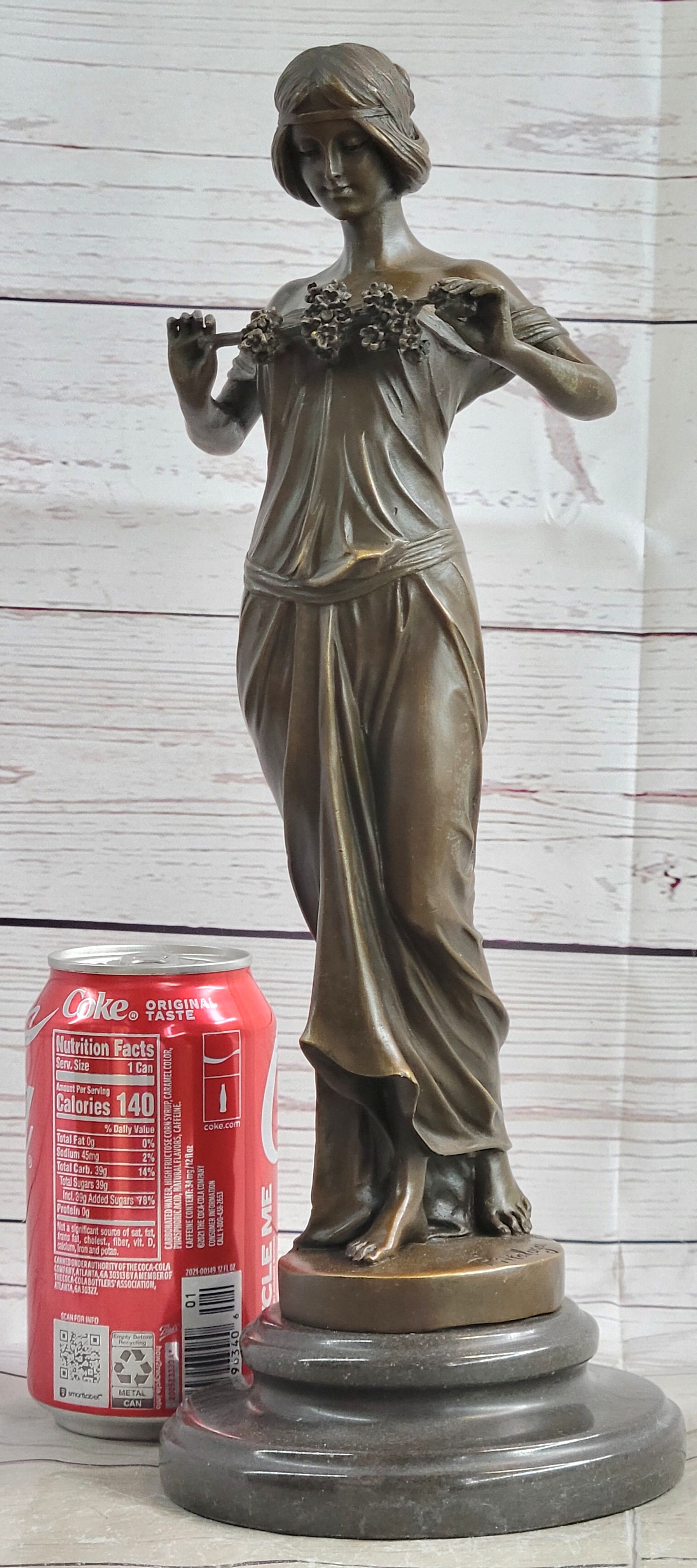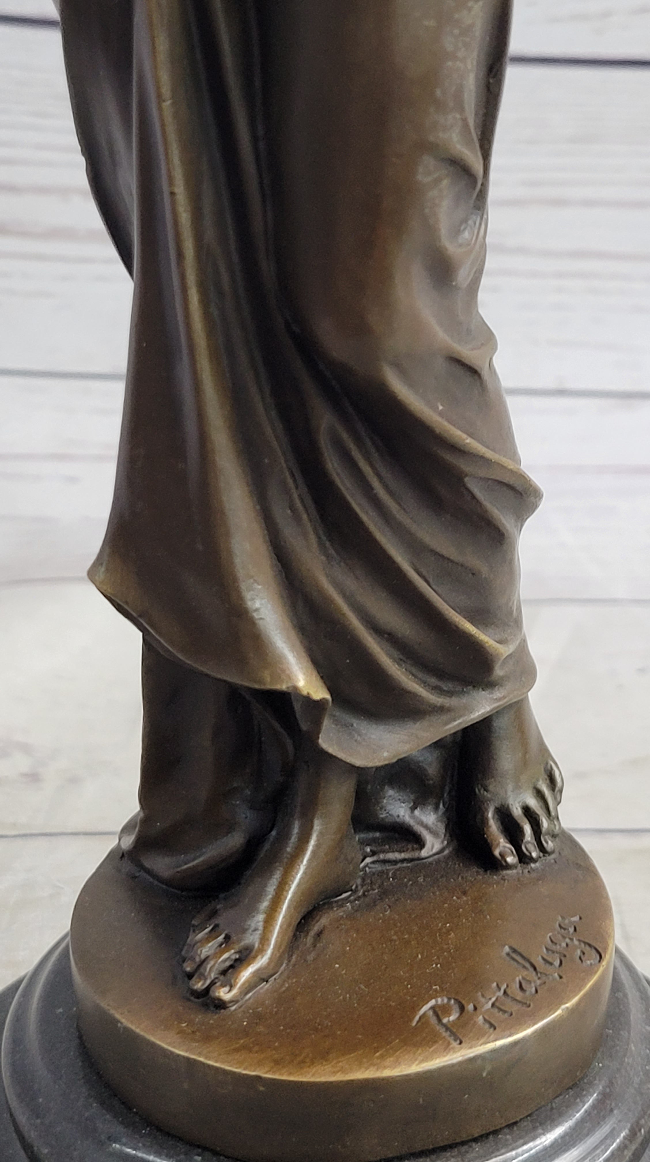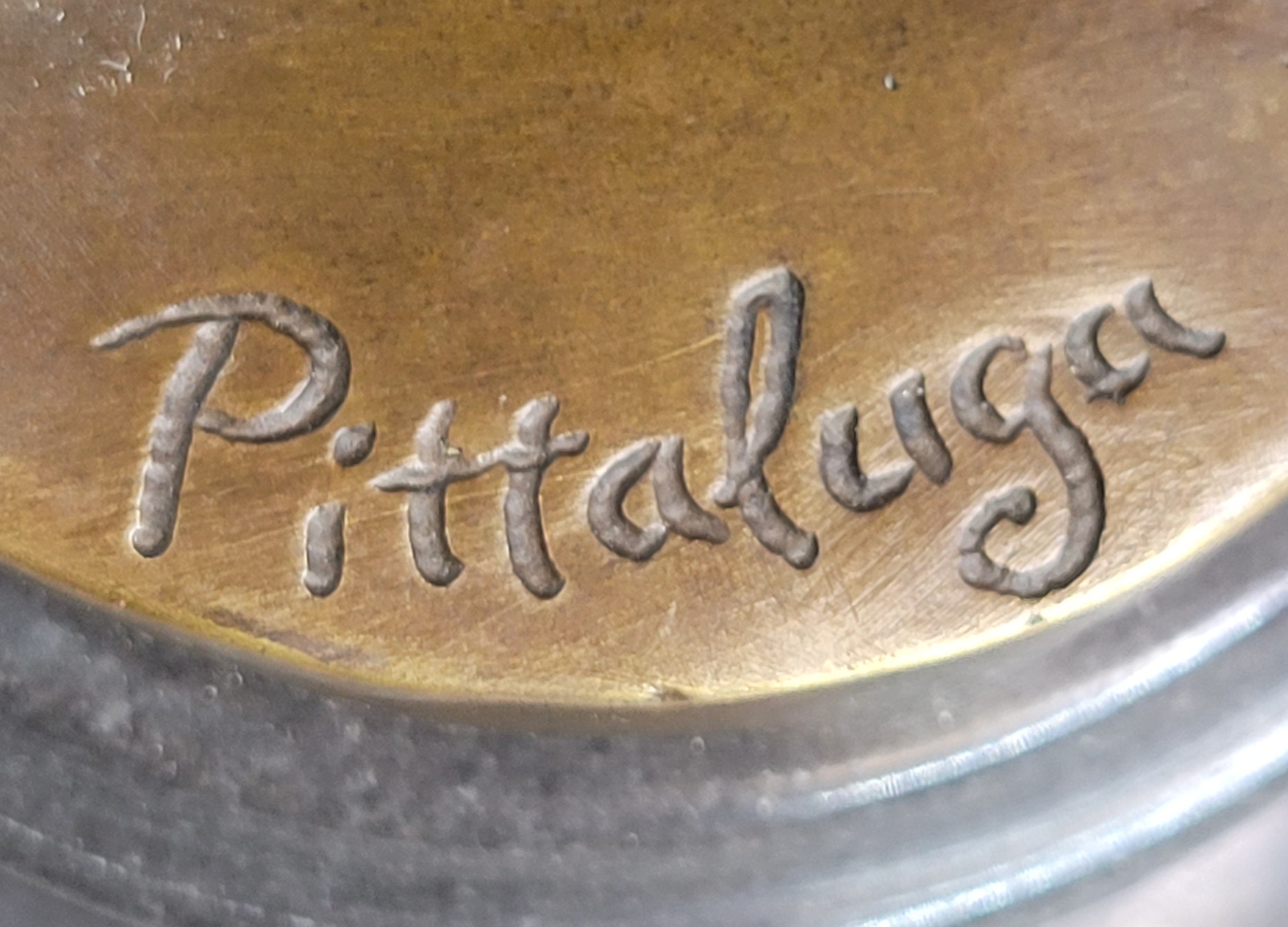 "Nymph of the Woods" (1915) by Pittaluga is a captivating sculpture that transports viewers to the tranquil beauty of the Italian countryside. This exquisite figurine captures the essence of Art Nouveau aesthetics, with the graceful lines of the maiden's headdress and the flowing gown that adorns her slender figure. Pittaluga's attention to detail brings the sculpture to life, evoking a sense of timeless romance and natural elegance. Crafted exclusively for European Bronze Finery, "Nymph of the Woods" is a masterpiece of bronze sculpture. The meticulous craftsmanship and intricate detailing are evident in every aspect of the artwork, from the delicate features of the maiden's face to the soft drape of her gown. Created using the ancient "Lost Wax Method," this sculpture exemplifies the enduring beauty and artistic excellence of traditional bronze casting techniques. Mounted on a marble base, this sculpture is not only a stunning work of art but also a testament to the skill and creativity of the artist Pittaluga. His signature adds a touch of quality and prestige to the piece, ensuring its value as a prized possession for collectors and art enthusiasts alike. "Nymph of the Woods" invites viewers to immerse themselves in its enchanting beauty and to appreciate the timeless allure of Art Nouveau sculpture.