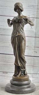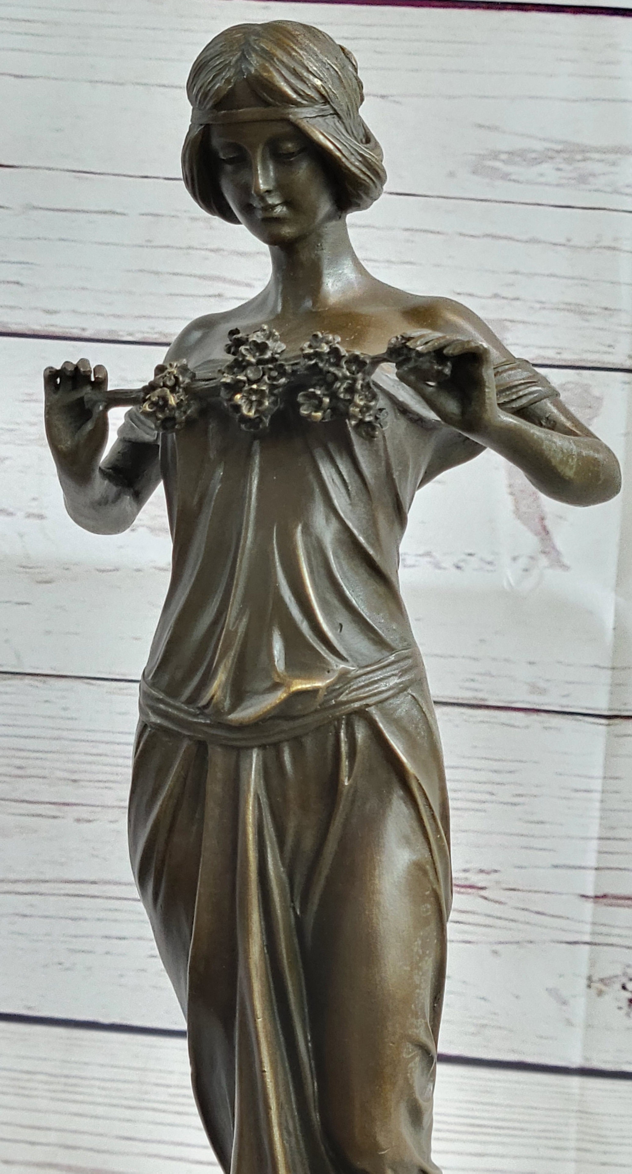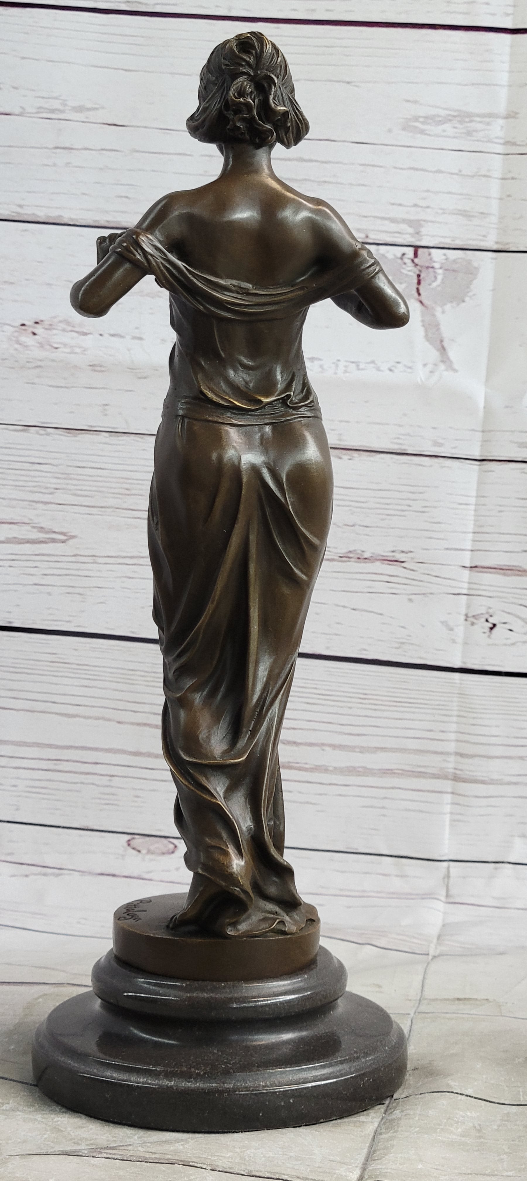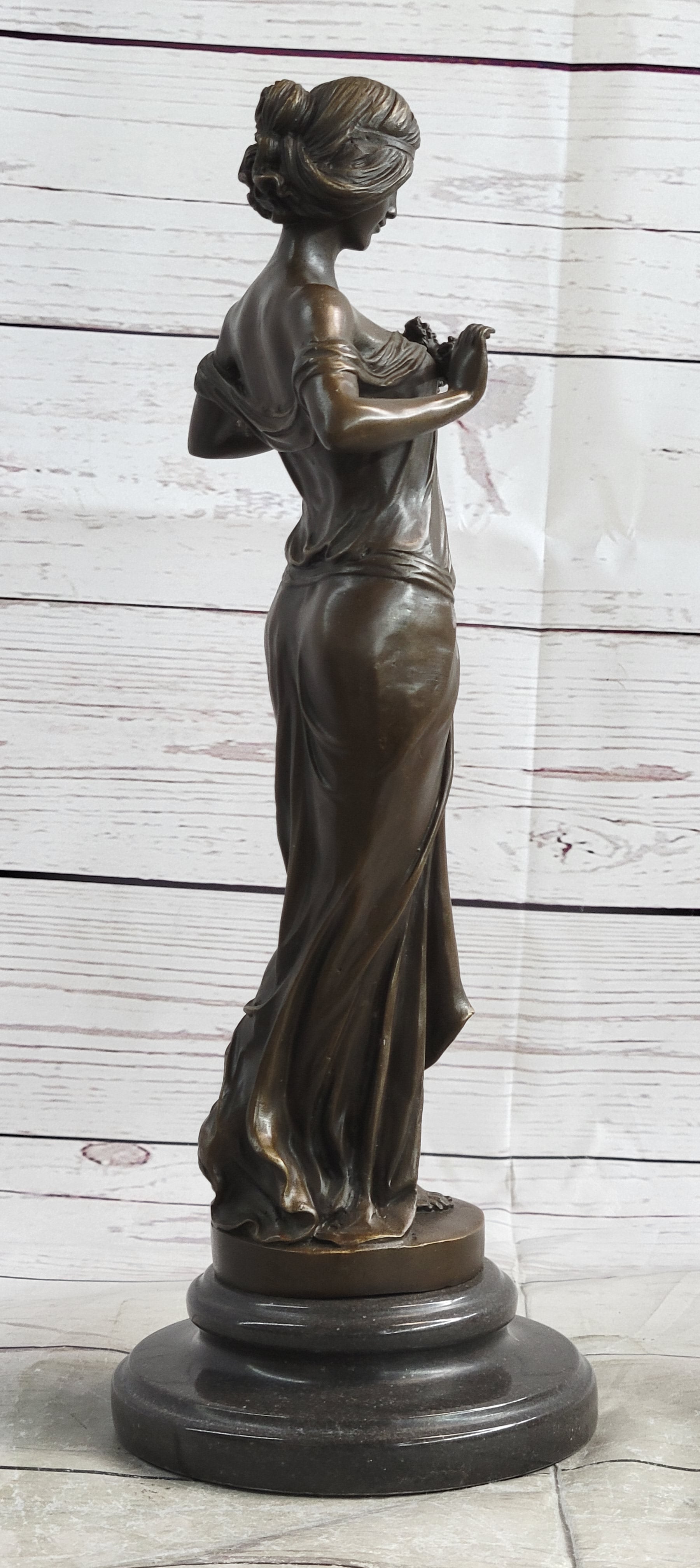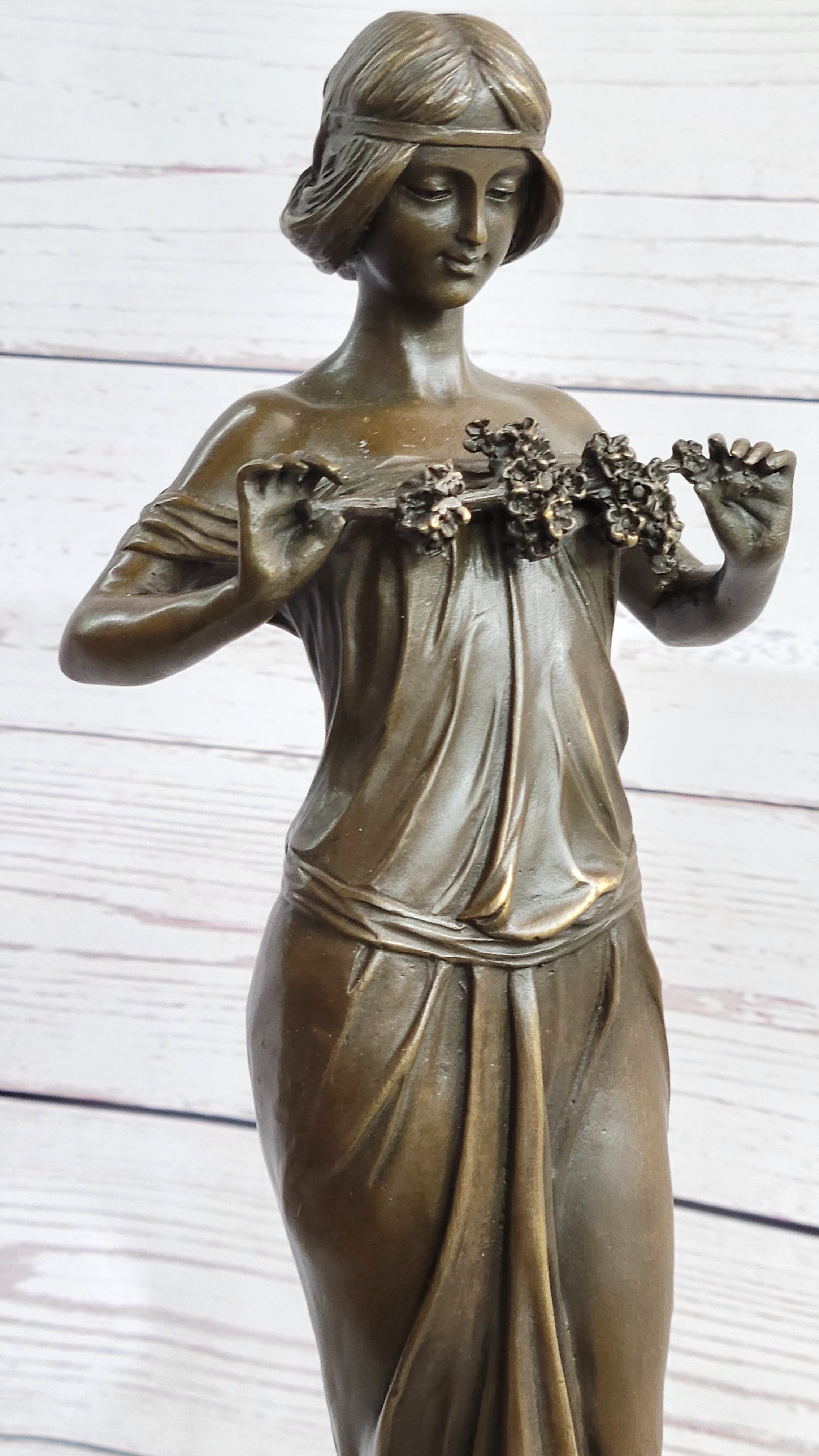 "Nymph of the Woods" (1915) by Pittaluga is a captivating sculpture that transports viewers to the tranquil beauty of the Italian countryside. This exquisite figurine captures the essence of Art Nouveau aesthetics, with the graceful lines of the maiden's headdress and the flowing gown that adorns her slender figure. Pittaluga's attention to detail brings the sculpture to life, evoking a sense of timeless romance and natural elegance. Crafted exclusively for European Bronze Finery, "Nymph of the Woods" is a masterpiece of bronze sculpture. The meticulous craftsmanship and intricate detailing are evident in every aspect of the artwork, from the delicate features of the maiden's face to the soft drape of her gown. Created using the ancient "Lost Wax Method," this sculpture exemplifies the enduring beauty and artistic excellence of traditional bronze casting techniques. Mounted on a marble base, this sculpture is not only a stunning work of art but also a testament to the skill and creativity of the artist Pittaluga. His signature adds a touch of quality and prestige to the piece, ensuring its value as a prized possession for collectors and art enthusiasts alike. "Nymph of the Woods" invites viewers to immerse themselves in its enchanting beauty and to appreciate the timeless allure of Art Nouveau sculpture.