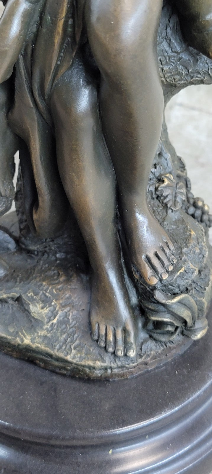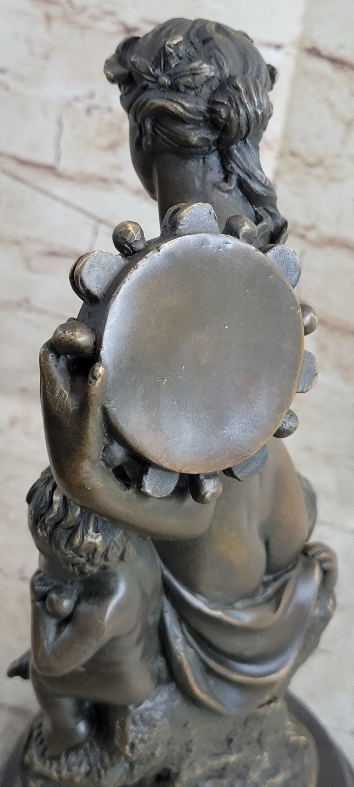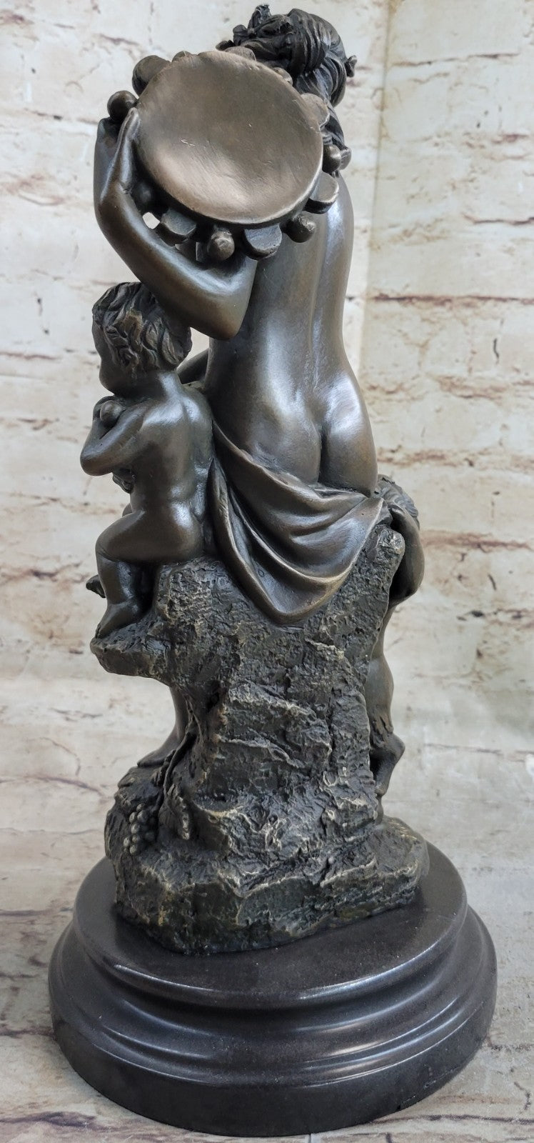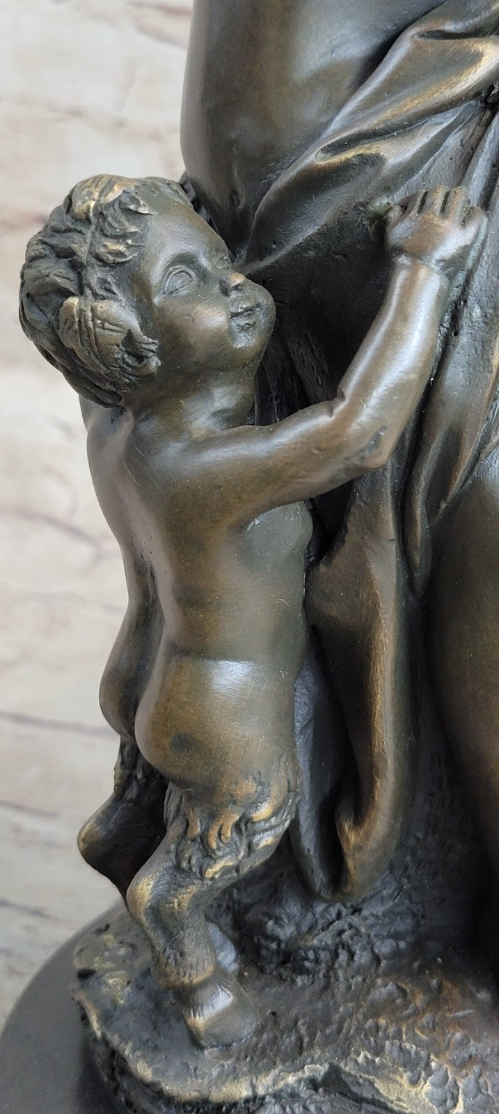 A beautiful natural woman rests outside with her young children. The joyful babies are at her side lovingly close to her. She is attentive to the both them in a way a great mother is. The sculpture is a natural mythical pure essence. One of the children is a mythical half-goat half-human hybrid. This sculpture was crafted using the lost wax method. It stands on a black marble base and is signed by artist Milo.Bronze Dimensions with Marble Base:Height 13 1/2" x Width 6 1/2"