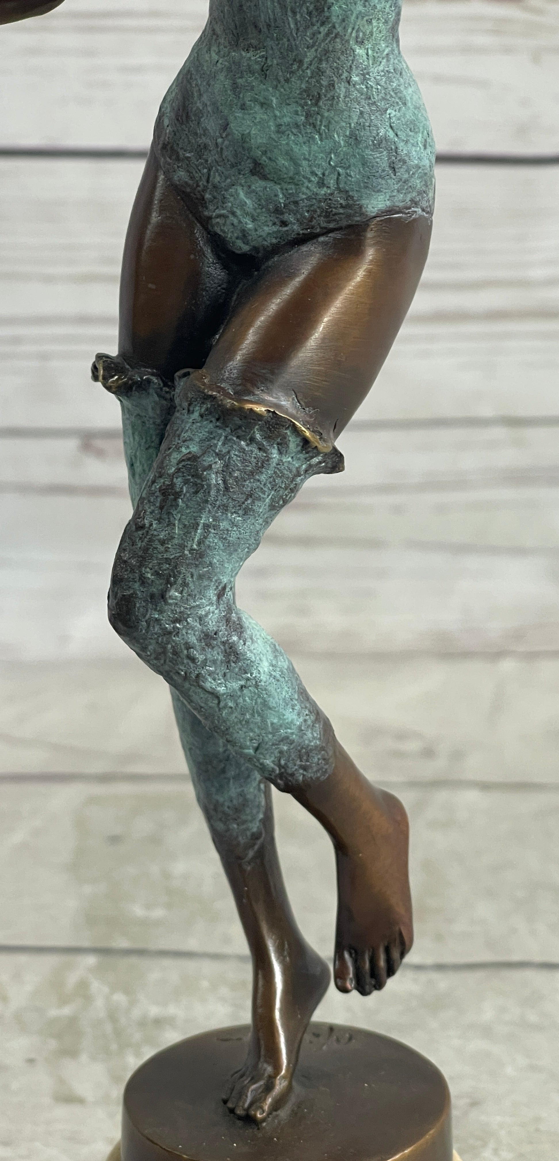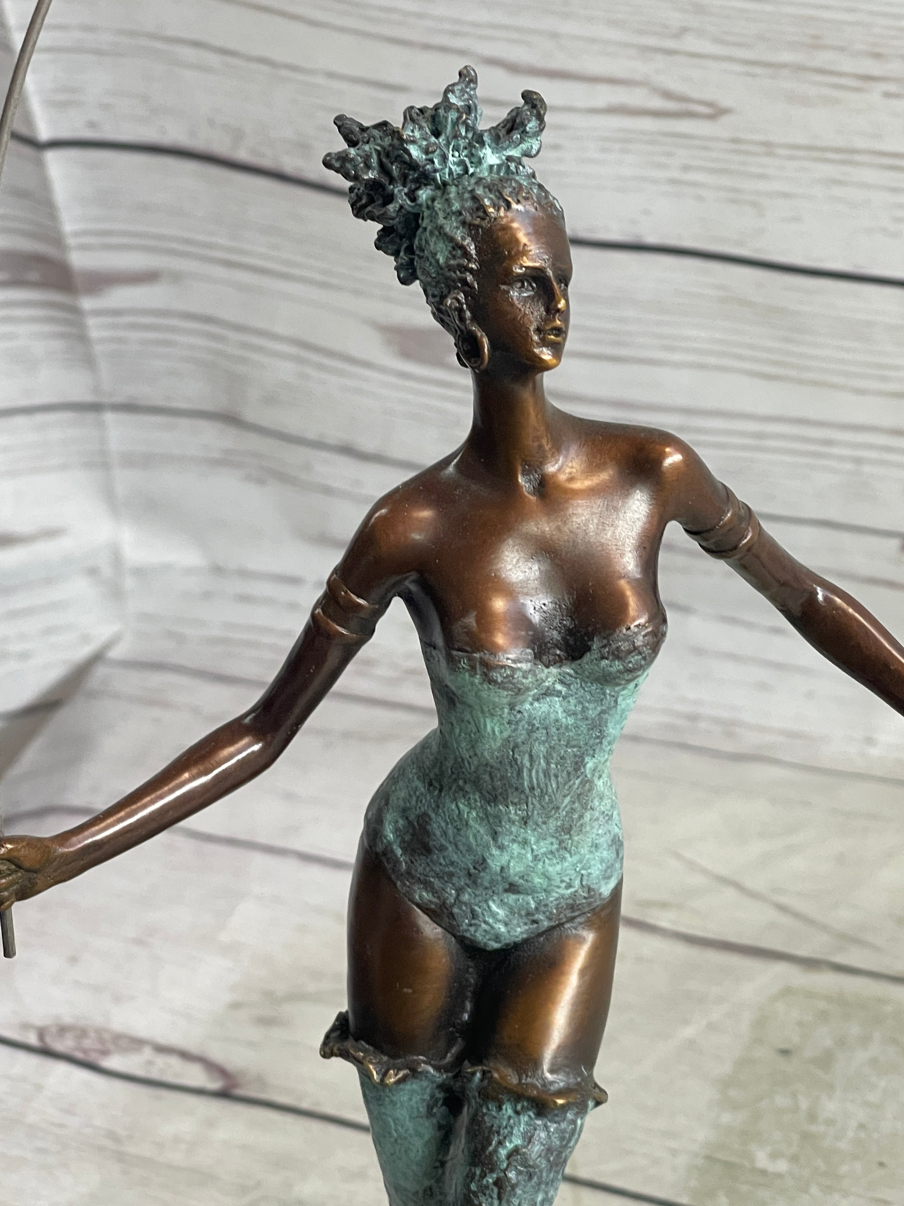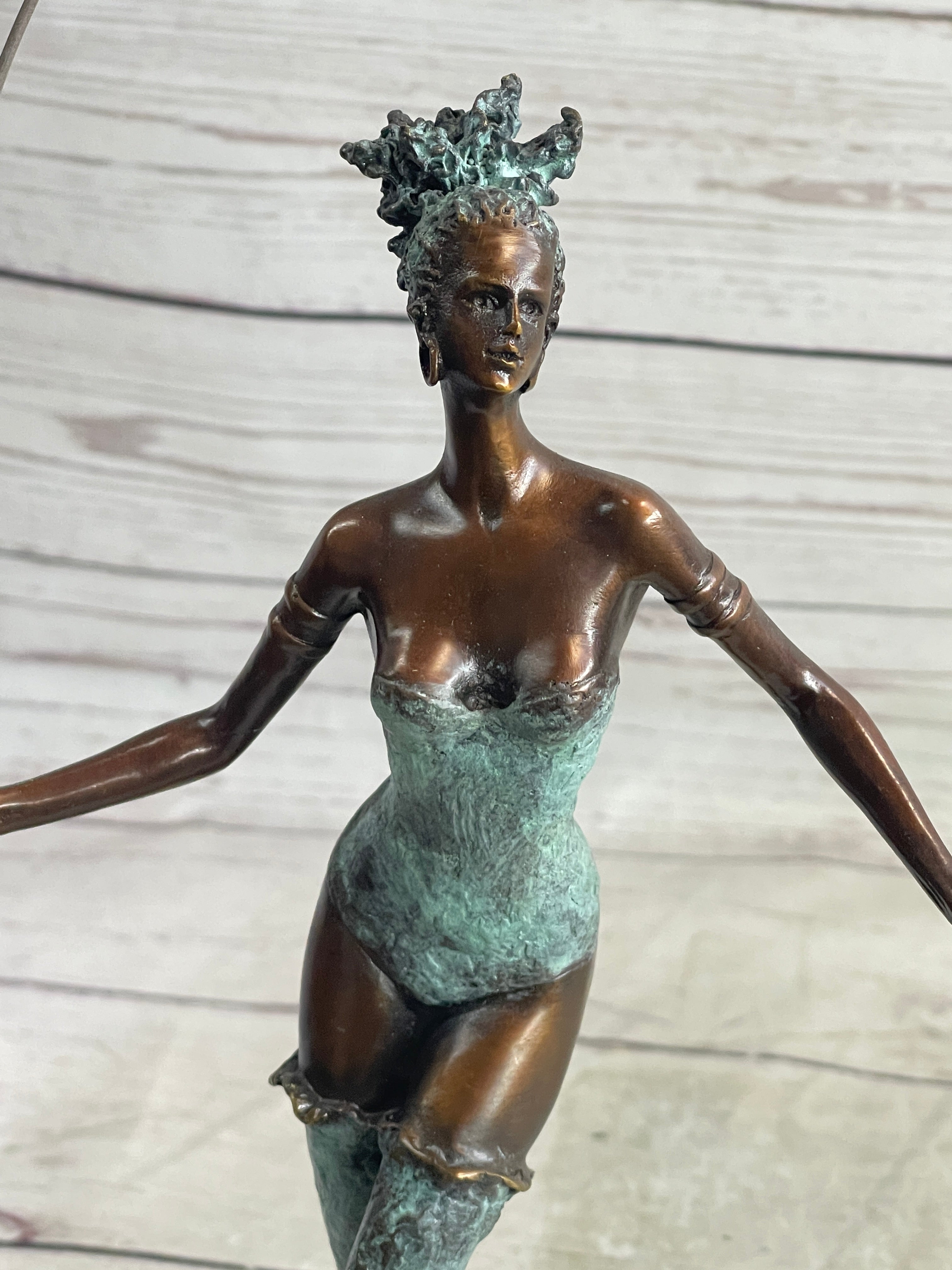 Her curly hair bounces in rhythm with her movements, adding an extra element of dynamism to her performance. Dressed in a stunning green patina bodice-fitting suit and matching leggings, she exudes elegance and style. This nimble dancer is beautifully captured in a brown patina sculpture, skillfully mounted on a sleek black marble base.