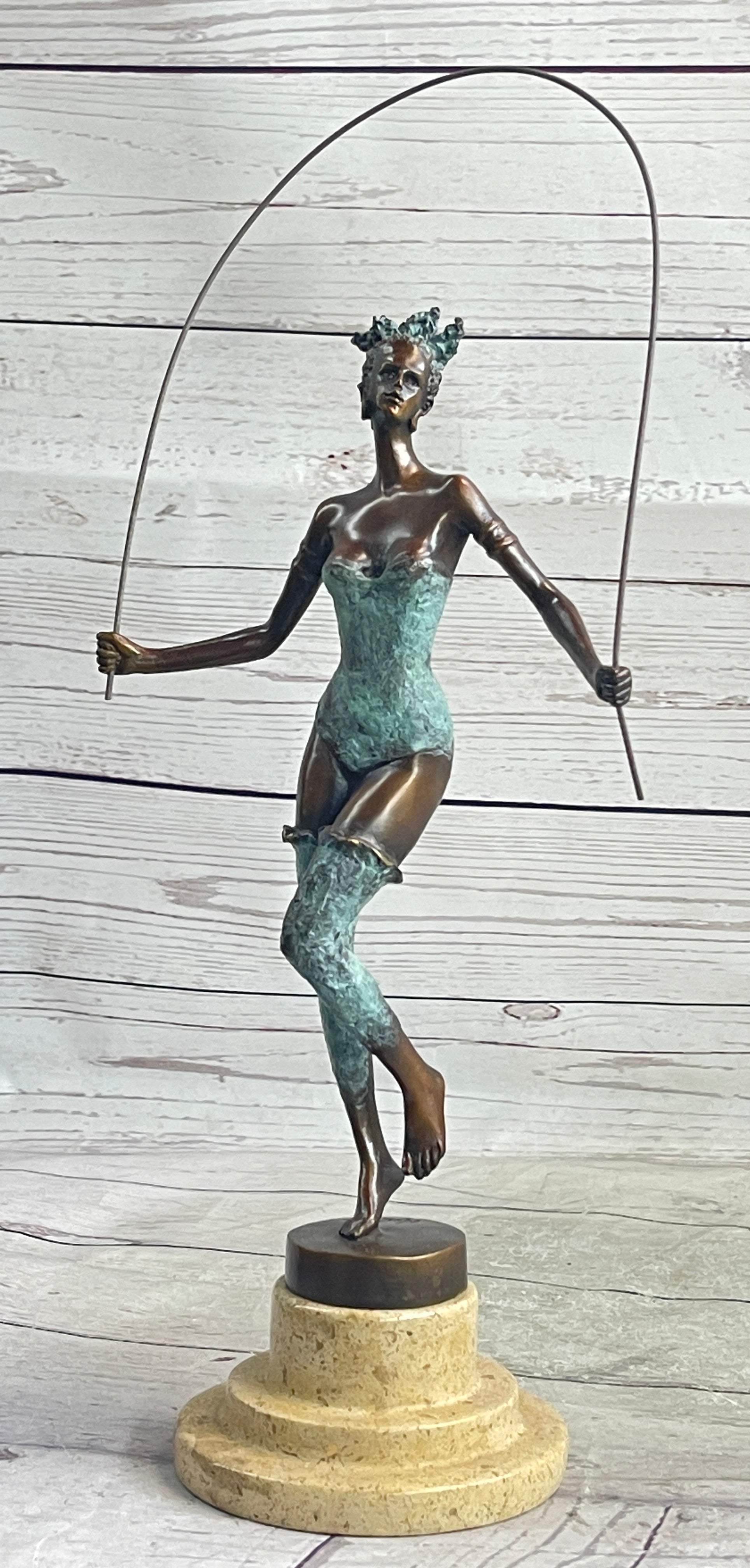 Experience the mesmerizing performance of this bronze dancer as she effortlessly moves across the stage with grace and agility. With each step, she showcases her remarkable flexibility and acrobatic skills, captivating the audience with her lively presence. Using a half-gold metal hula hoop as a prop, she adds a touch of joviality to her performance, showcasing her playful spirit.