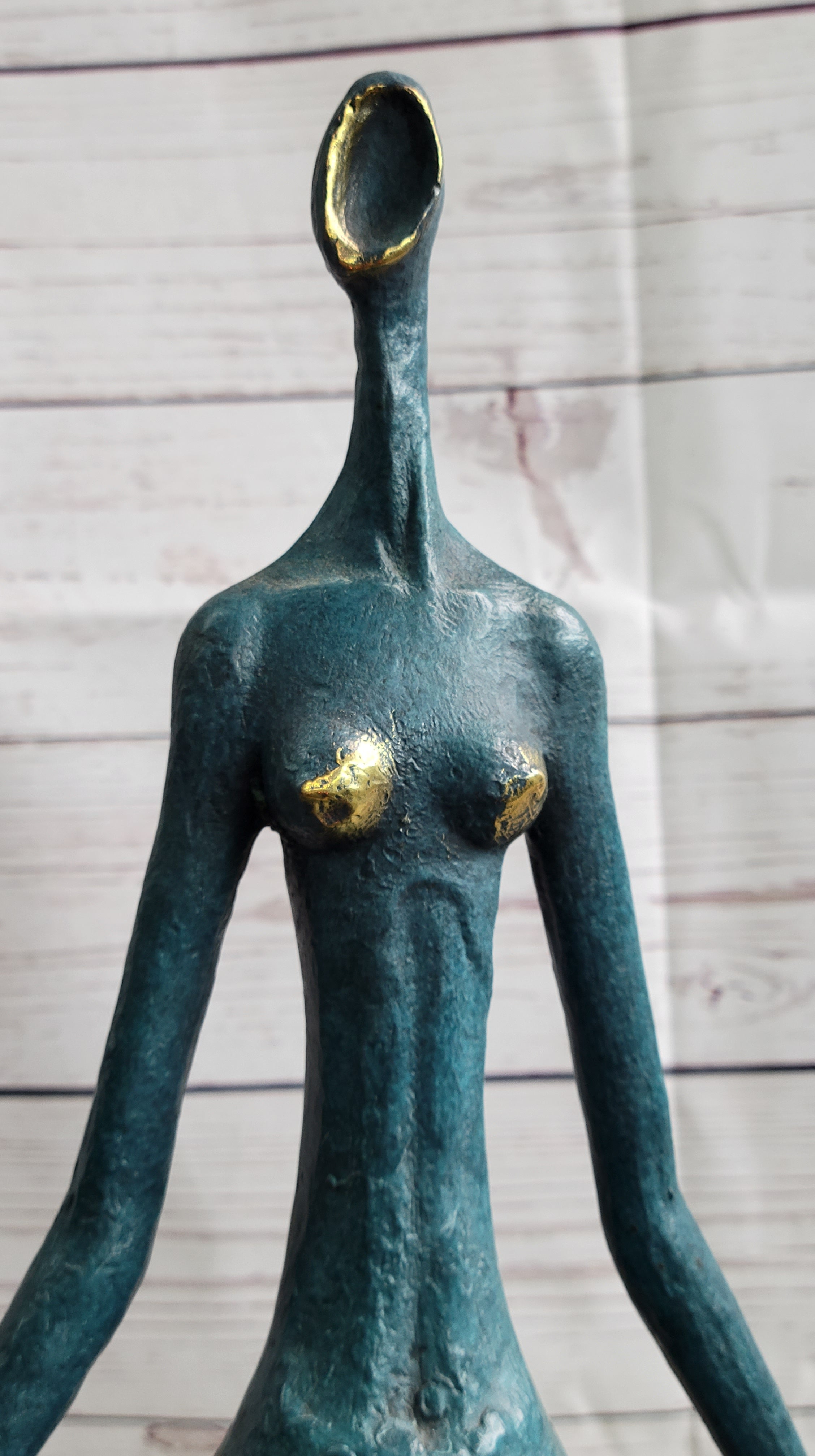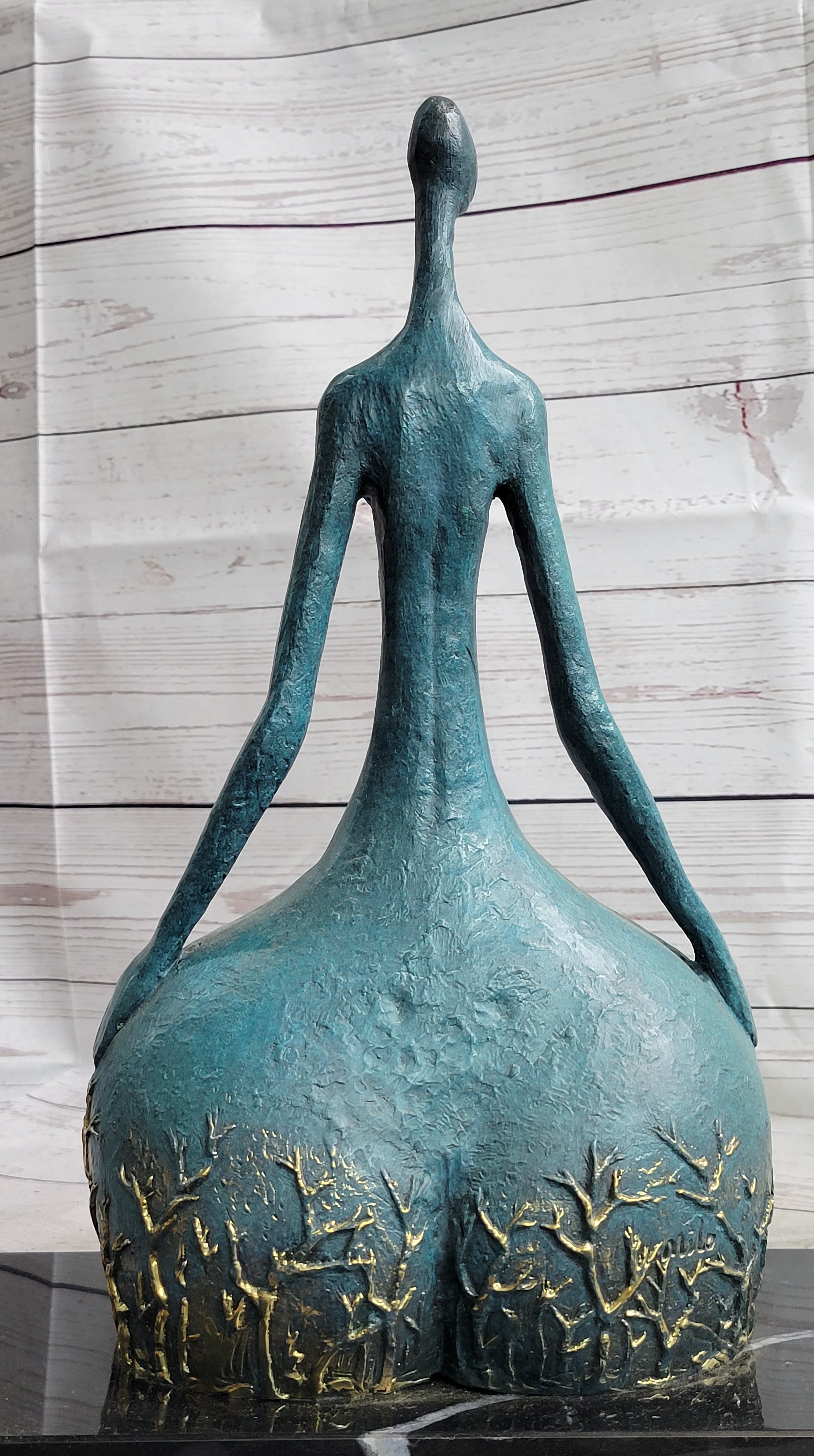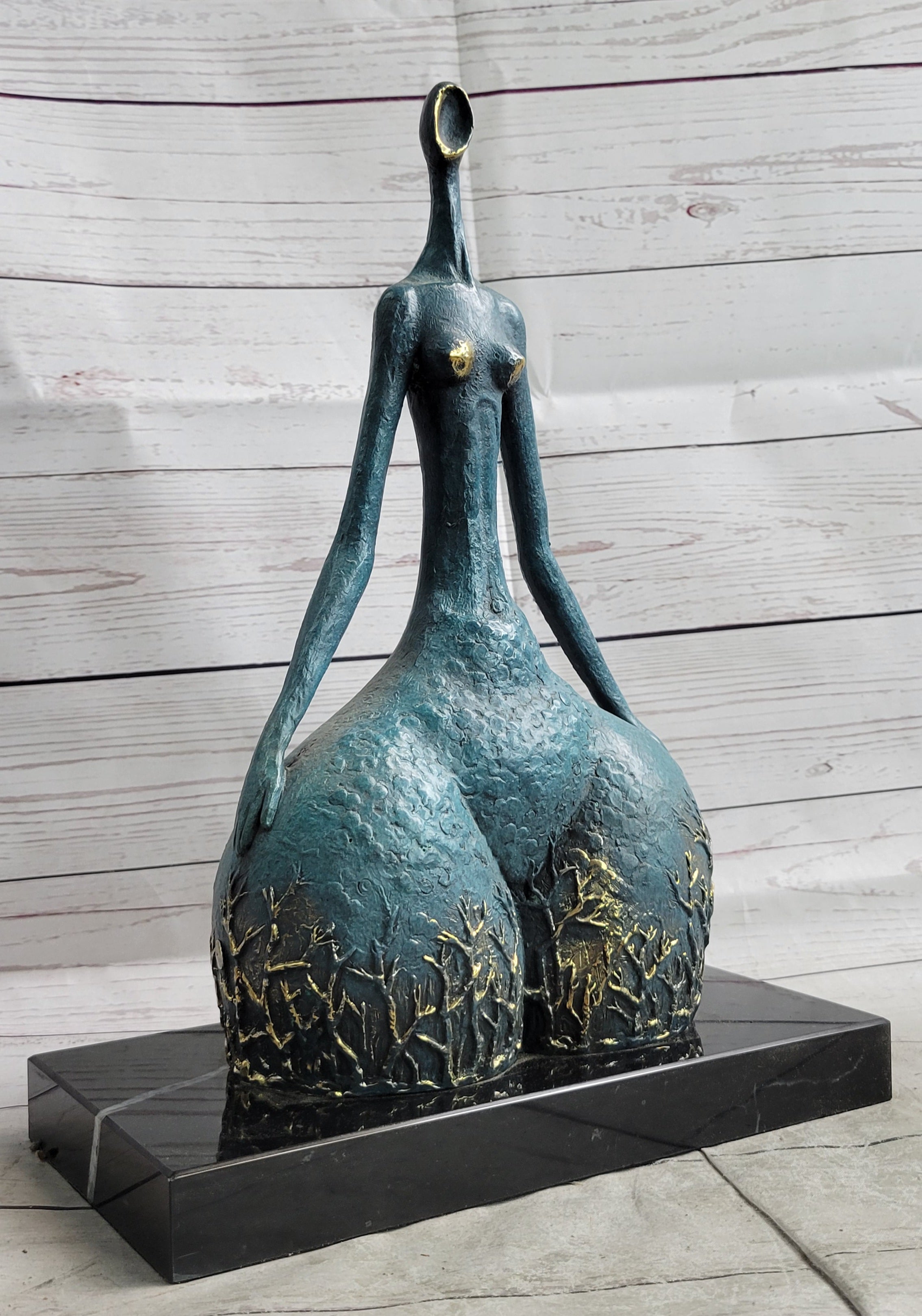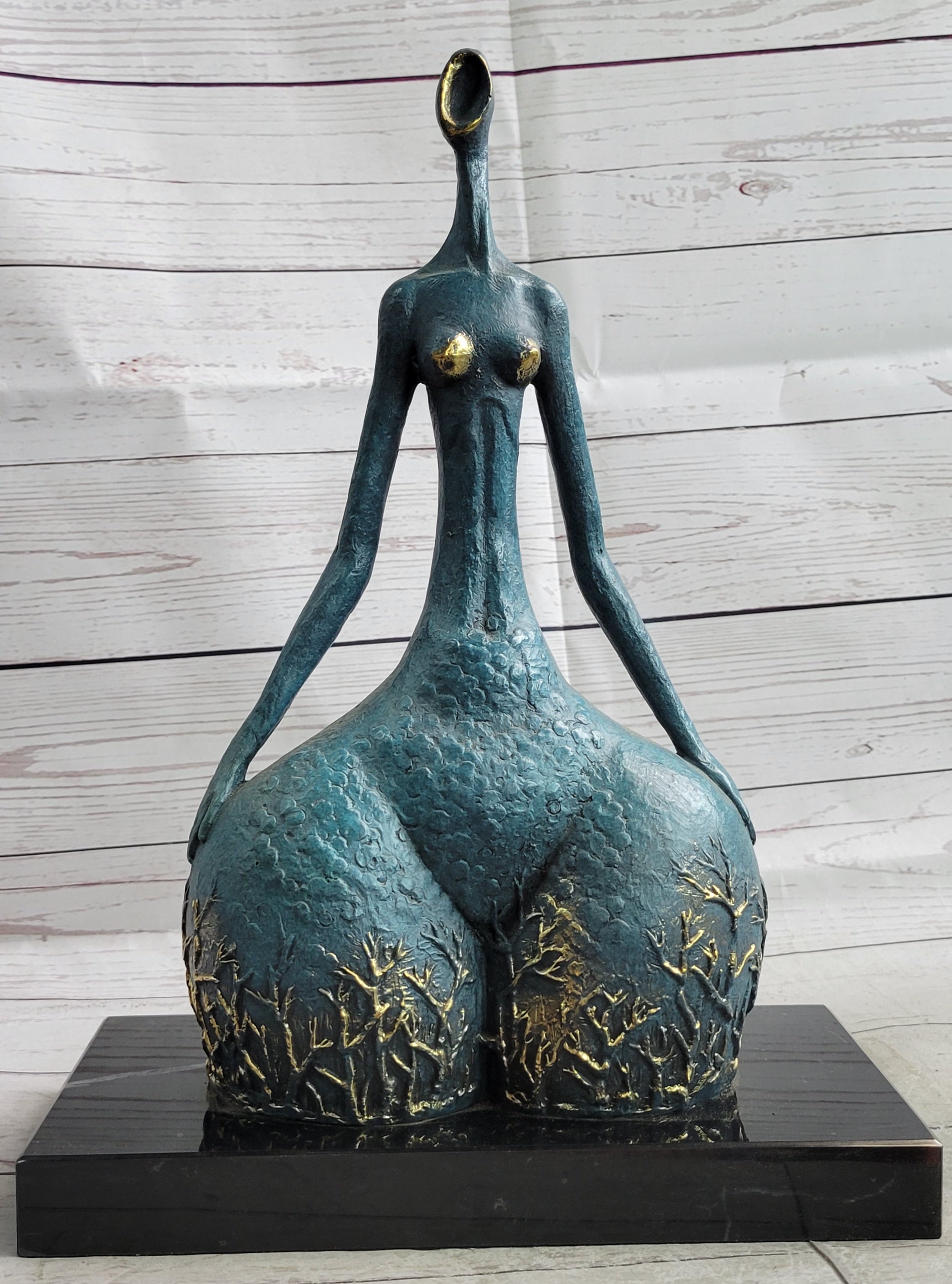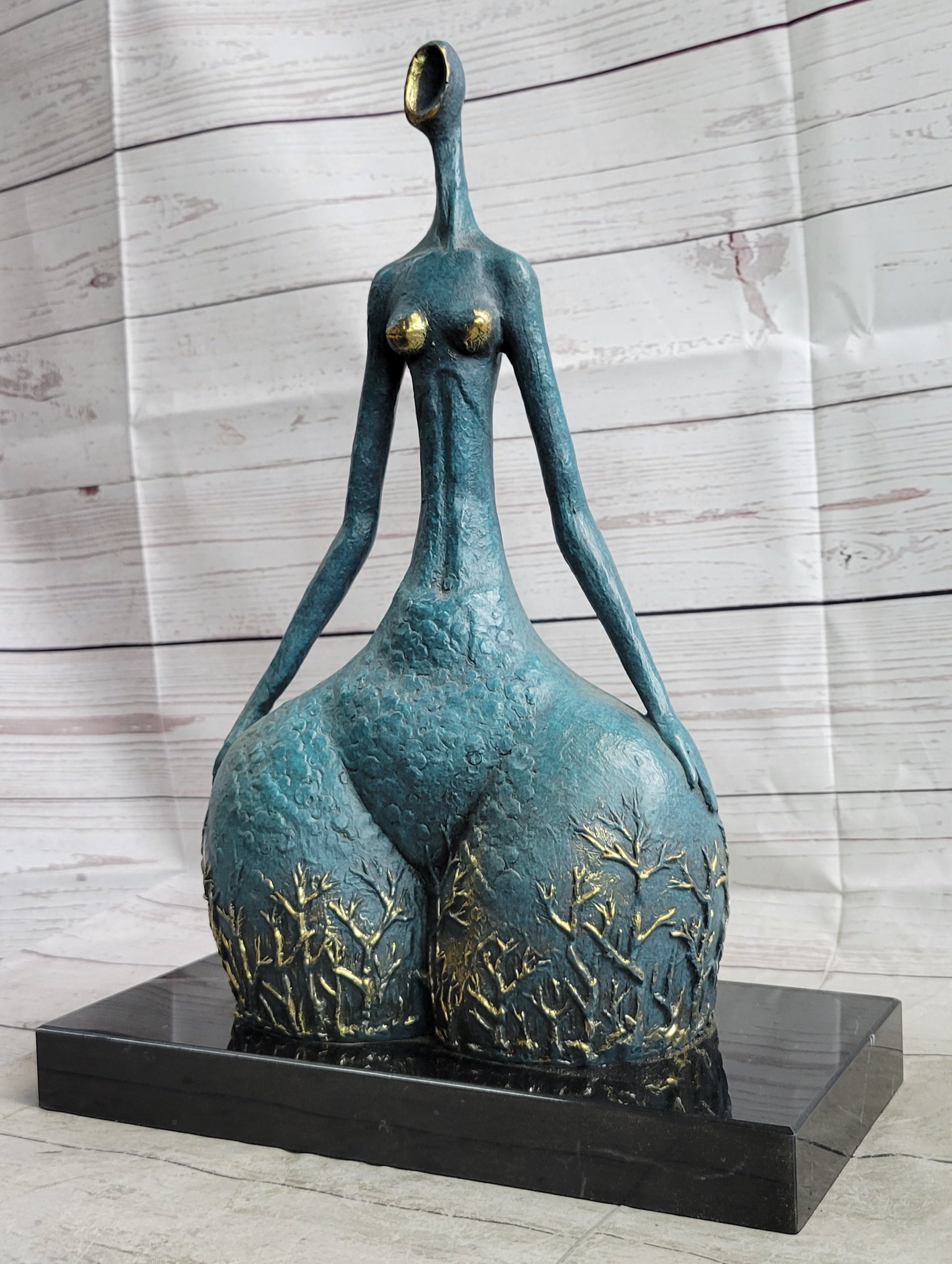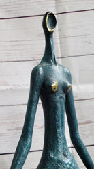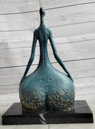 Sculpted in the abstract form of a female dancer, this captivating piece exudes an unmistakable sense of power and grace, evident in the sharpness and precision of her poised position. The sculpture beautifully accentuates the curvaceous contours that are often associated with feminine allure and fertility, emphasizing the timeless beauty and strength embodied by the female form. Crafted entirely from 100% bronze using the revered lost wax method, the sculpture stands as a testament to the enduring artistry and meticulous craftsmanship involved in its creation. Elevated on a sleek black marble base, this striking sculpture captures the essence of feminine strength and elegance, serving as a timeless tribute to the inherent power and grace of the female spirit.