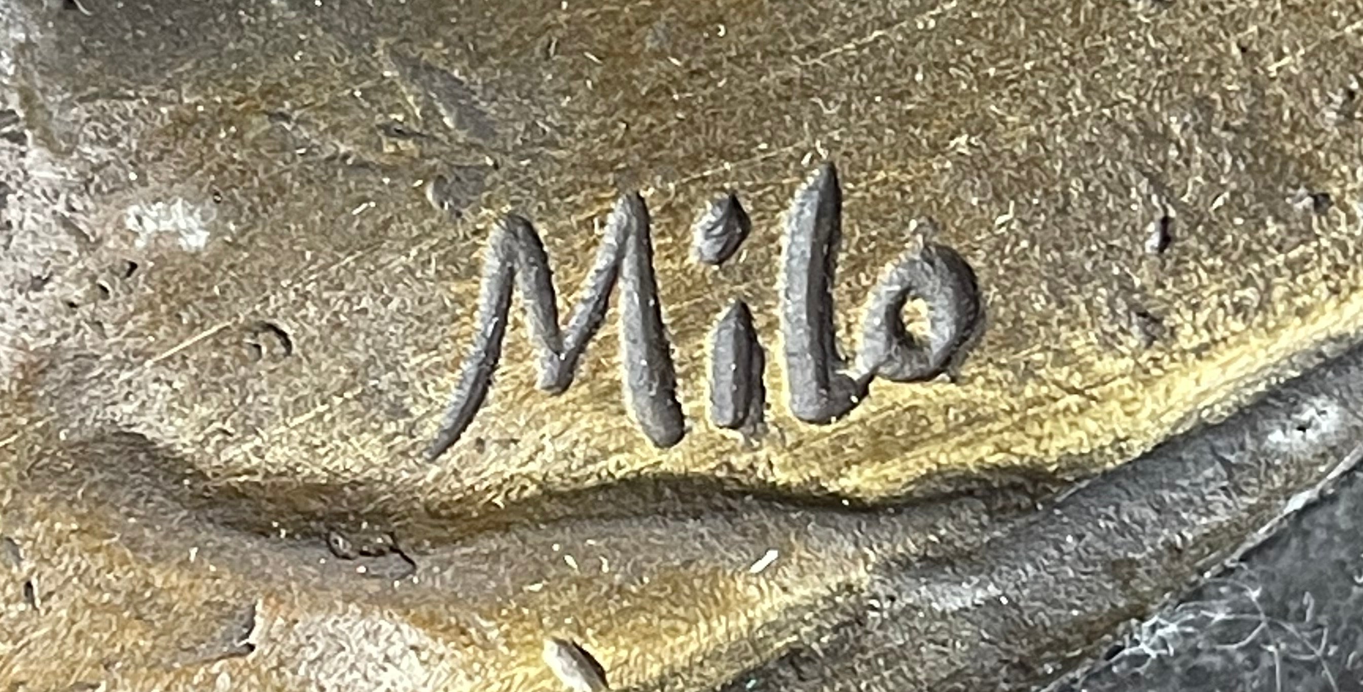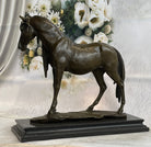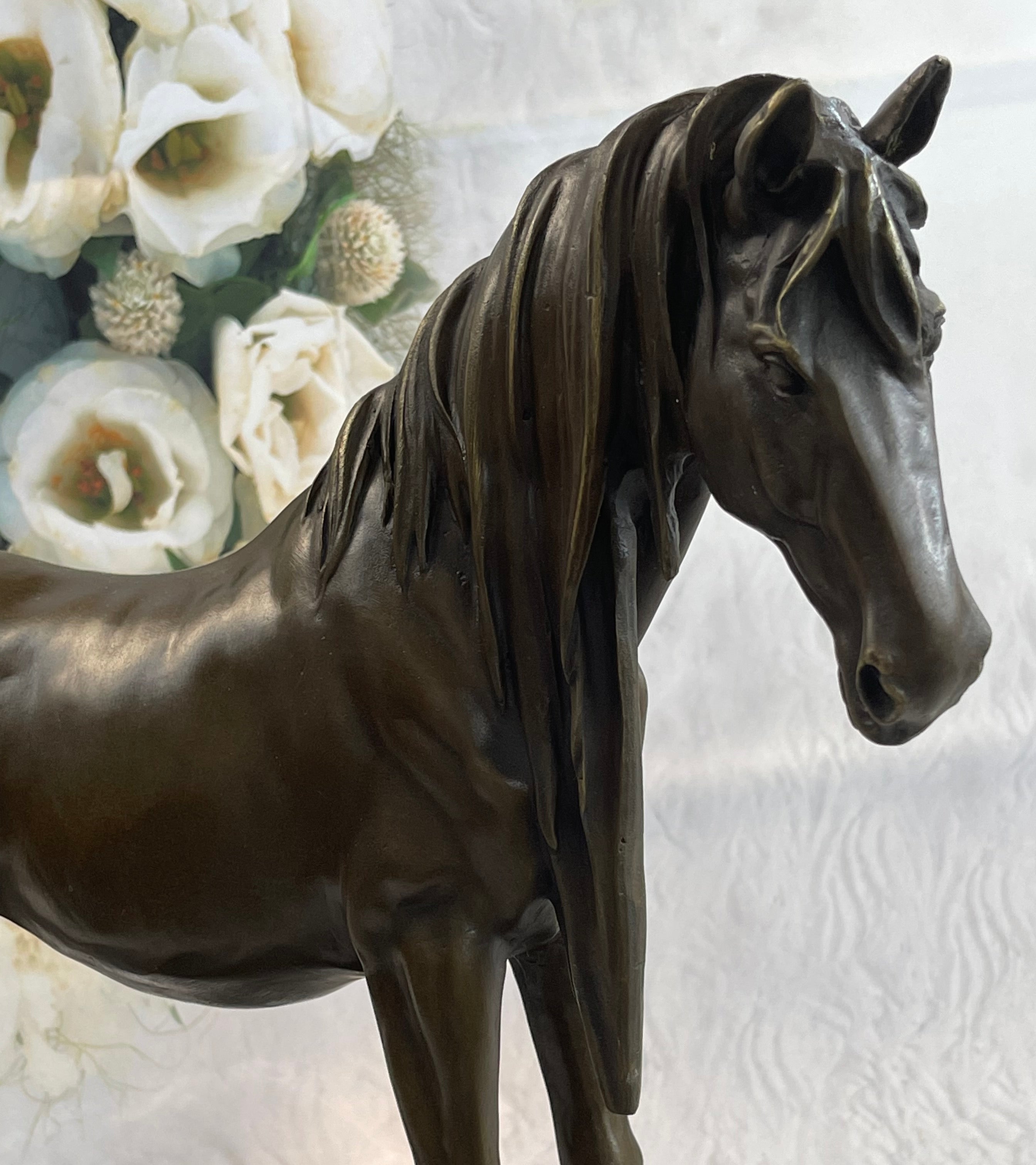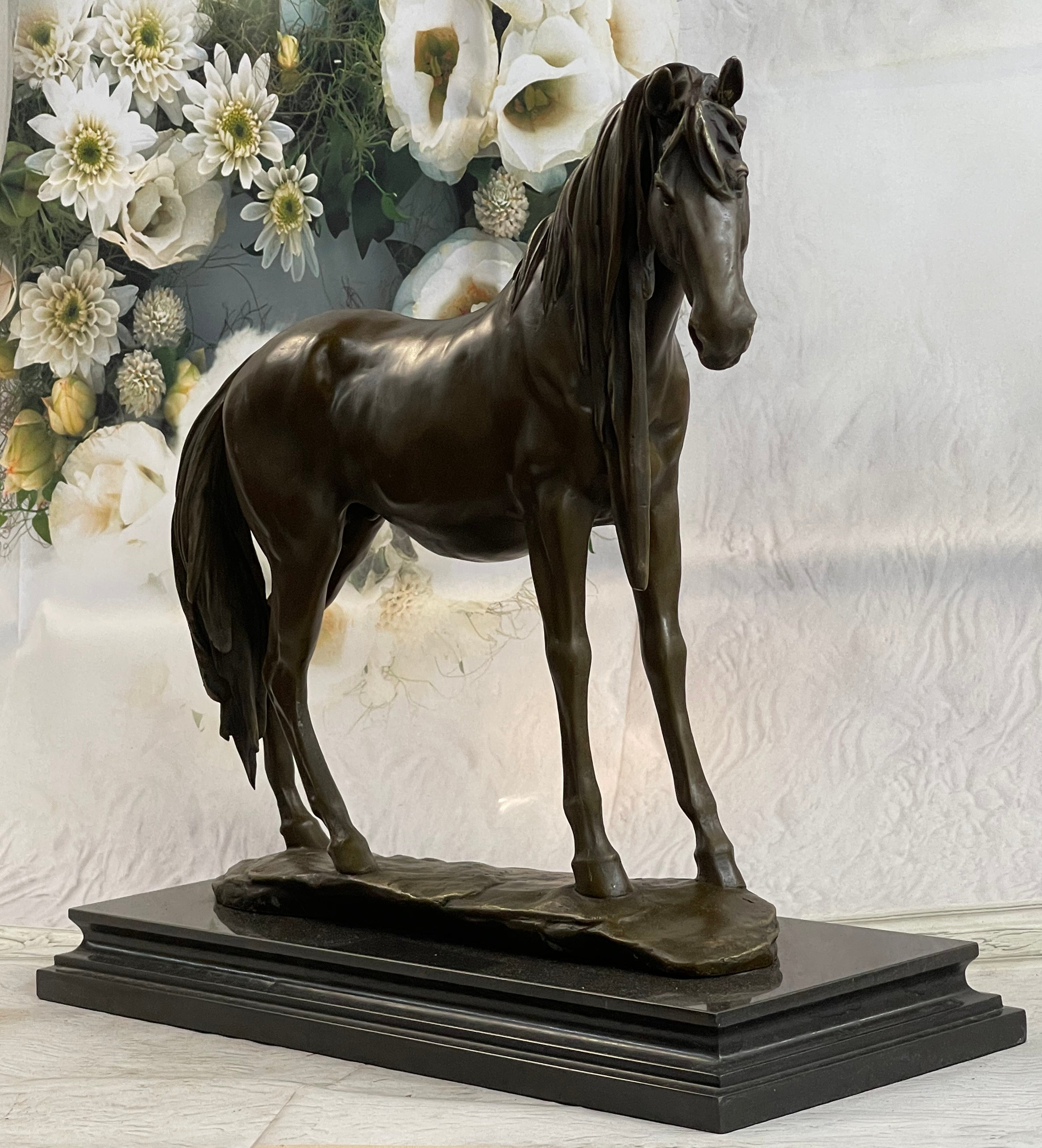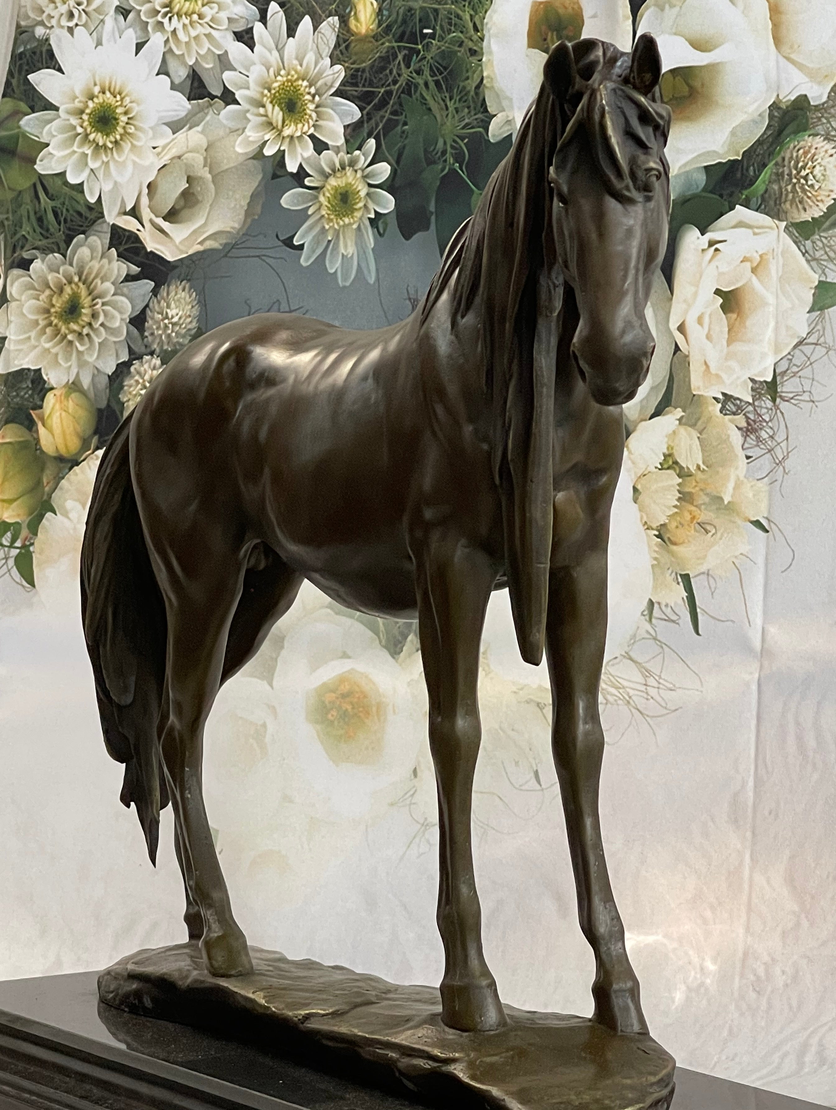 Resting on a sleek black marble base, the sculpture not only provides a stable foundation but also enhances the visual impact of the artwork. The piece is signed by Milo, a skilled artist known for his ability to convey the essence of animals through bronze sculptures. Whether displayed in a home or office, the "Feral Horse" sculpture serves as a timeless tribute to the untamed spirit of these magnificent creatures.Bronze Dimensions with Marble Base: Height 16" X Width 18"