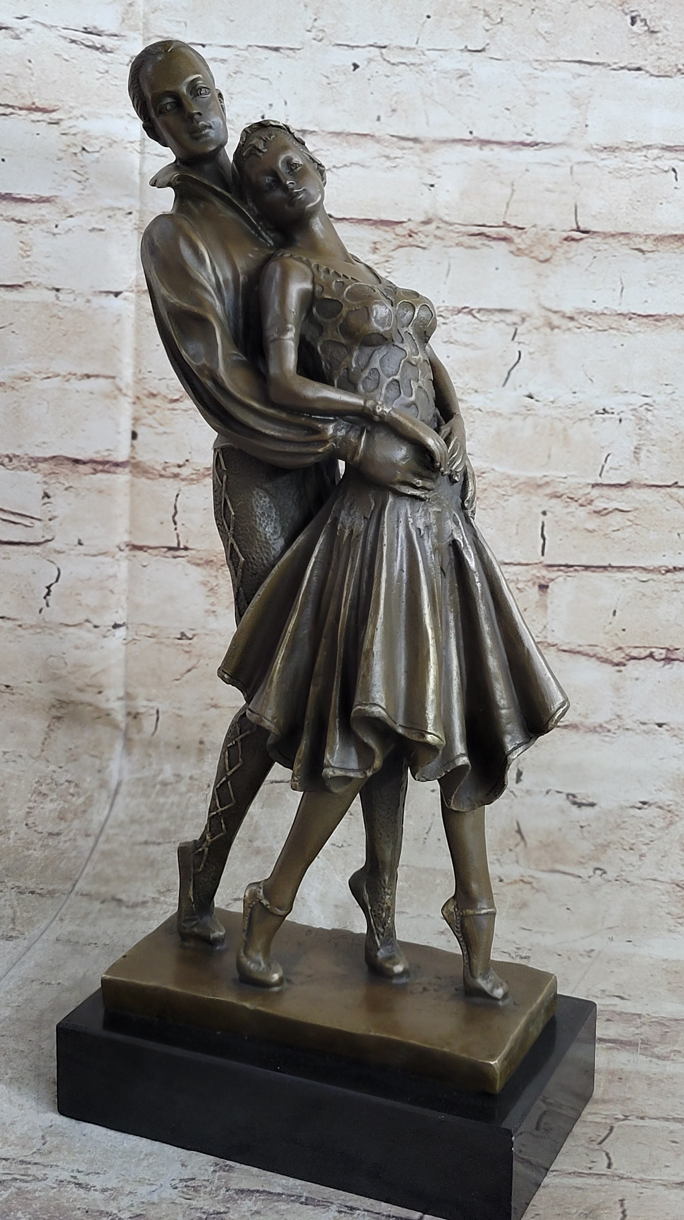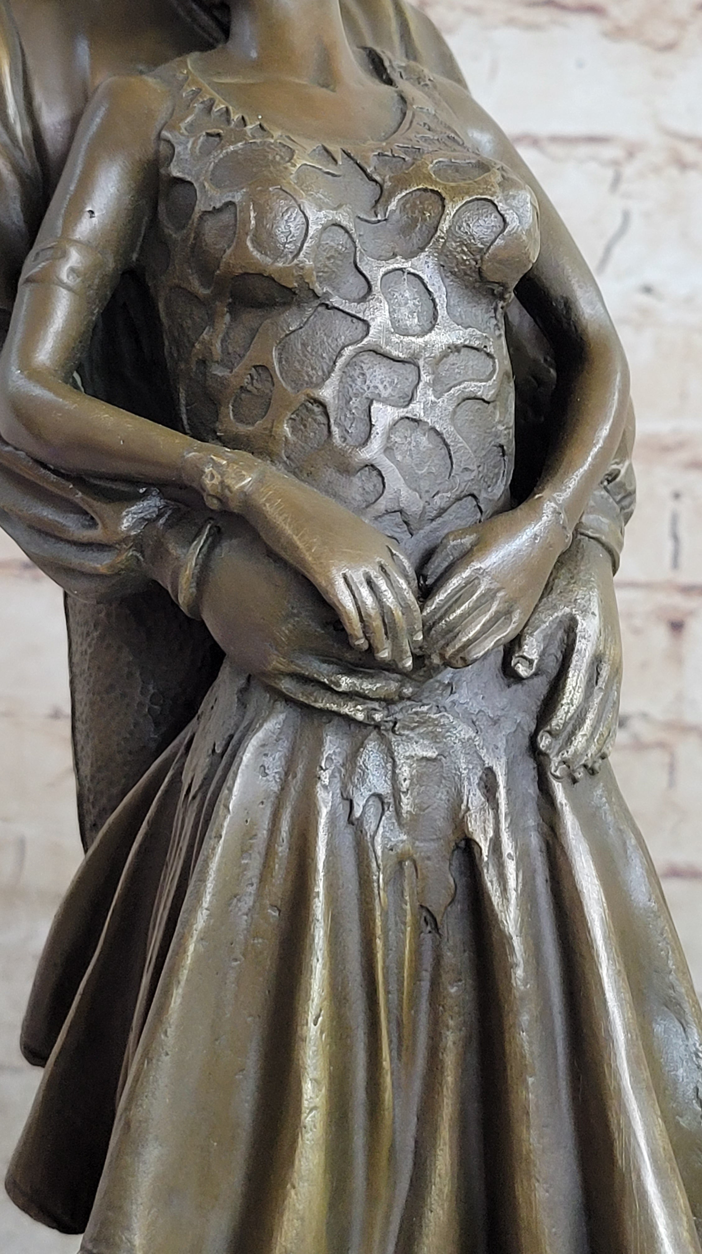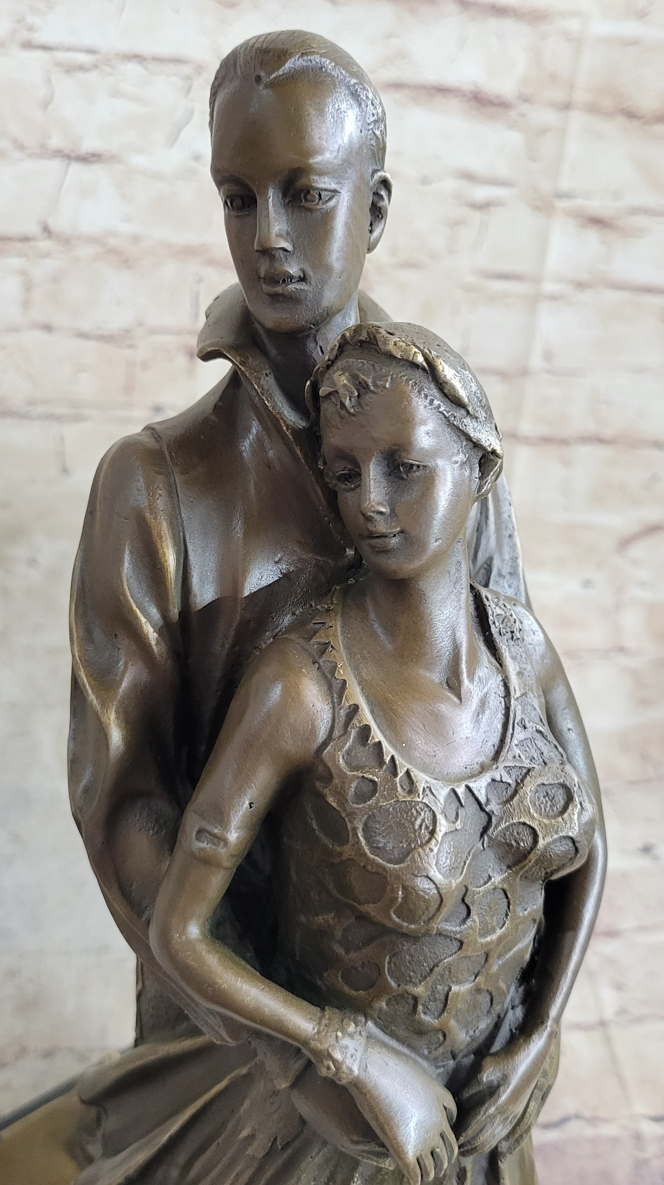 The artistry of this sculpture lies in the careful execution of every detail, from the delicate folds of her dress to the poised grace of their dance posture. The lost-wax casting method used in creating this piece ensures the highest quality and durability, while the brown patina finish adds a layer of preservation and antiquity. The subtle yet expressive features of the couple convey a sense of movement and emotion, making the sculpture come alive.