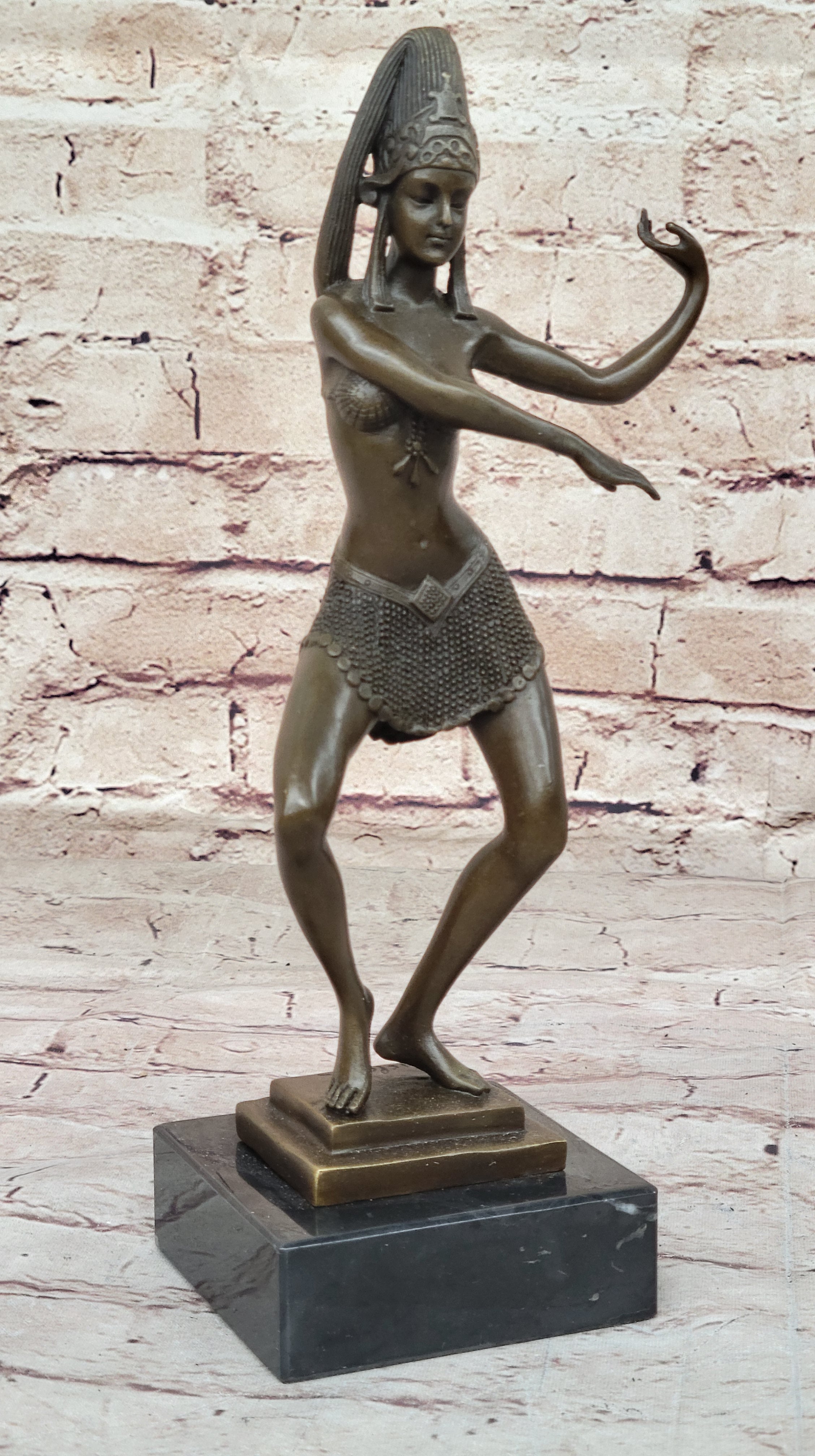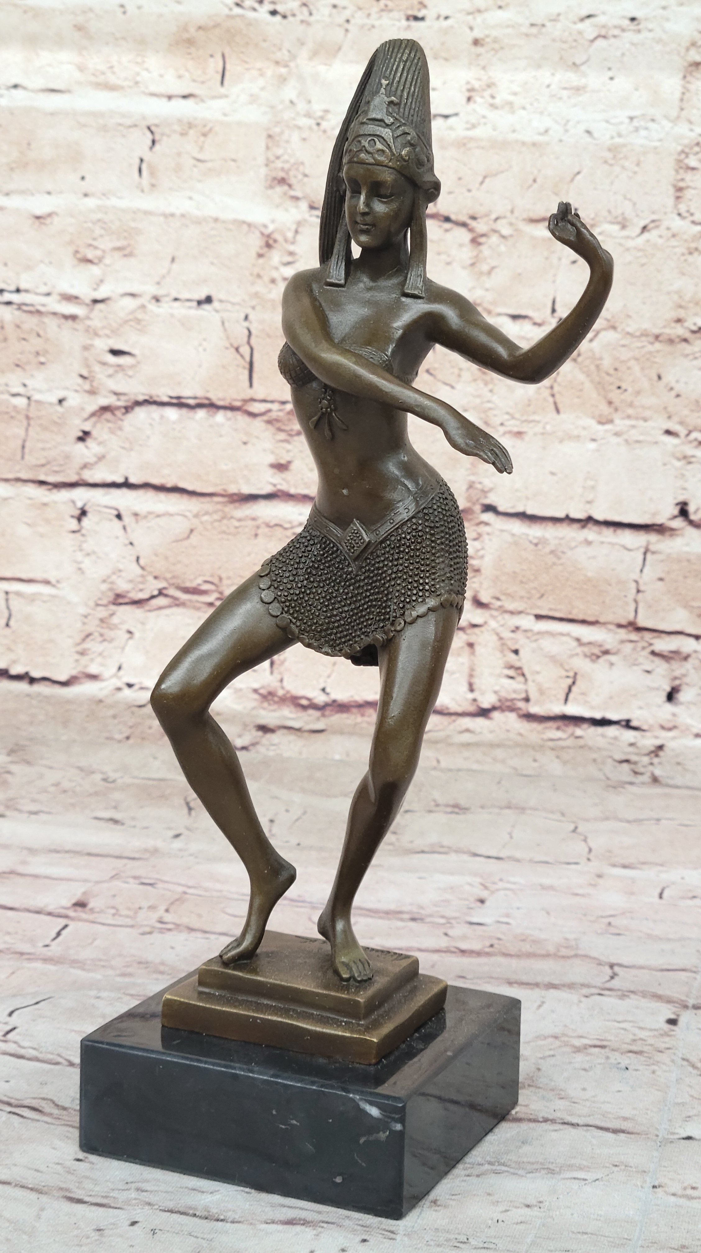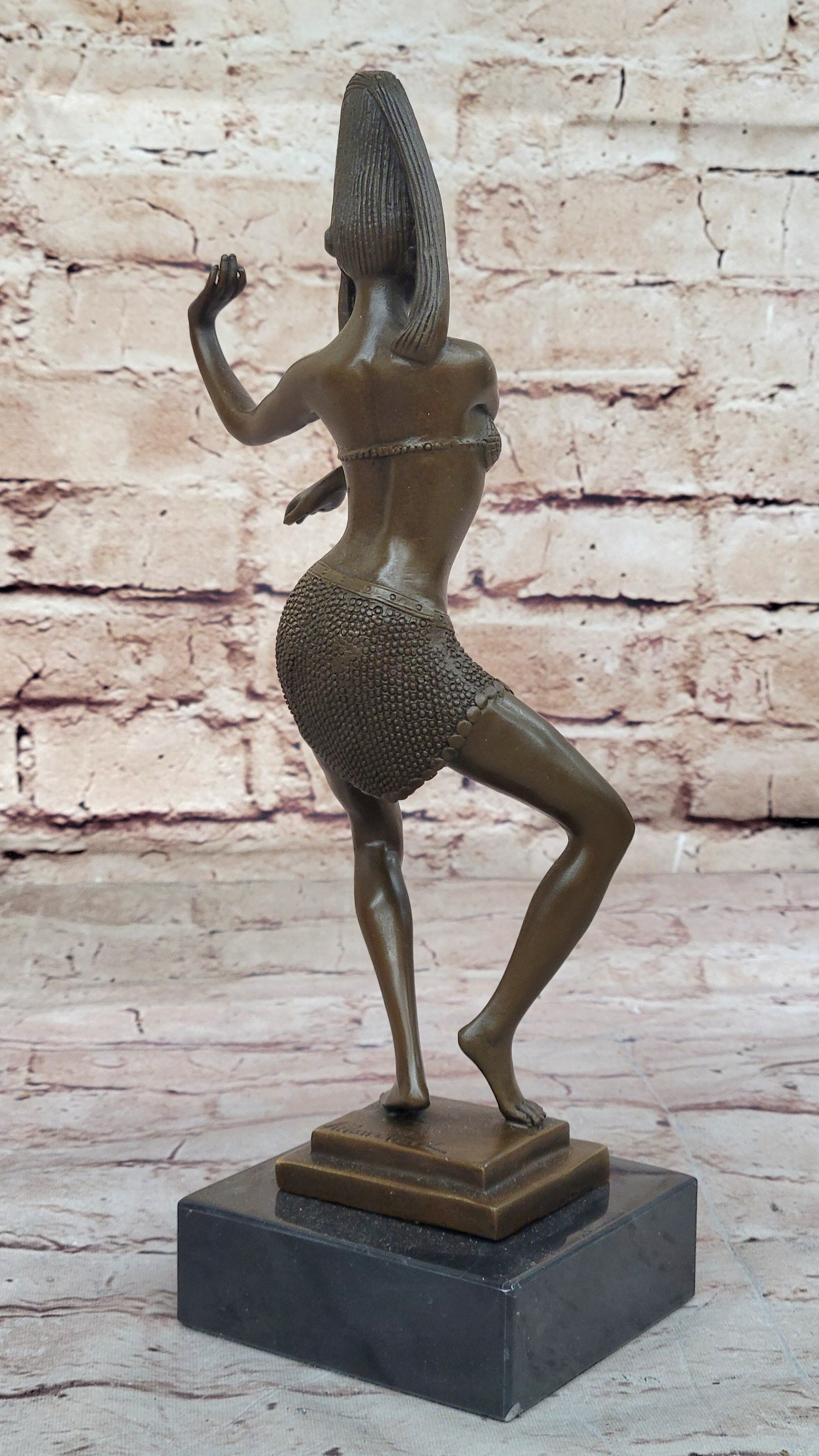 Mesmerize your space with the allure of the Egyptian dancer, a bronze sculpture that captures the essence of seduction and elegance. The dancer is poised with crossed arms on her side, tiptoeing forward in a seductive costume, captivating her audience with every movement. Crafted using the time-honored lost-wax casting method, the sculpture showcases intricate details and fine artistry.
