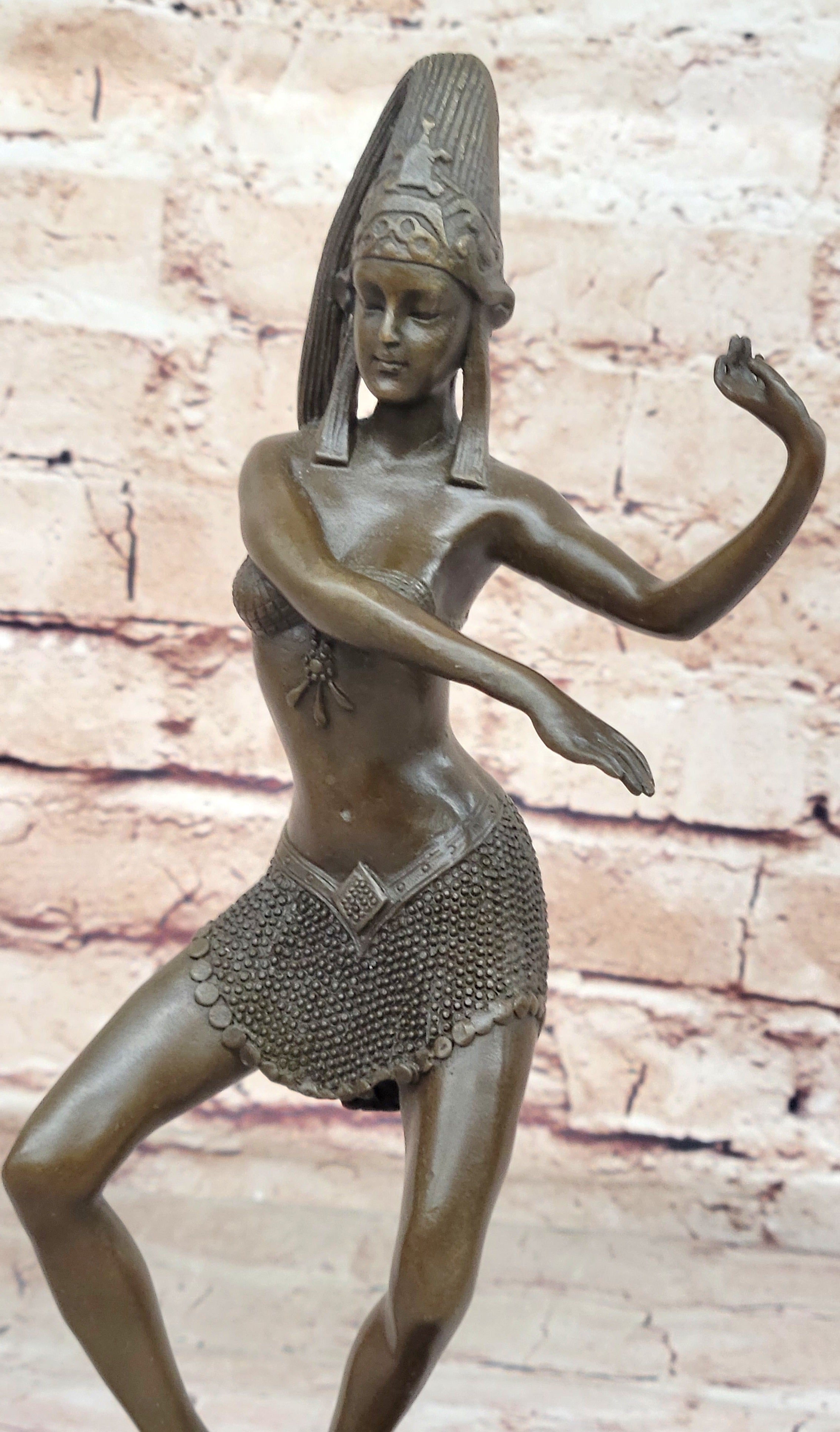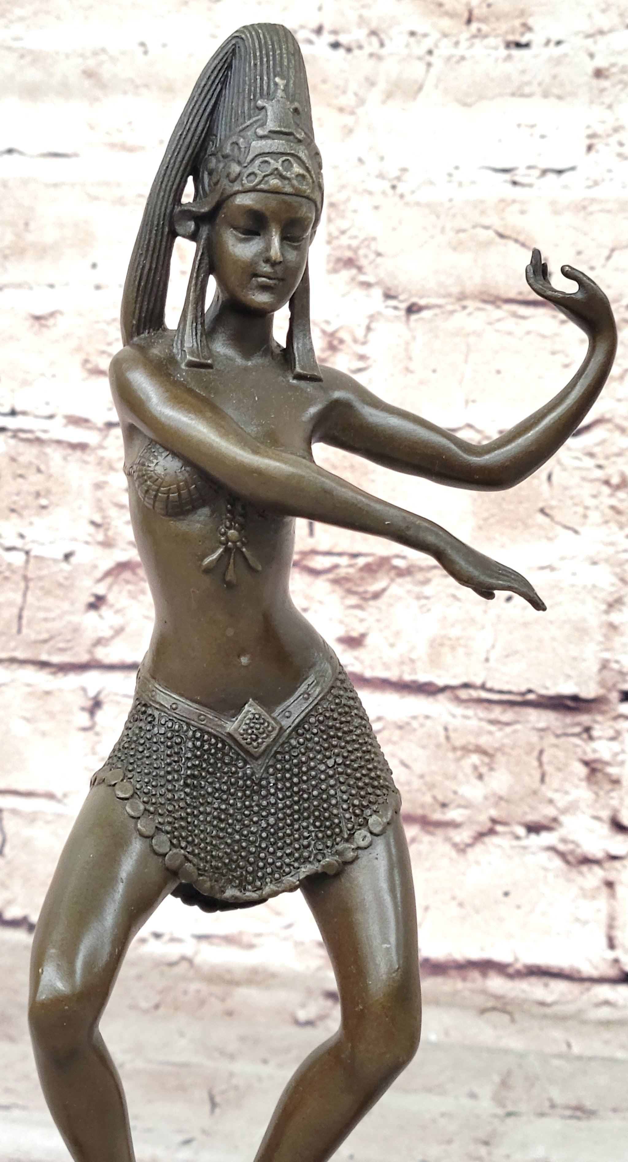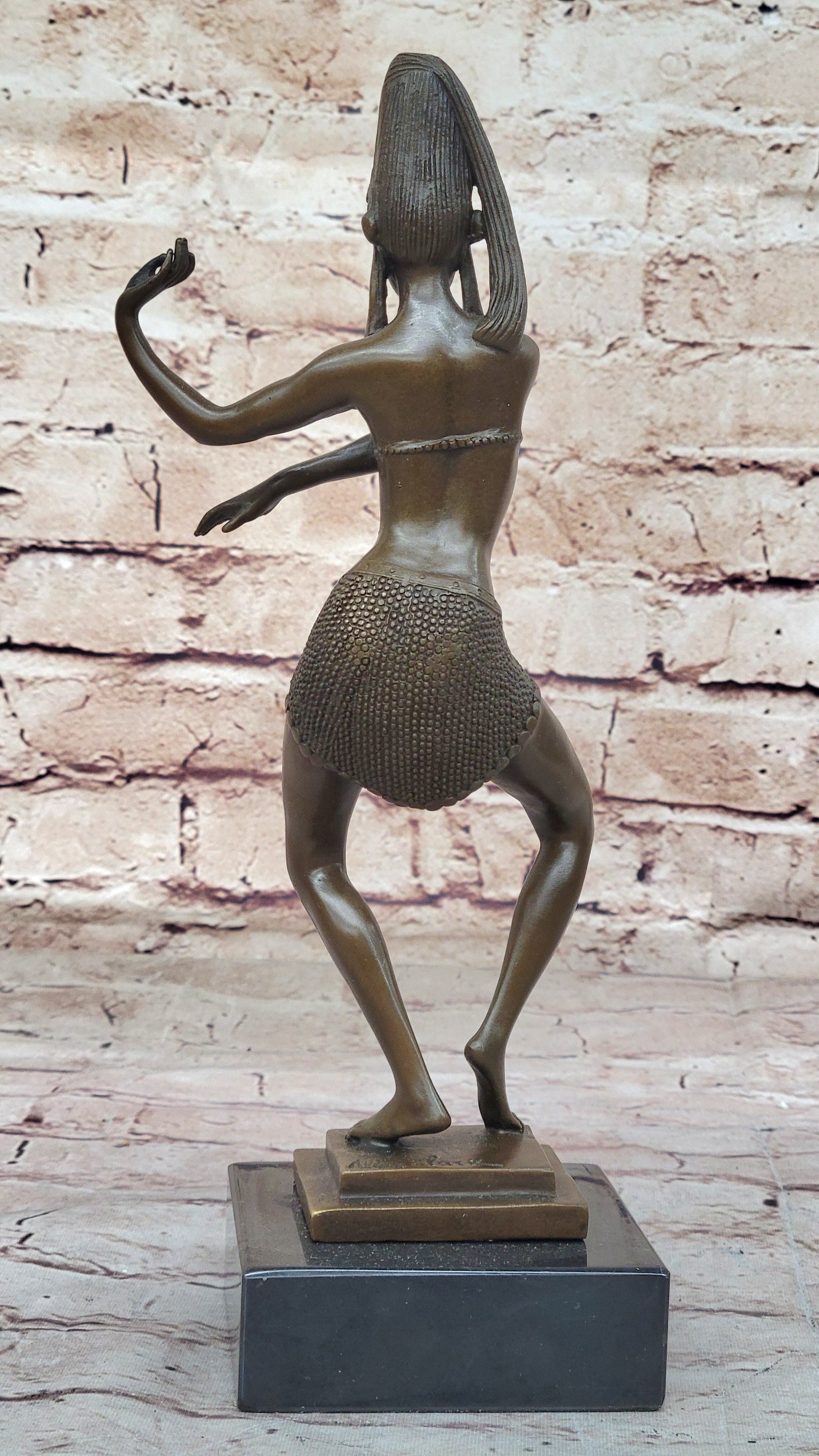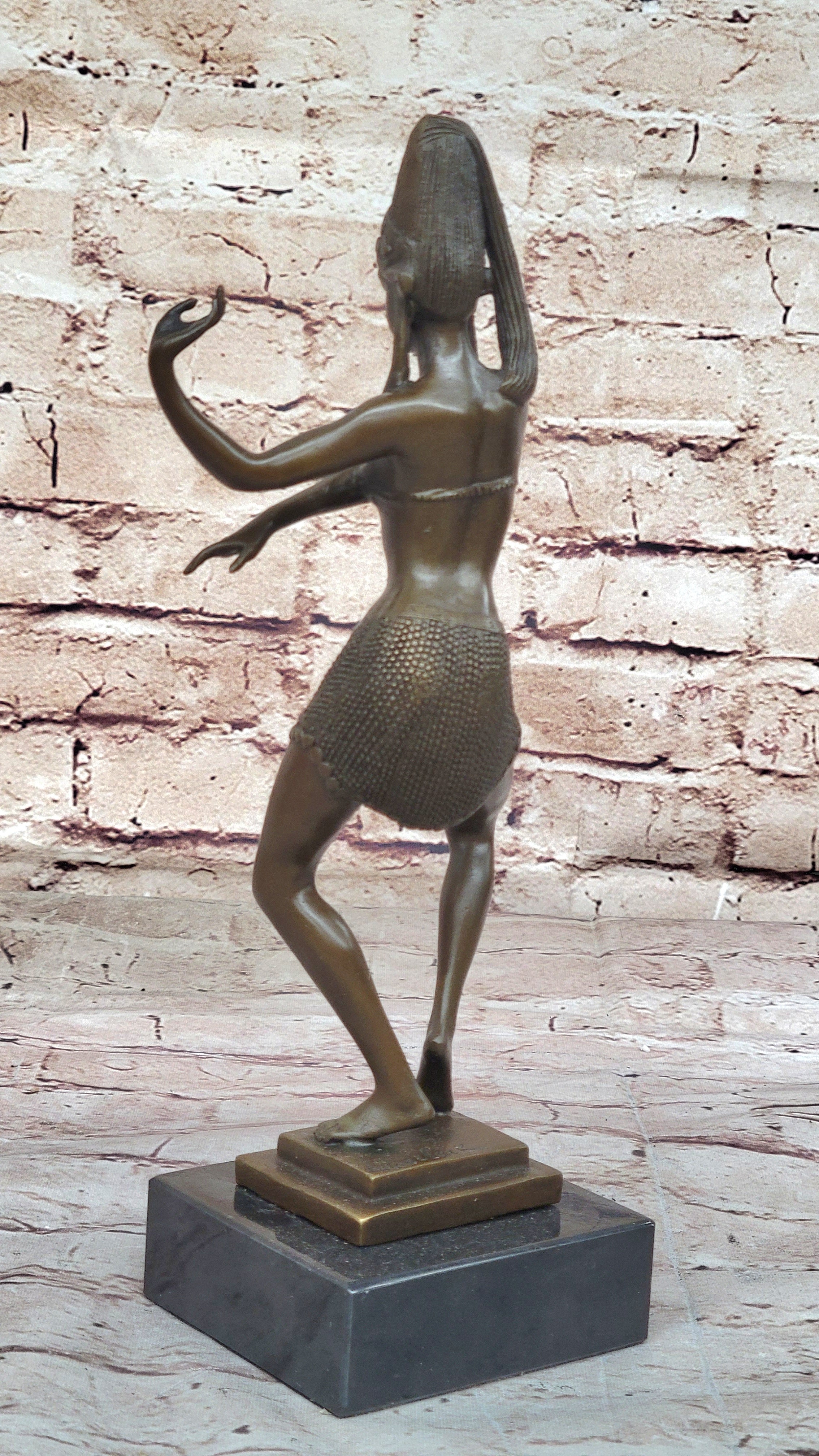 Enhance your surroundings with this exquisite bronze sculpture, a fusion of artistic craftsmanship and cultural inspiration. The Egyptian dancer invites you to appreciate the beauty of movement and form, creating a focal point that sparks conversations and adds a touch of grace to your space.Bronze Dimensions with Marble Base: Height 11" X Width 4"