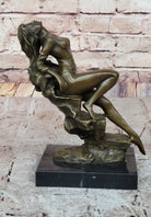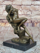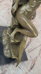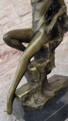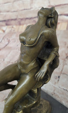 Step into the captivating world of art with this stunning bronze sculpture of an artist's muse. With an aura of elegance and sensuality, she sits on the edge of a rock, serving as a muse for a painter's creation. Her figure is adorned with a negligee that delicately drapes over her chest, revealing her exposed breasts. She gracefully tucks her arm aside, her fingertips gently caressing her skin, adding a touch of intimacy and allure to her pose.