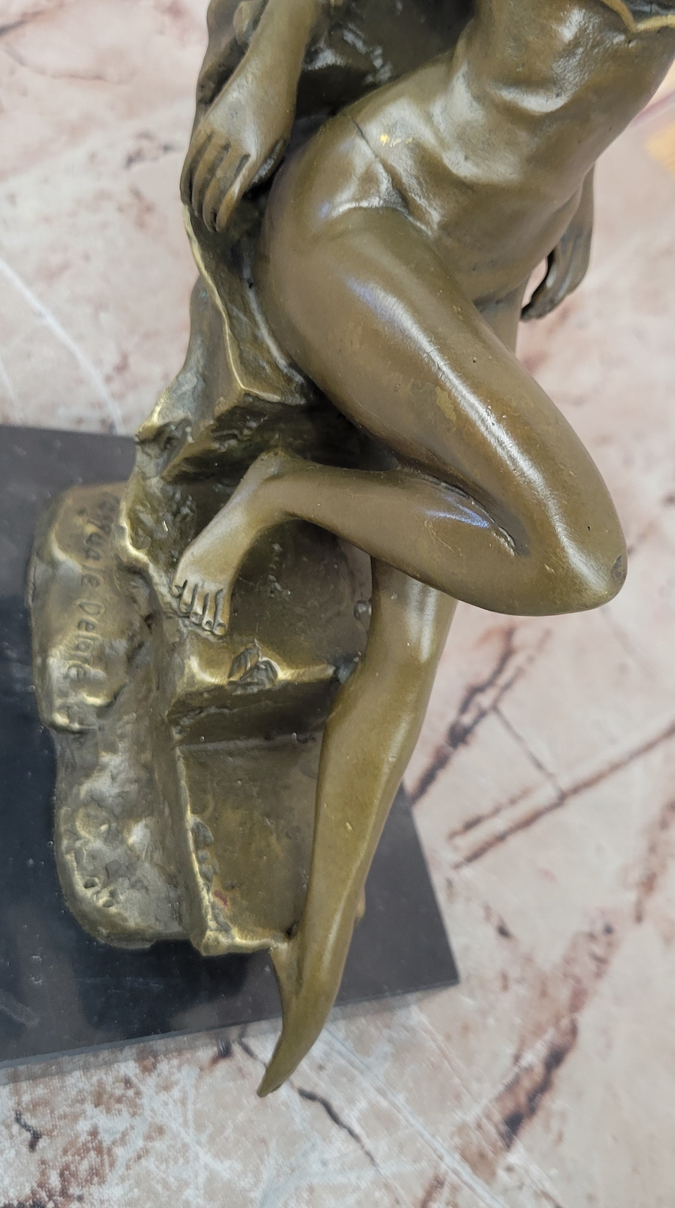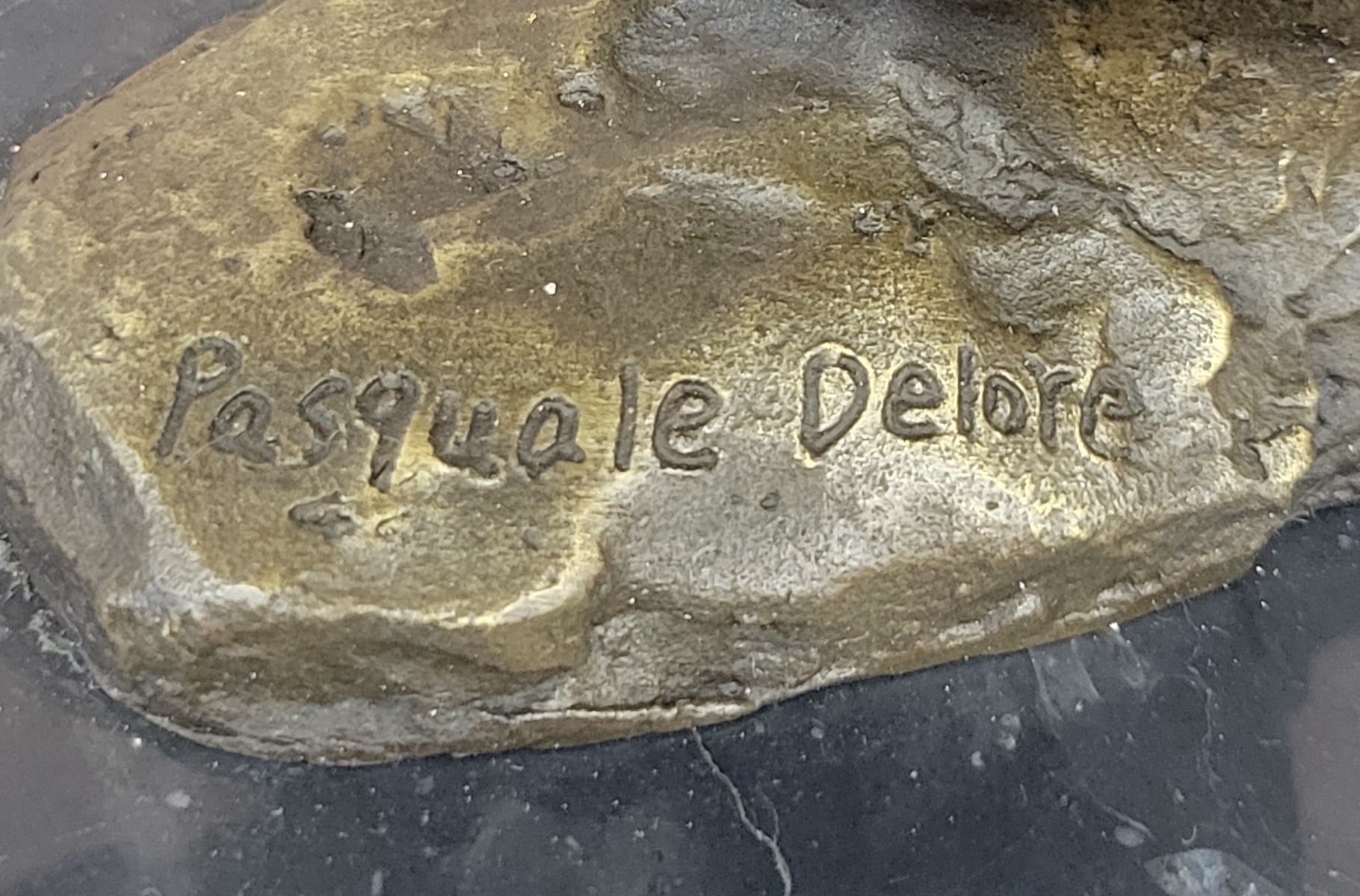 This handmade bronze sculpture is a remarkable addition to any art collection or an exquisite centerpiece for your home. It captures the essence of beauty and inspiration, inviting viewers to appreciate the artistry and the muse's captivating presence. The sculpture bears the signature of the esteemed artist Pasquale Delor, adding value and authenticity to this extraordinary piece.Bronze Dimensions with Marble Base: Height 9" X Width 10"