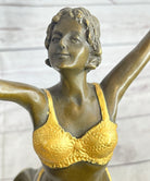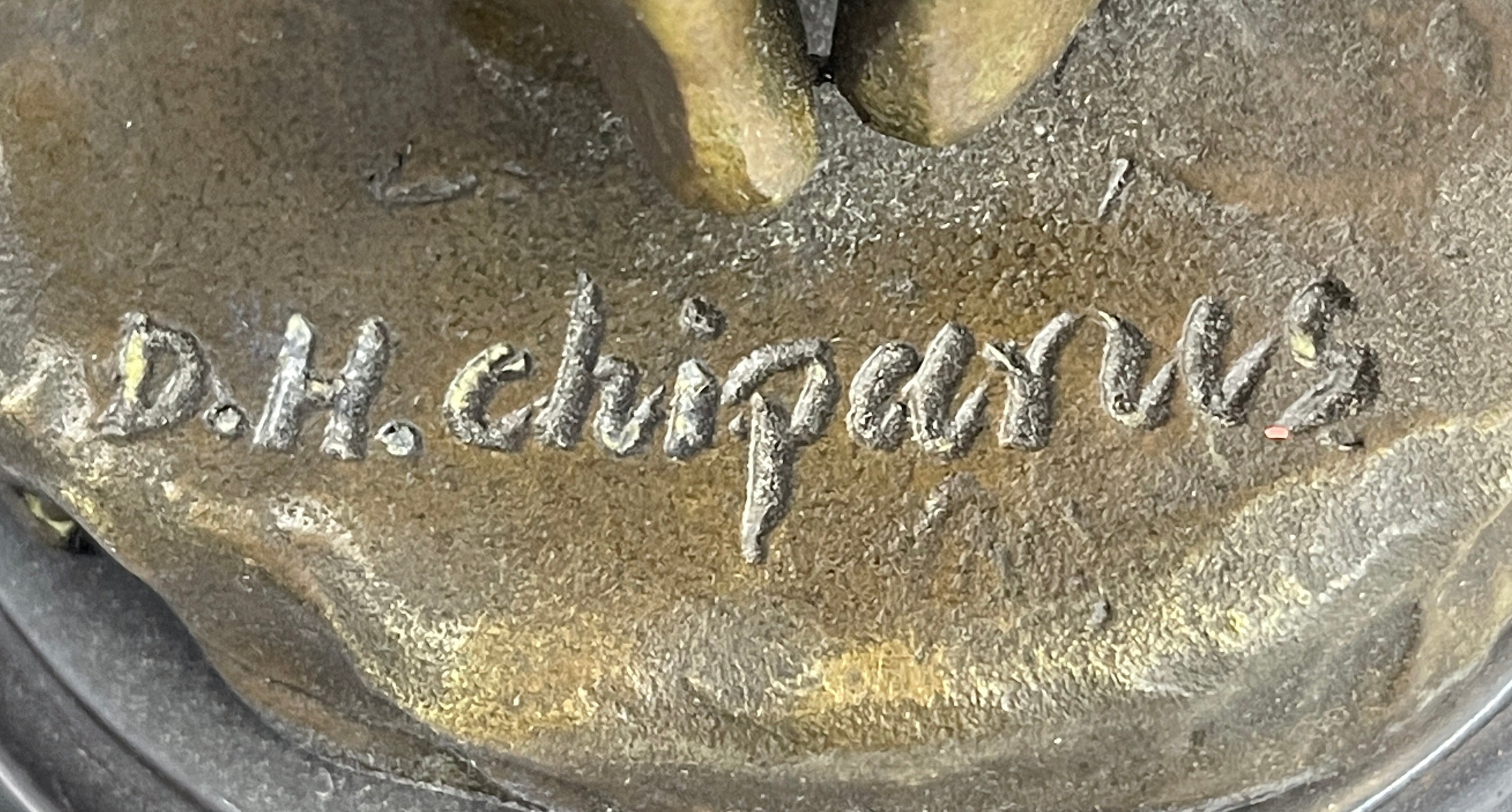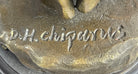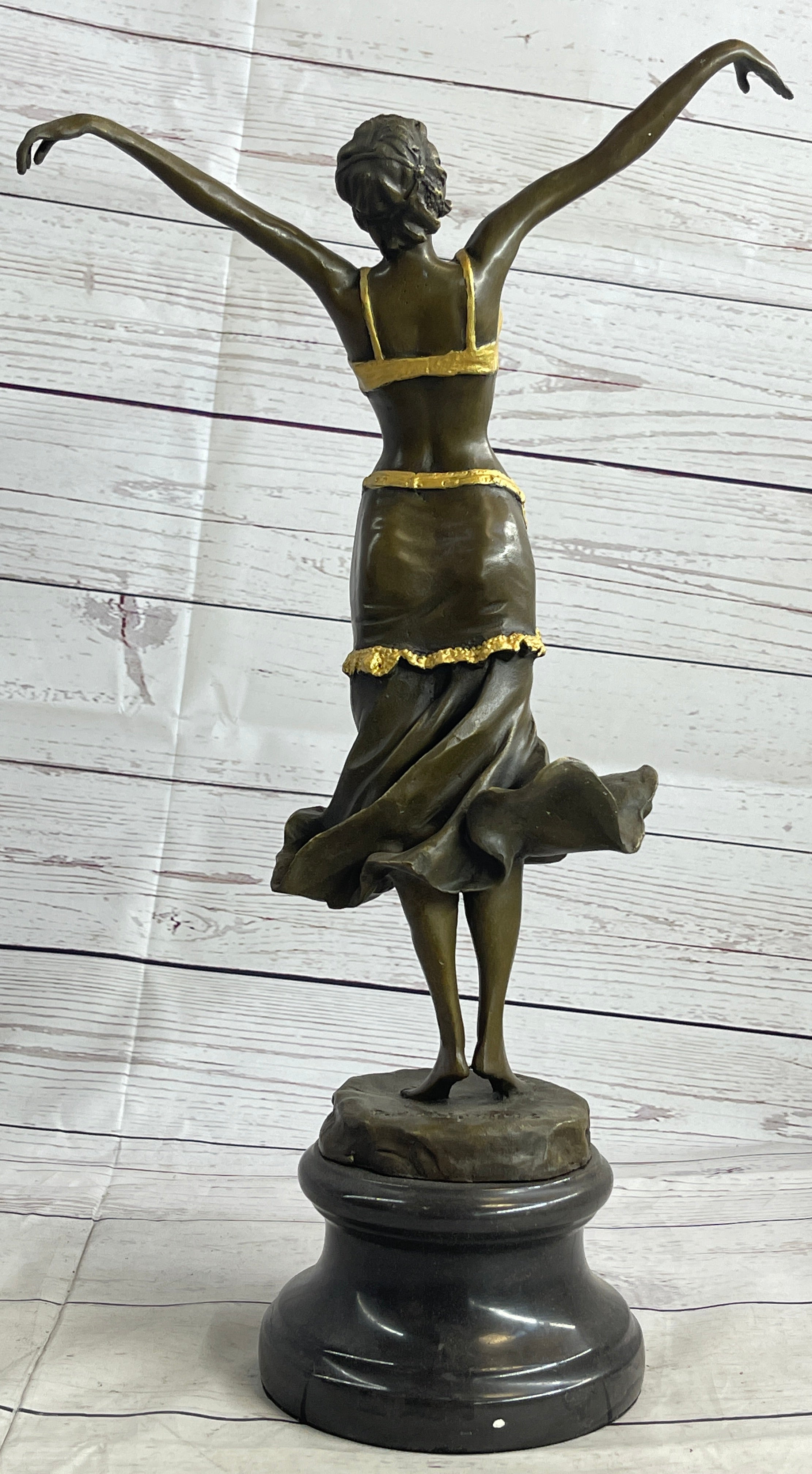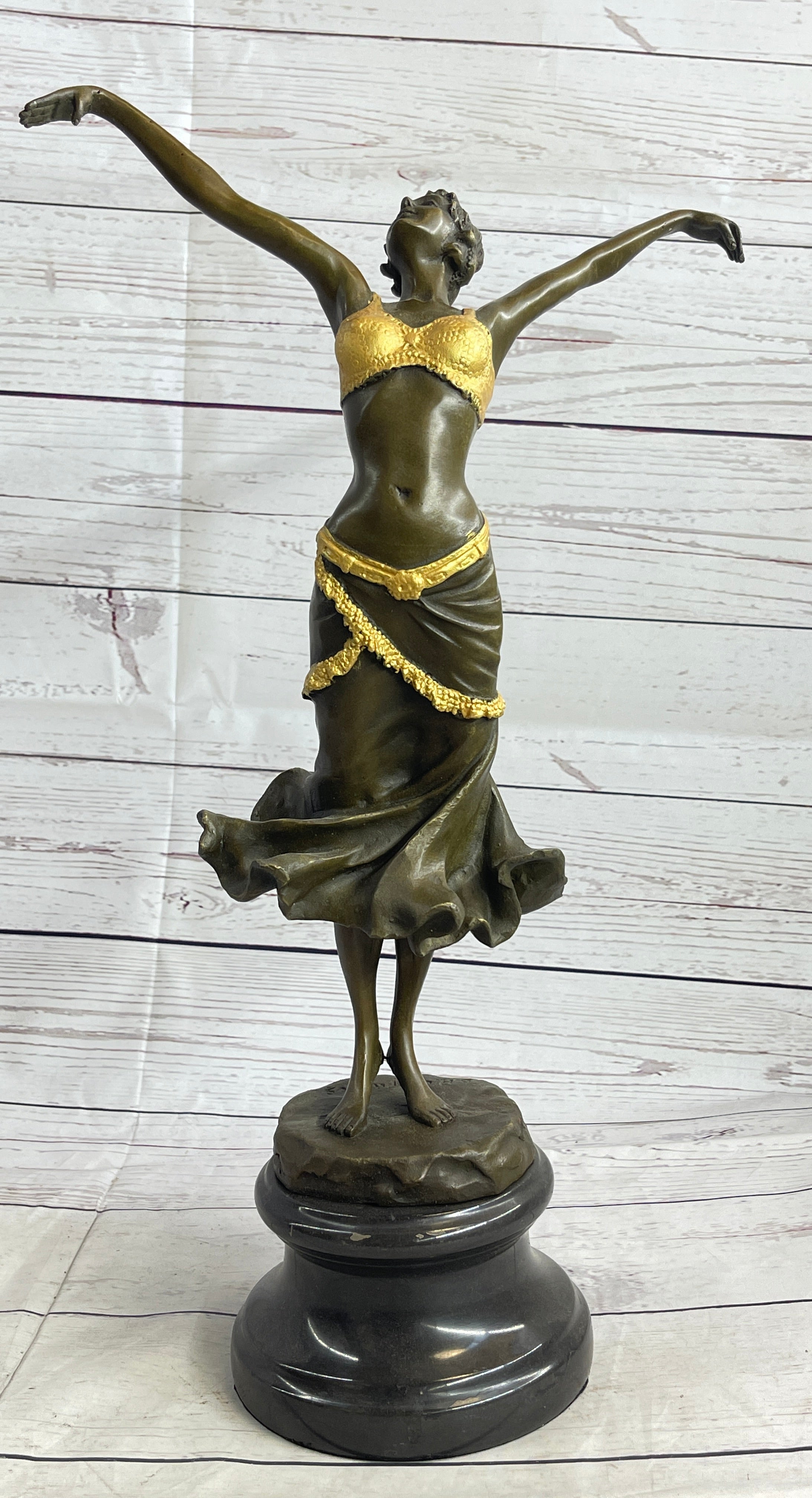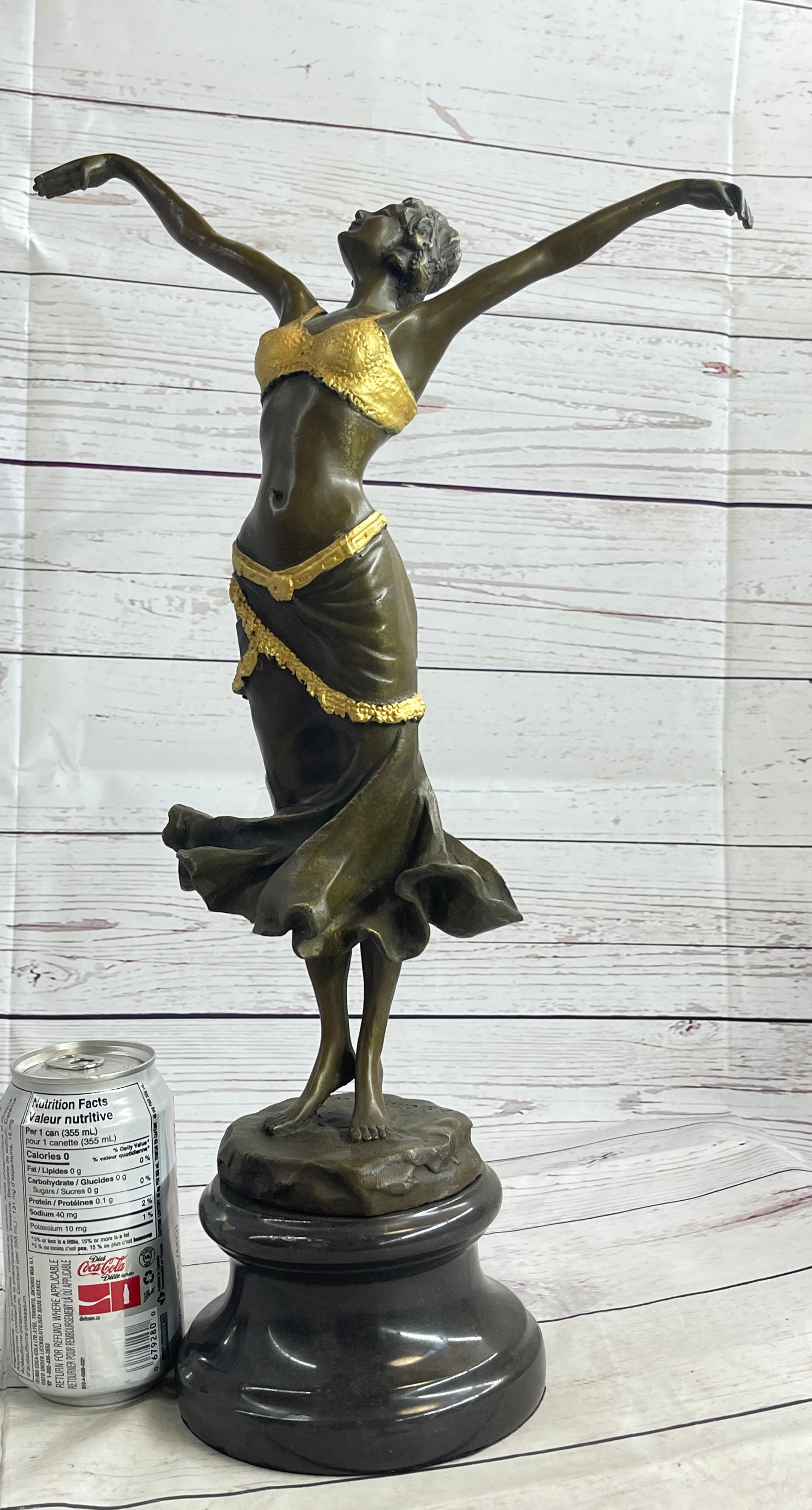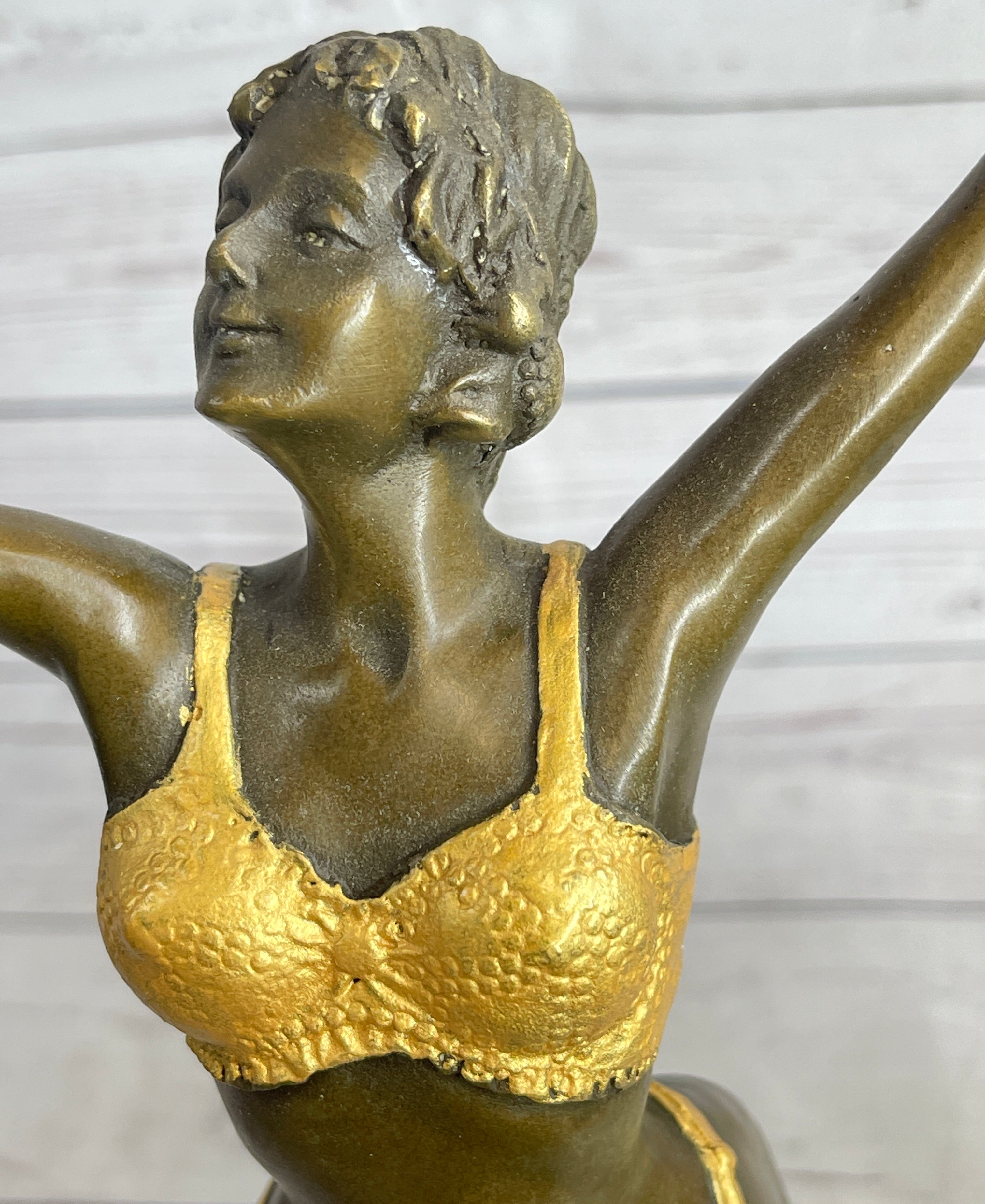 Every facet of this piece has been meticulously crafted, a true testament to the artistry that has gone into its creation. Fashioned from the finest bronze, the statue boasts a deep yellow gold and sumptuous patina finish that adds depth and character to its allure. Resting upon a sleek marble base, this artwork stands as a testament to the talent of its creator, bearing the distinguished signature "D.H Chiparus." Immerse yourself in the world of elegance and grace that this exceptional sculpture encapsulates, a timeless ode to movement and beauty.Bronze Dimensions with Marble Base: Height 18" X Width 10"