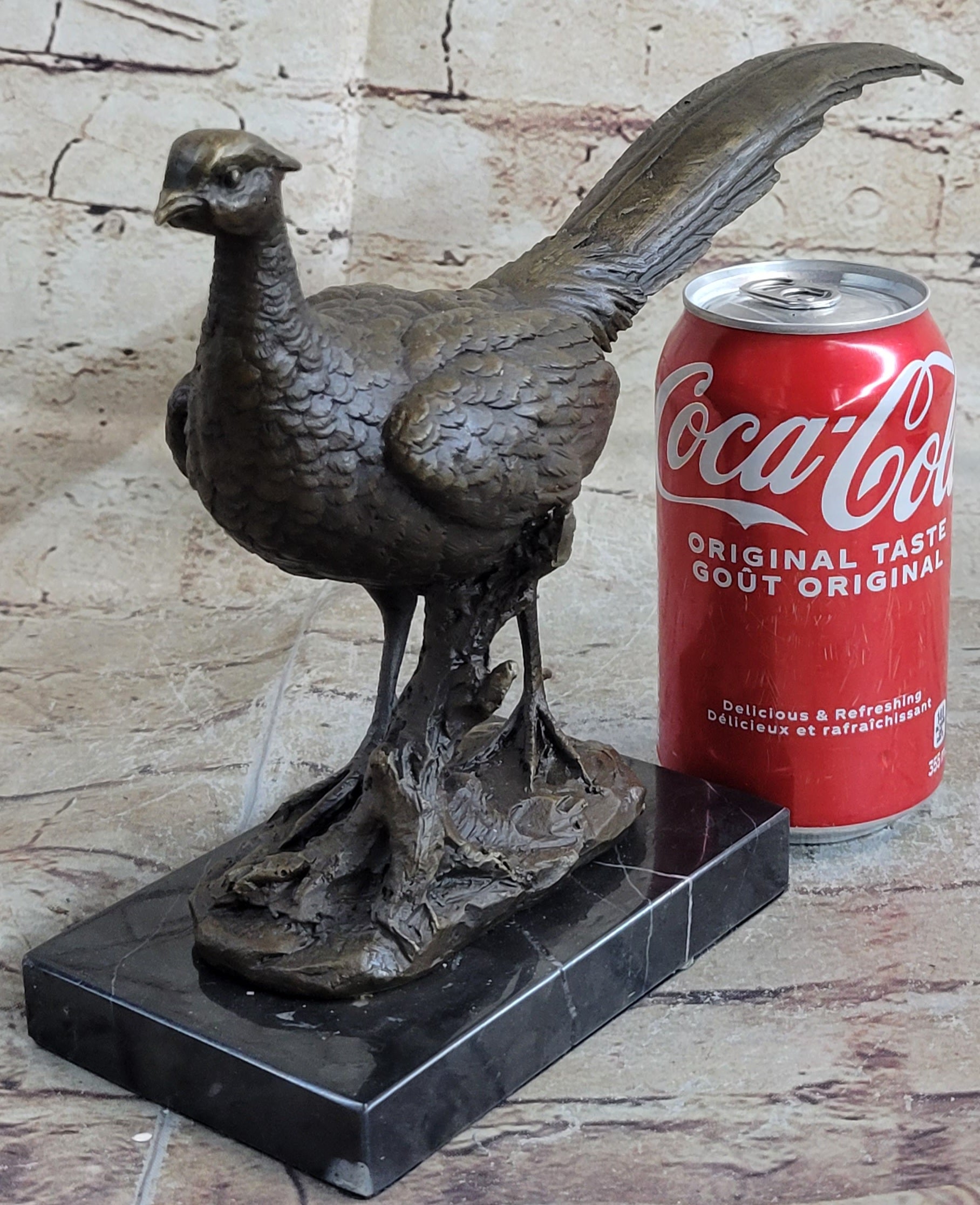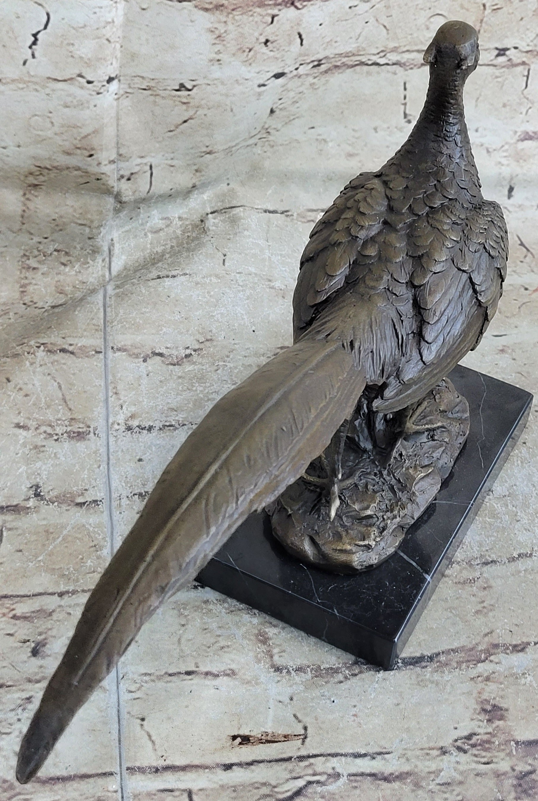 Crafted with precision and dedication, this handmade bronze sculpture is a testament to the ancient art of lost-wax casting. Each detail of the pheasant's plumage and form is meticulously rendered, showcasing the artist's mastery. To ensure its timeless appeal, a rich brown patina stain has been expertly applied, adding depth and character to the piece.