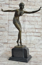 This impressive bronze sculpture, entitled "Phoenician Dancer," is a stellar example of Art Deco elegance and dynamism. The piece features a dancing lady captured in a theatrical pose with arms outstretched, standing en pointe with her legs gracefully bent close together. The detailed rendering of her form—even down to the subtle tone of her stomach muscles—reveals the artist’s extraordinary craftsmanship and passion for capturing movement and beauty in bronze.