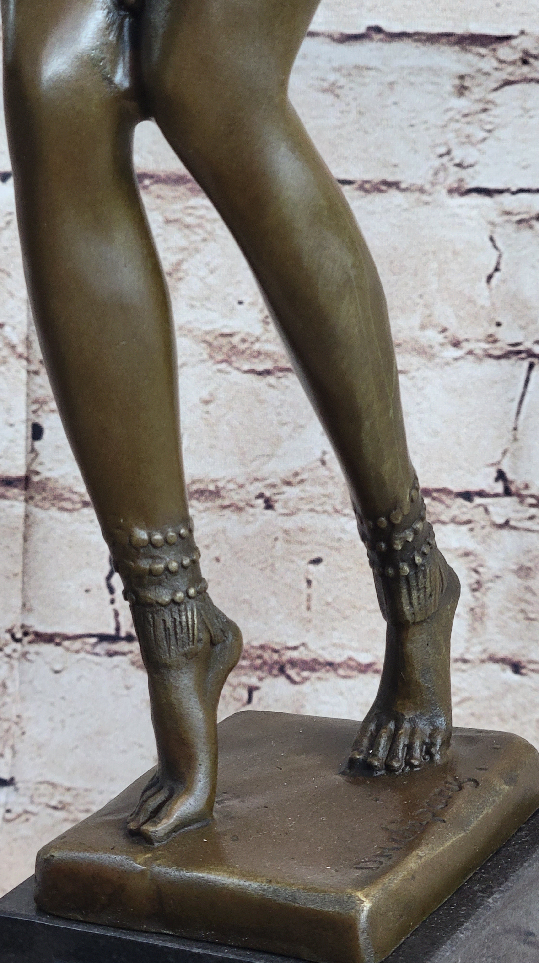 Mounted on an Art Deco-styled black marble base and signed by Chiparus, this large, heavy bronze sculpture stands as a testament to the innovative spirit of early 20th-century art. Demetre Haralamb Chiparus, a Romanian-born sculptor who made his mark in Paris, studied with prominent artists such as Raffaello Romanelli, Antonin Mercie, and Jean Boucher. His work continues to be celebrated for its blend of classical influences and modern dynamism, making "Phoenician Dancer" a coveted piece for collectors and art enthusiasts alike.Bronze Dimensions with Marble Base: Height 19" X Width 14"