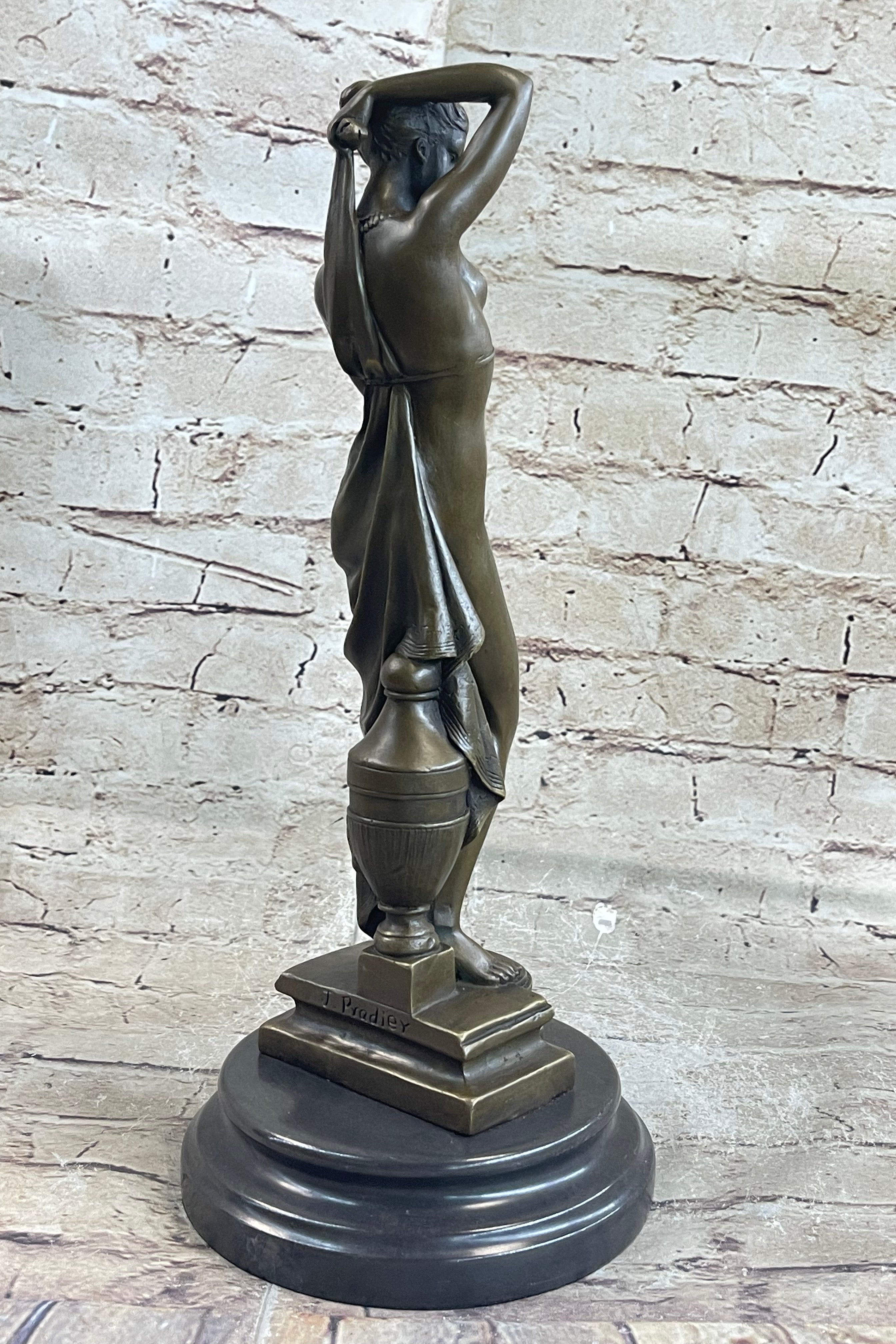 Up for auction is a remarkable bronze sculpture by the esteemed Swiss-born French artist Jean-Jacques Pradier (1792-1852), a prominent figure in neoclassical art. Created around 1848, this stunning work is a faithful reproduction of Pradier's original "Phryne," a courtesan who lived in Athens during the 4th century BC. The sculpture captures the grace and allure of Phryne, showcasing Pradier’s incredible attention to detail and mastery of form.