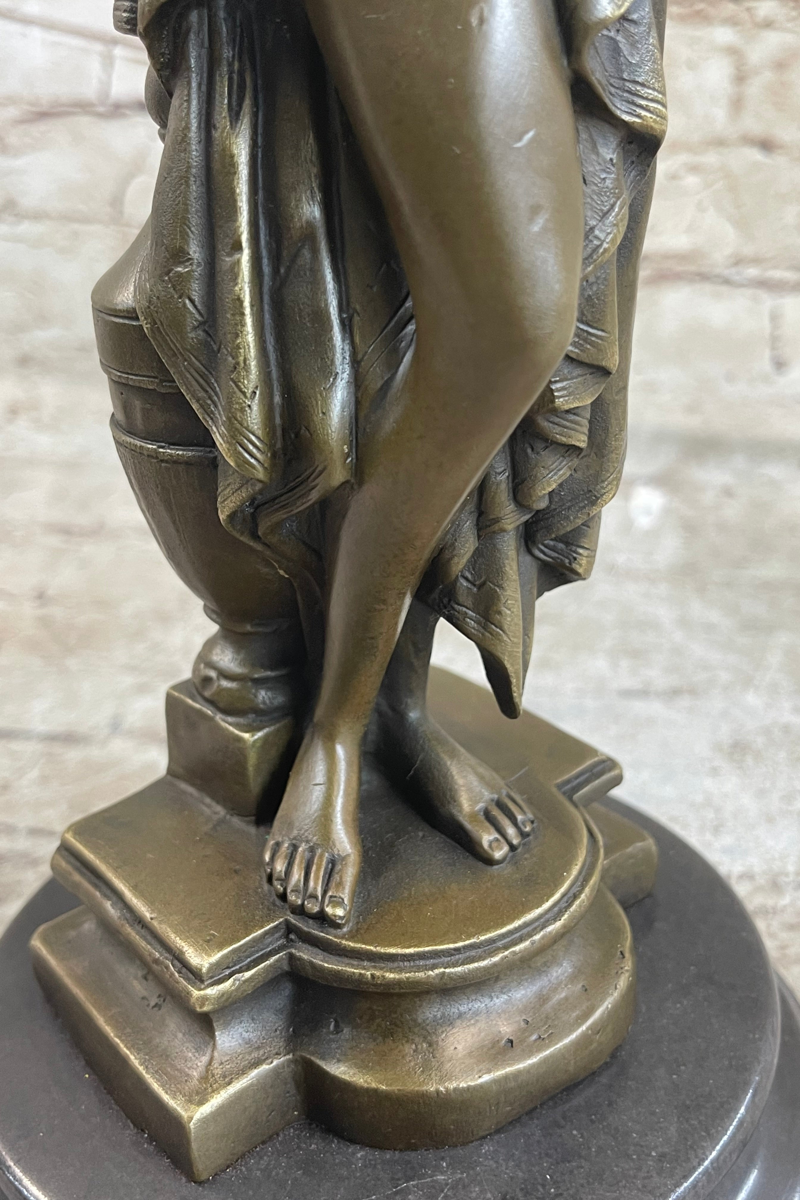 With her graceful pose, luxurious drapery, and elegant jewelry, this sculpture of Phryne continues to embody the charm and sophistication of ancient Greece. In excellent condition, this bronze rendition presents collectors with an opportunity to own a masterpiece from one of history's greatest neoclassical artists. A true treasure, it serves as both an artistic marvel and a historical homage to classical antiquity.Bronze Dimensions with Marble Base: Height 14" X Width 5.5"