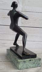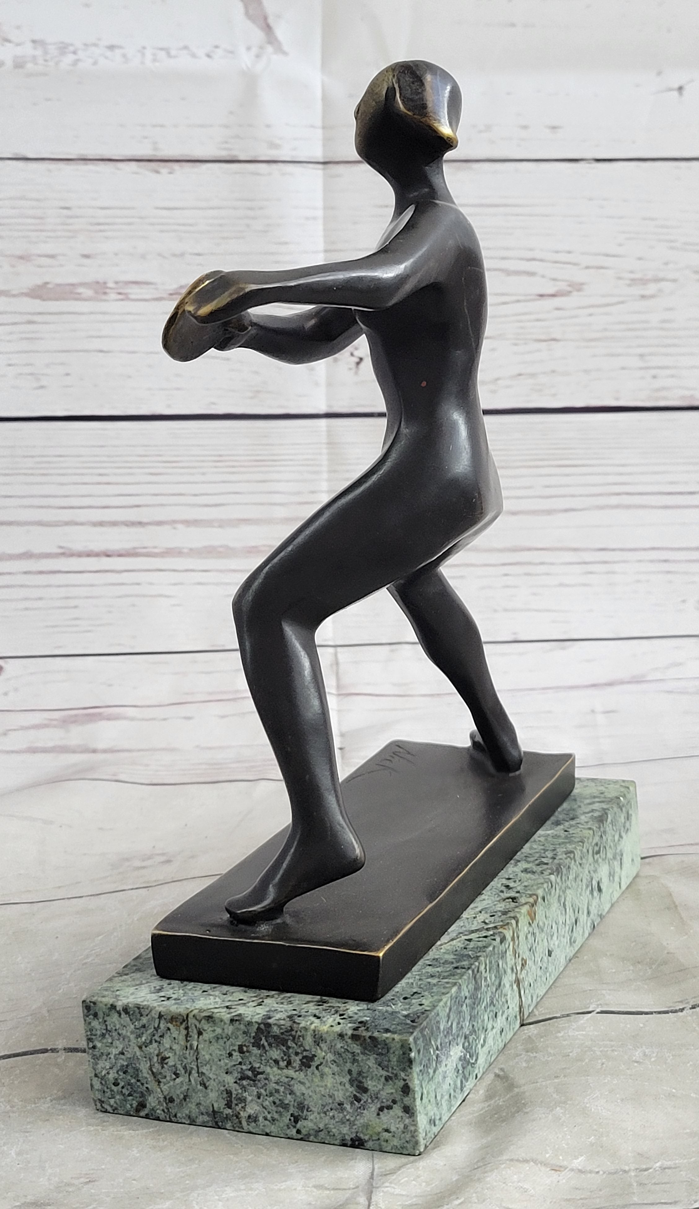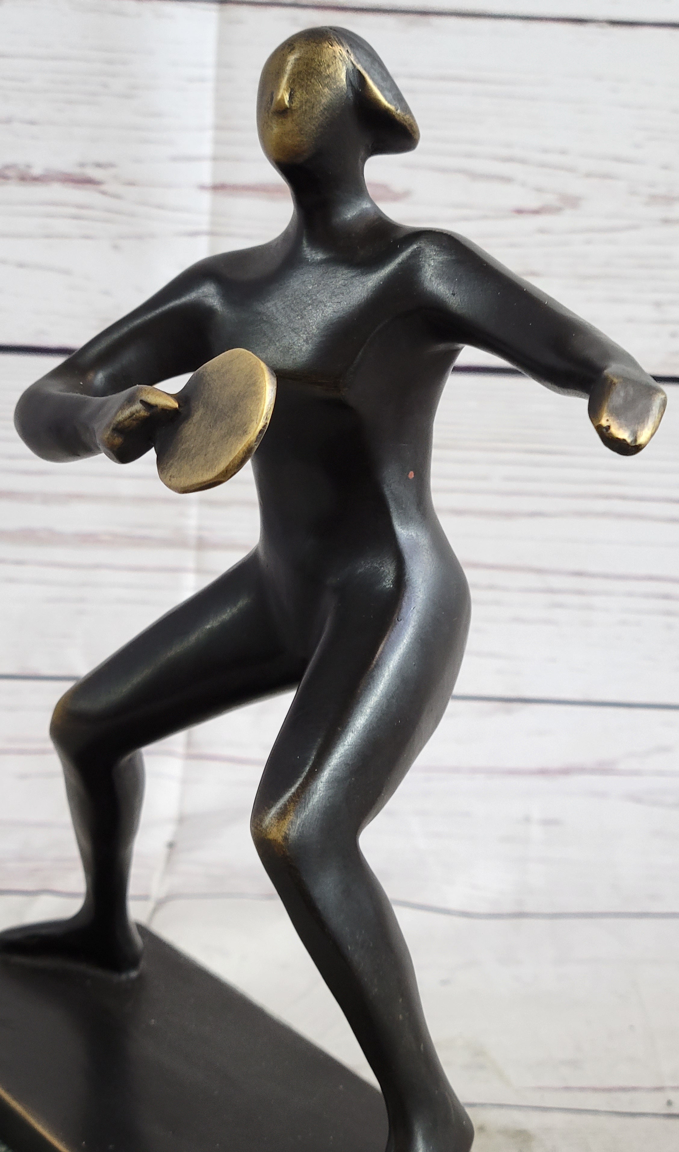 This exquisite Ping Pong Player sculpture stands as a testament to both athletic prowess and artistic craftsmanship. Standing 9.5 inches tall, this genuine bronze artwork captures the dynamic energy of the sport, with a graceful yet powerful form. The sculpture is mounted on a Green base, with a dark brown patina that enhances the richness of the bronze. Signed by the renowned artist Mario Nick, this piece is not only a celebration of table tennis but also a collector's item that showcases top-tier quality and artistry.