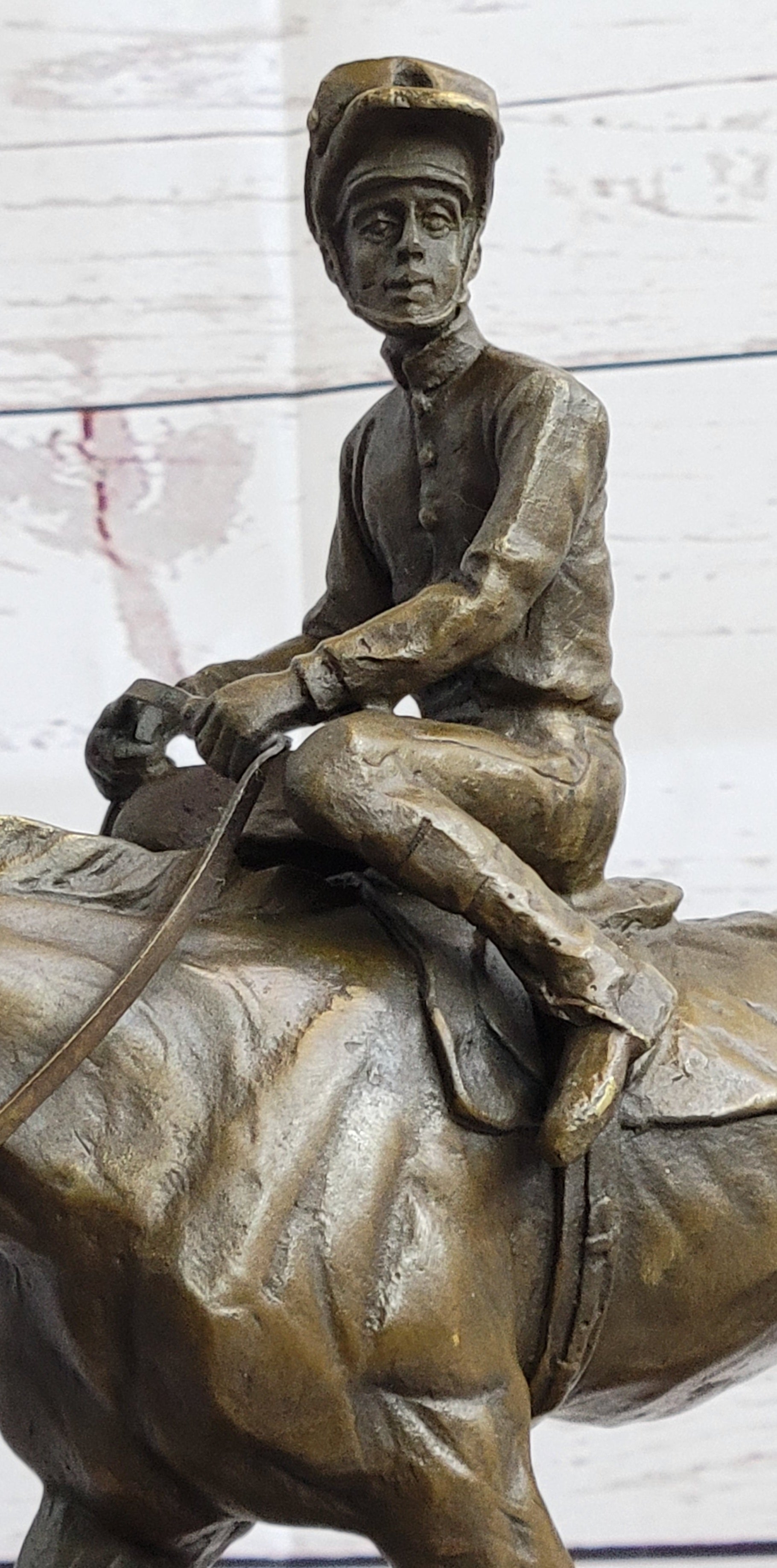 The horse, a magnificent and muscular creature, stands as a testament to the artist's attention to detail and skill. Its powerful presence and beauty are expertly rendered in bronze. This sculpture is a true masterpiece that will undoubtedly resonate with horse lovers and enthusiasts, as it beautifully conveys the unique connection between a jockey and their equine partner.