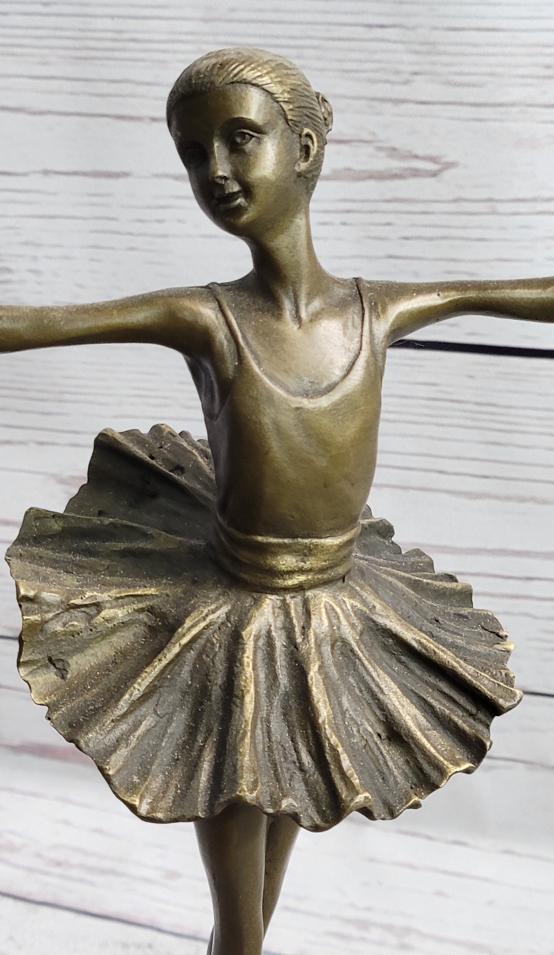 This enchanting bronze sculpture beautifully captures the grace and elegance of a young ballet dancer frozen in a moment of poise and beauty. The artist's meticulous attention to detail is evident in the dancer's flowing skirt, the delicate ballet slippers, and the carefully styled bun of her hair. Her expressive features, from her full lips to her wide, innocent eyes, exude an air of tranquility and acceptance.
