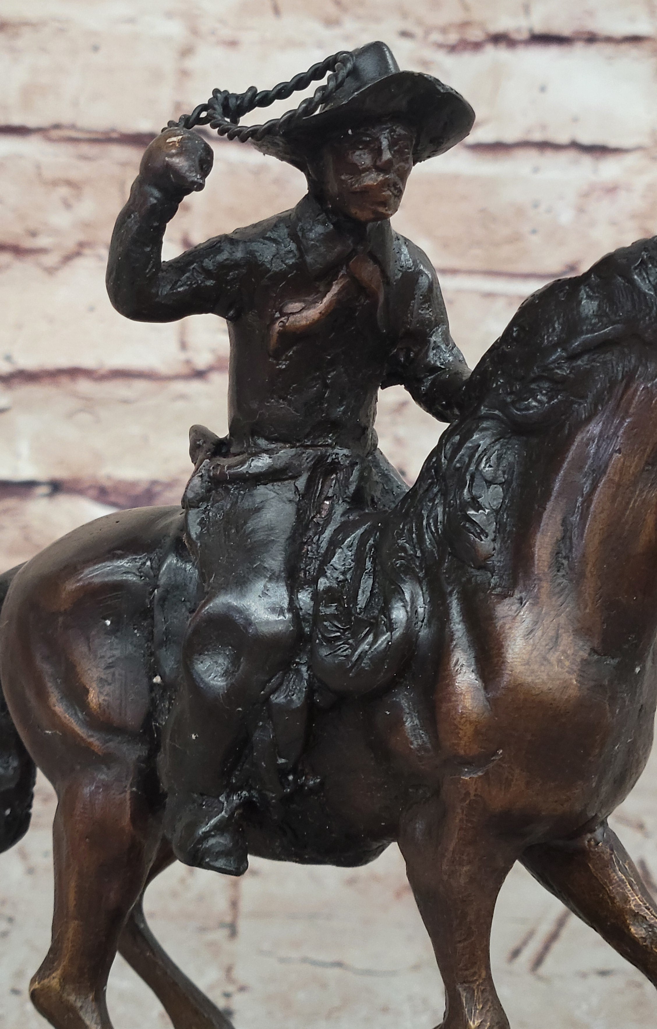 Dressed in classic cowboy attire, complete with a shirt, chaps, and boots, the rider embodies the spirit of the American frontier. The intricately detailed sculpture captures the dynamic movement of both horse and rider. The horse's saddle stays securely in place as it kicks and leaps, while the cowboy's body rolls with the relentless motion.