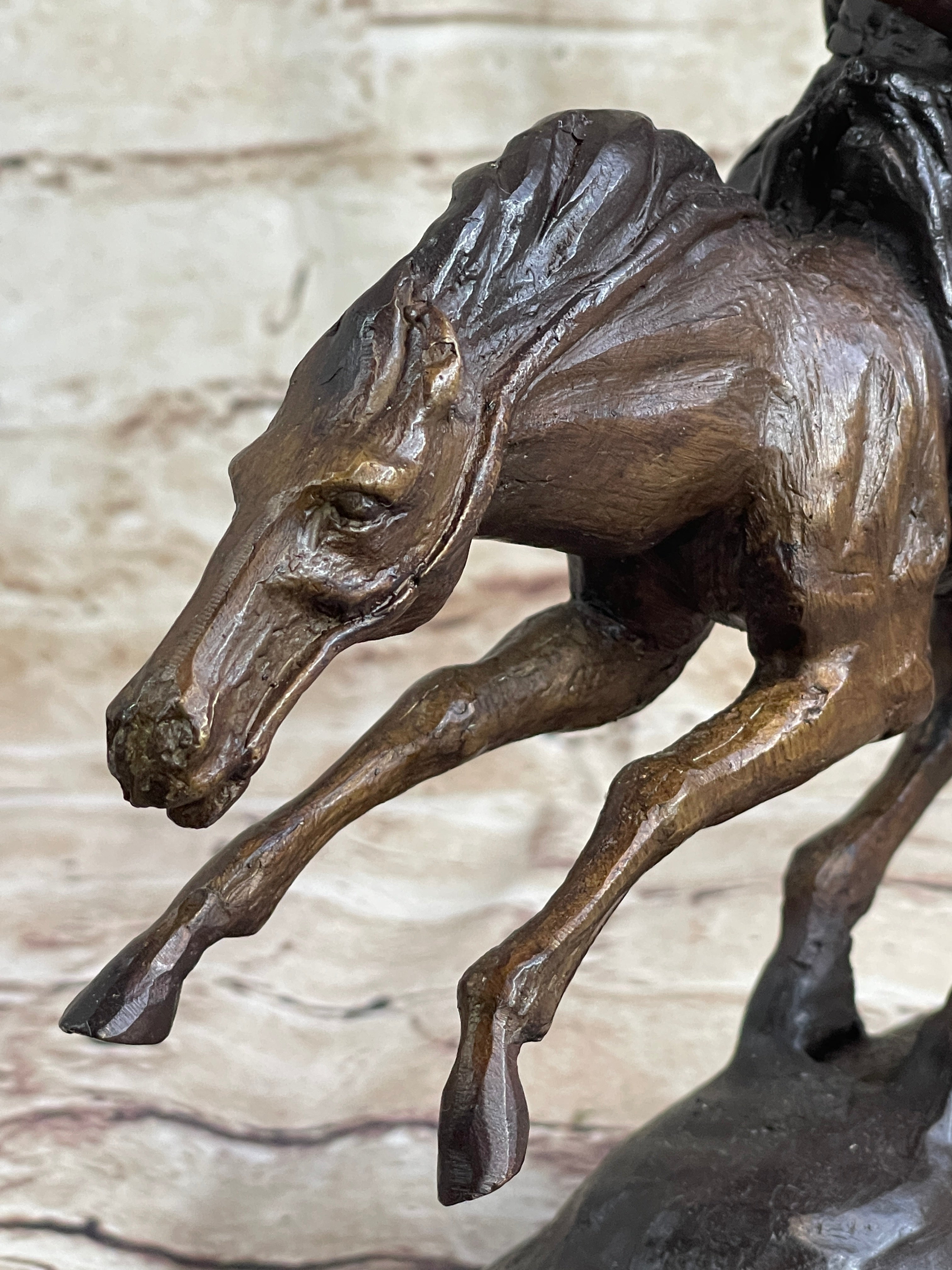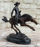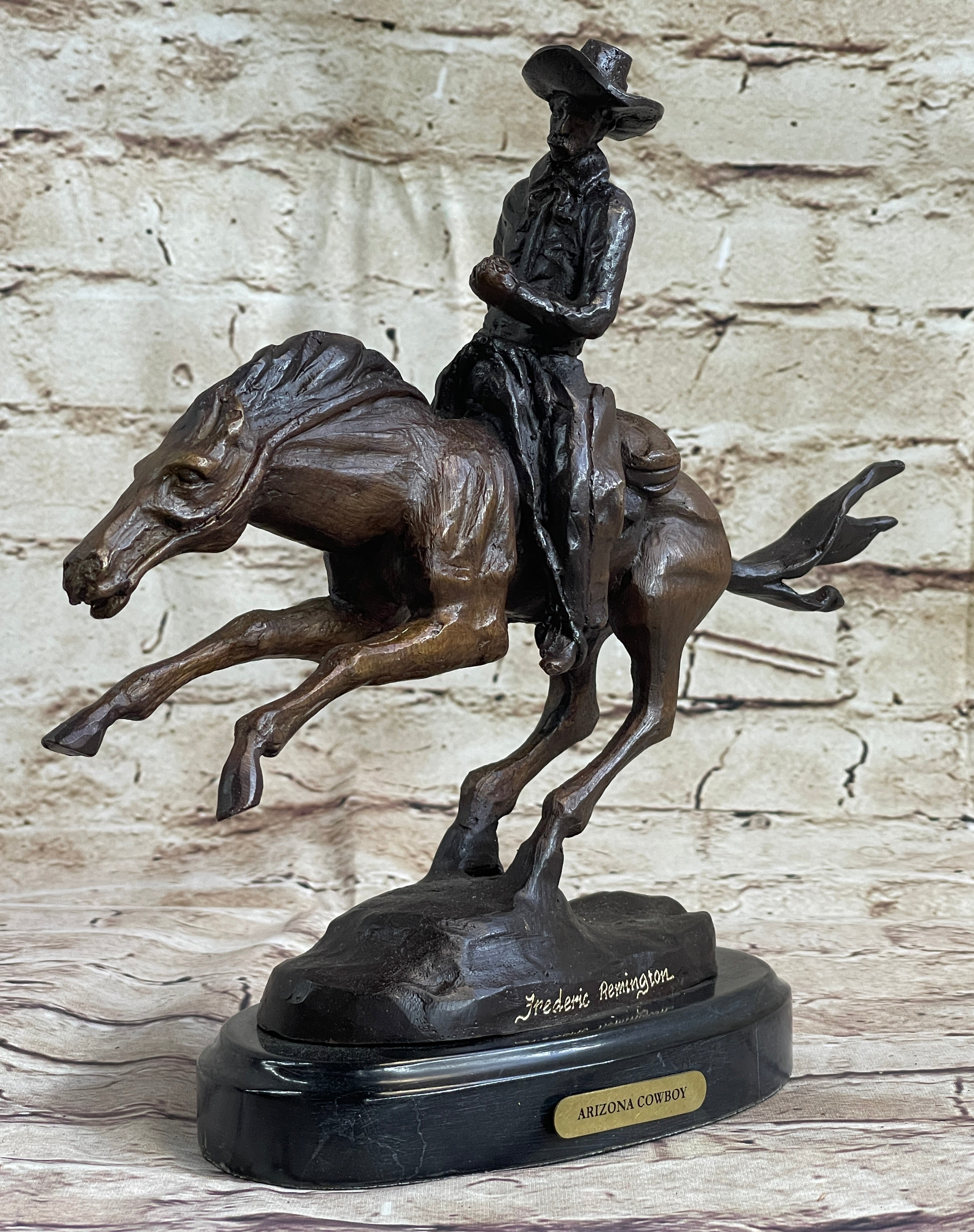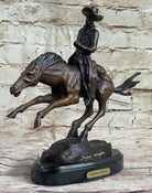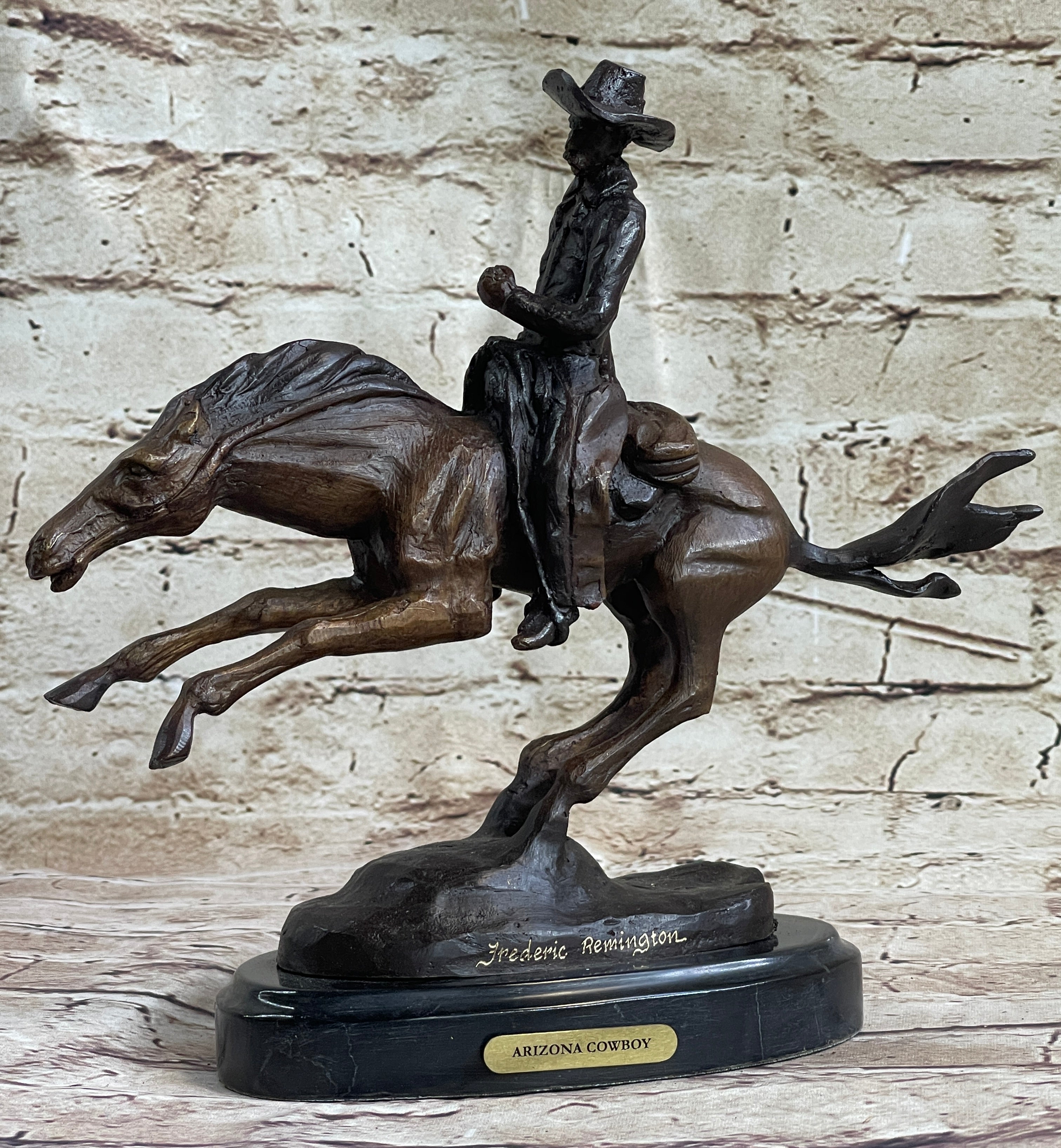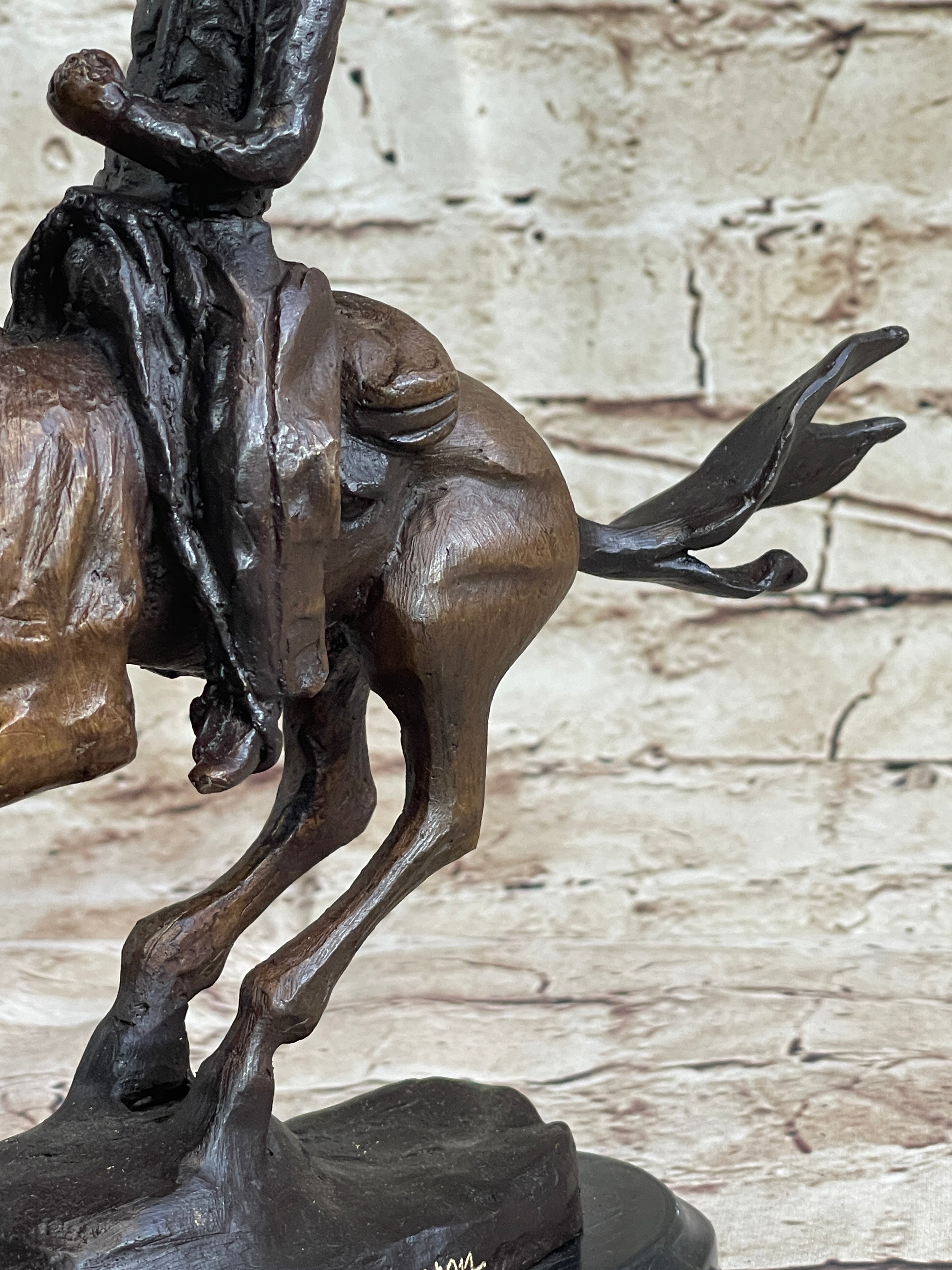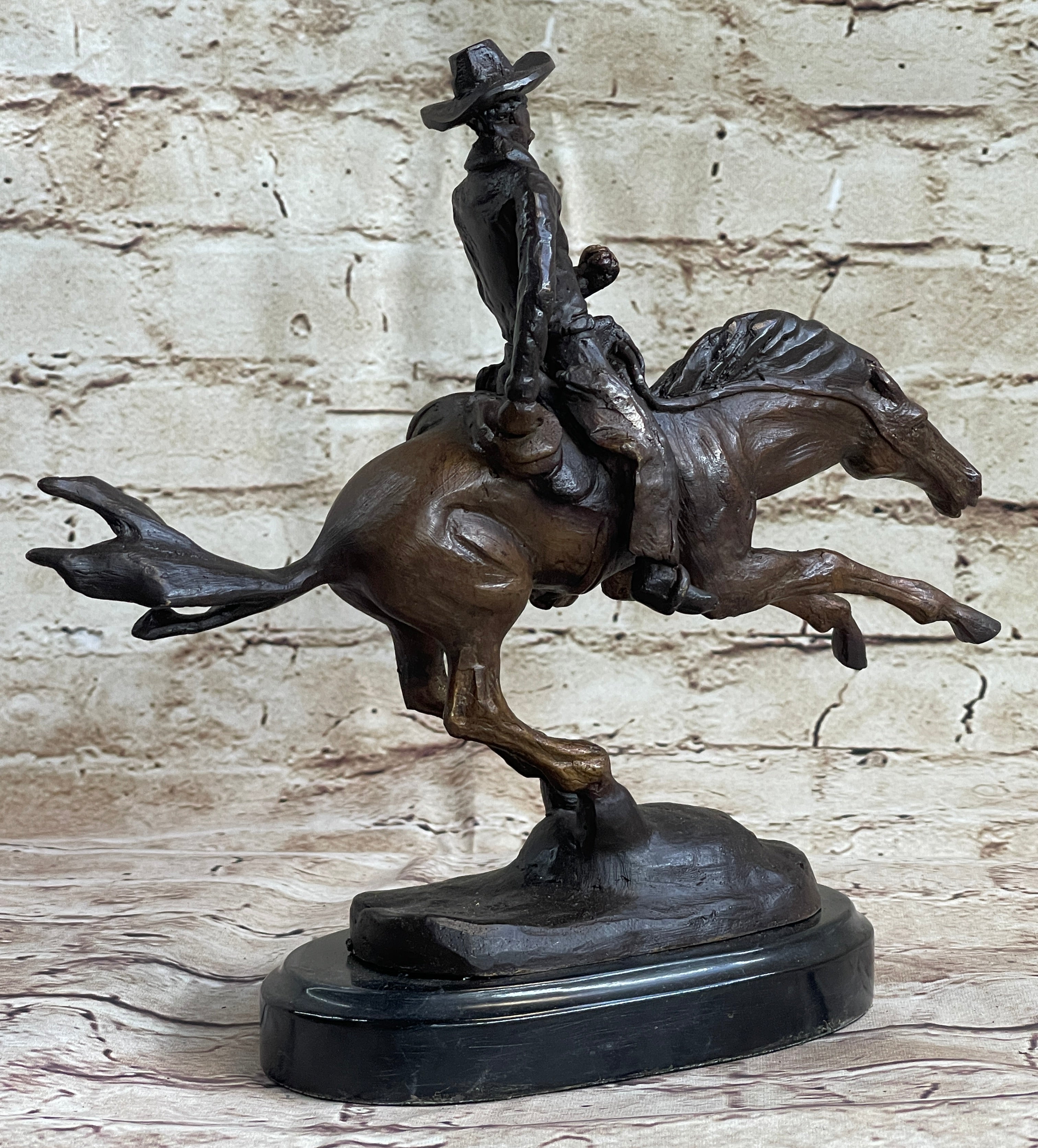 Step into the untamed world of the American frontier with this remarkable bronze sculpture titled "Cowboy with a Rope." This sculpture pays homage to the iconic works of Frederic Remington, renowned for capturing the spirit of the Wild West in his art. In this gripping scene, a seasoned cowboy fearlessly rides a wildly bucking stallion. With unparalleled courage, he maintains an iron grip on the reins, refusing to yield to the untamed spirit of his horse. Every muscle in his body strains as he rolls and sways in perfect rhythm with the horse's powerful movements. His attire, complete with shirt, chaps, and boots, reflects the ruggedness and determination required in the face of nature's fury. The battle between man and beast unfolds in vivid detail. The horse rears onto its hind legs, delivering powerful kicks, yet the cowboy's resolve remains unshaken. He deftly wraps the rope around his forearm and clutches a handful of the horse's mane, ensuring he won't be thrown off. It's a testament to the unyielding spirit of the American cowboy, a symbol of resilience and unwavering determination. Crafted with meticulous care, this sculpture is a true work of art. Made from 100% bronze and created using the age-old Lost Wax Method, it captures the intensity and drama of this iconic Western moment. Mounted on a sleek black marble base, this sculpture is a tribute to the enduring legacy of the American frontier. It proudly bears the signature of the artist Thomas, adding authenticity to this extraordinary piece.