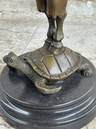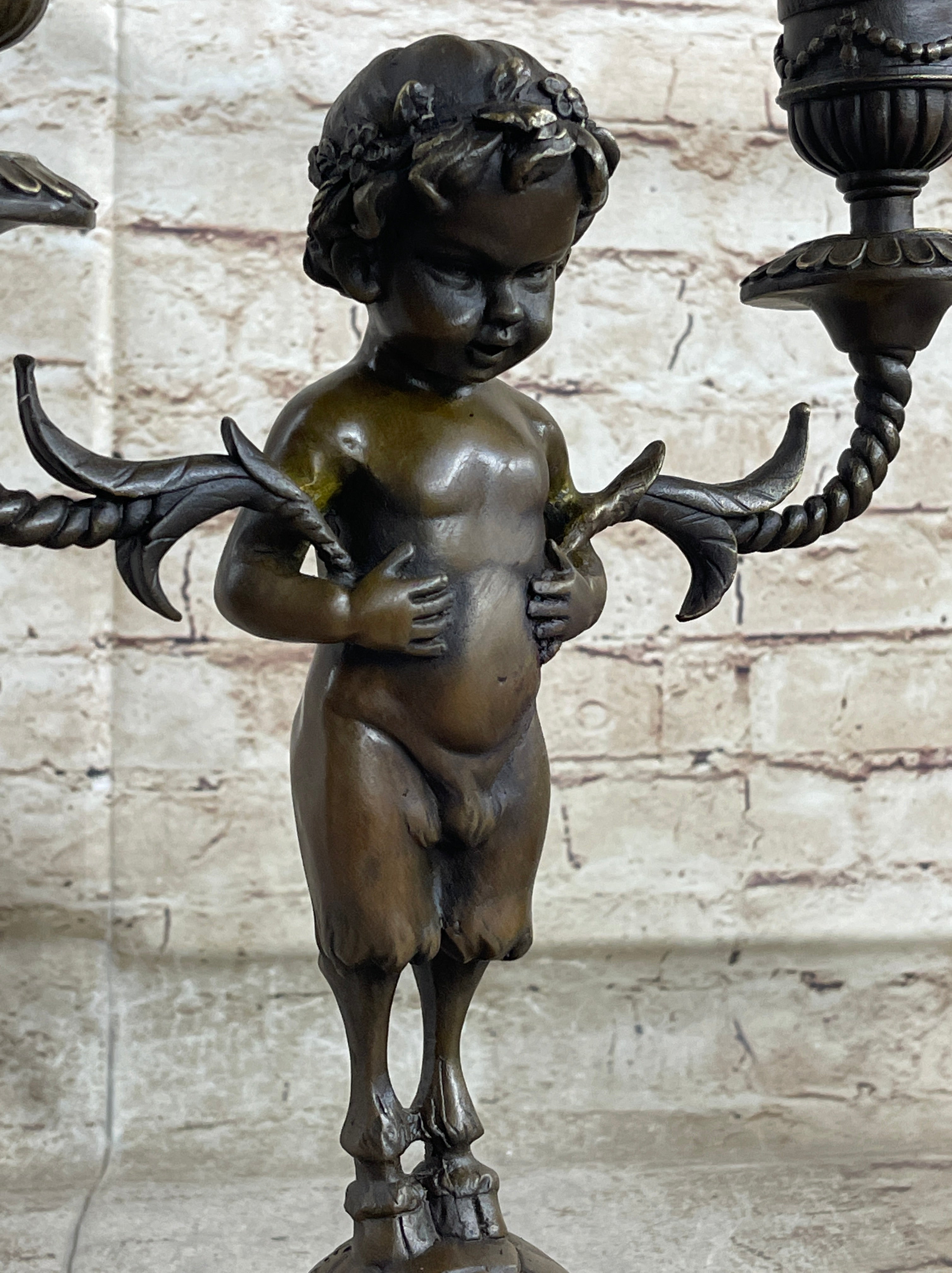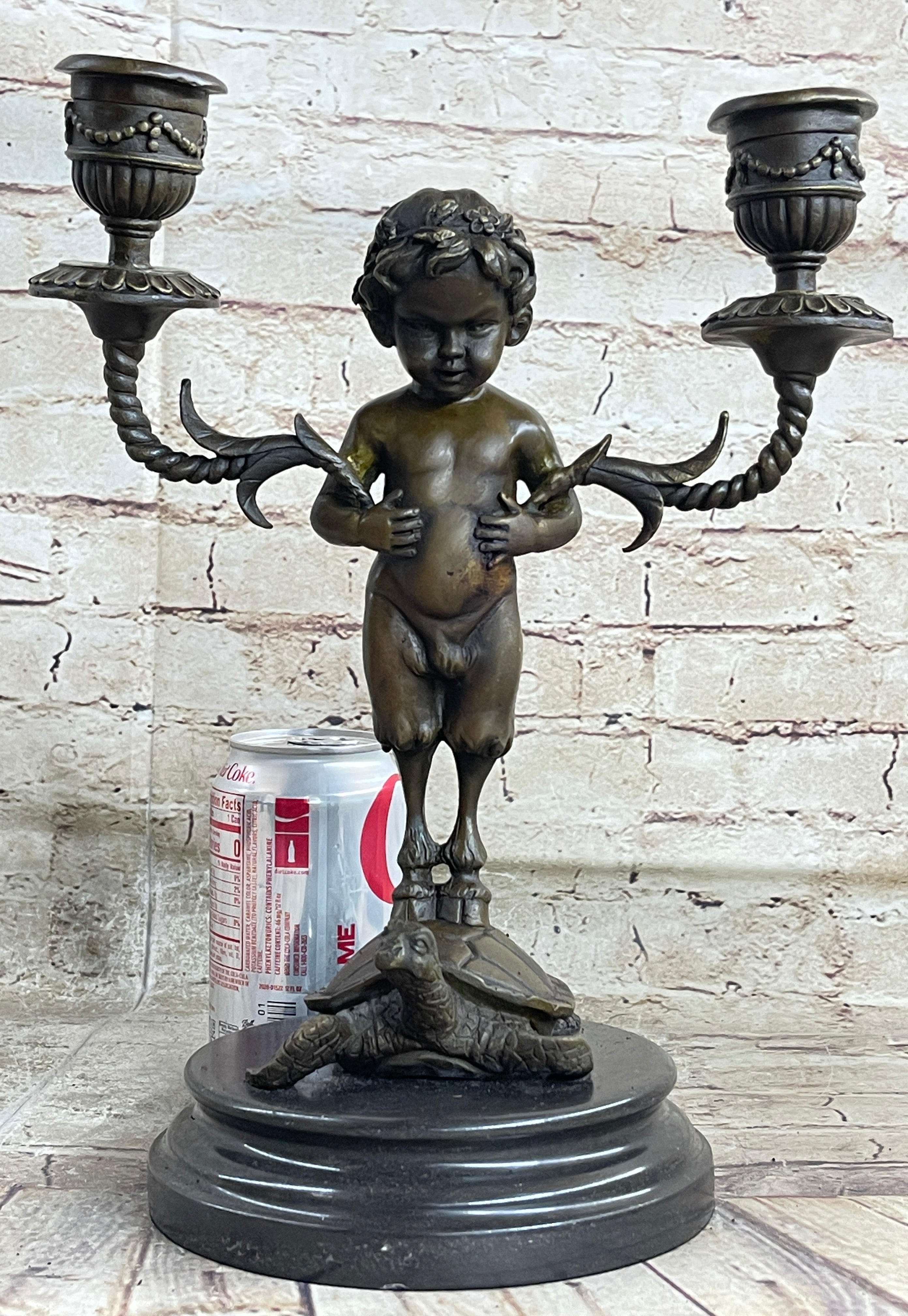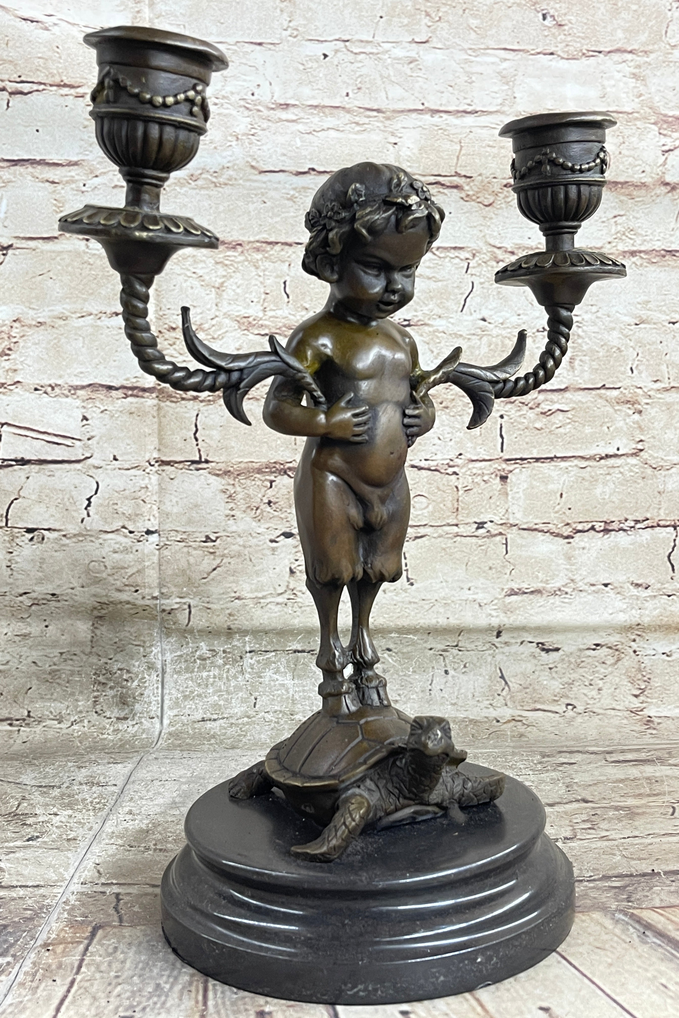 Elevate your space with an exquisite bronze candelabrum featuring a delightful composition. A charming baby satyr cradles the candelabrum under its arms, while its hooves rest gently on the shell of a slow-moving tortoise. This remarkable sculpture encapsulates the beauty of classical motifs in a truly captivating way.