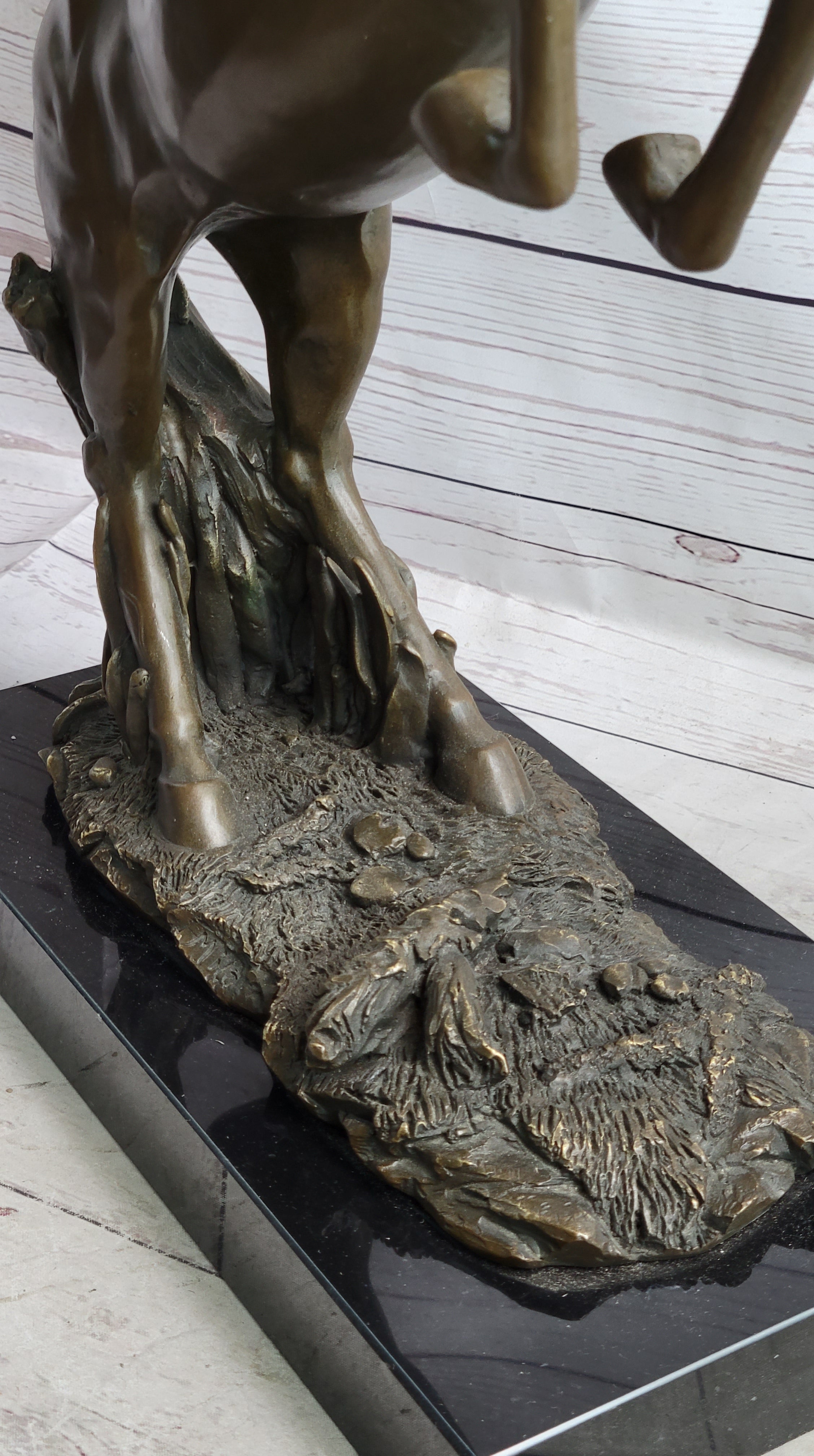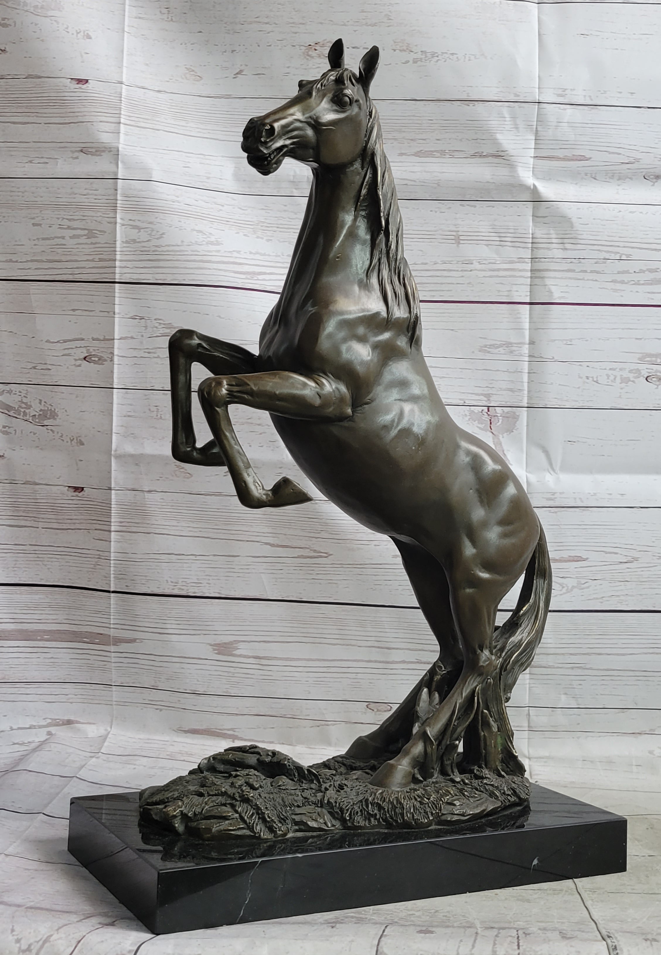 In a display of wild fear and unbridled excitement, the majestic horse rears up on its powerful hind legs, creating a striking and dynamic pose. With its mouth open wide, emitting a resounding neigh that reverberates through the air, the horse's actions serve as both a warning and a proclamation of its vitality. The rearing stance, though captivating in its magnificence, also holds an inherent danger, a reminder of the untamed spirit of this iconic creature. The sculpture masterfully captures this moment of intense emotion, showcasing the horse's intricate musculature and anatomy as it defies gravity. Crafted with precision and artistry, the bronze sculpture employs the ancient lost wax method, ensuring that every detail, from the flowing mane to the powerful legs, is faithfully represented. The sculpture's presence is further elevated by its placement upon a sleek black marble base, providing a stable foundation that contrasts with the horse's dynamic movement. The artist's signature, Milo, serves as a seal of authenticity and craftsmanship, solidifying the sculpture's status as a true collectible piece. Whether displayed as a homage to equestrian beauty or as a reminder of the untamed spirit within us all, this bronze sculpture captures the essence of the rearing horse's energy and power, forever frozen in a moment of awe-inspiring intensity.