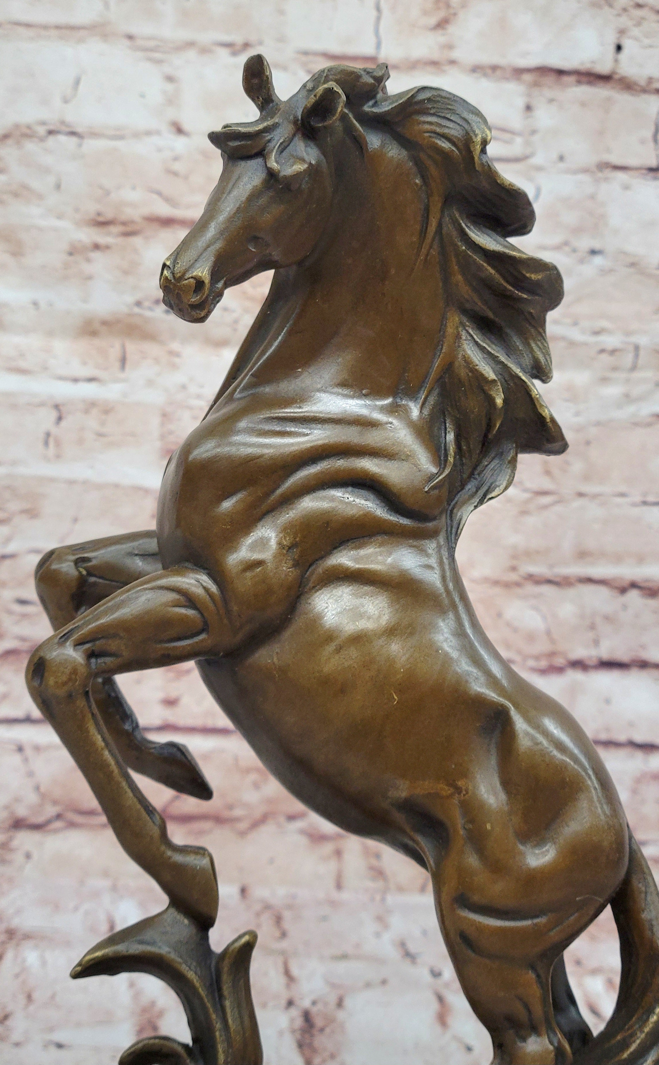 Whether you're a dedicated equestrian or simply appreciate the grace and power of horses, this bronze artwork is a captivating addition to any collection. It embodies the untamed spirit of these majestic creatures, and its presence commands attention and admiration. Display it in your home, office, or gallery, and let the emotional intensity of the rearing horse leave a lasting impression on all who behold it.Bronze Dimensions with Marble Base: Height 12" X Width 7"