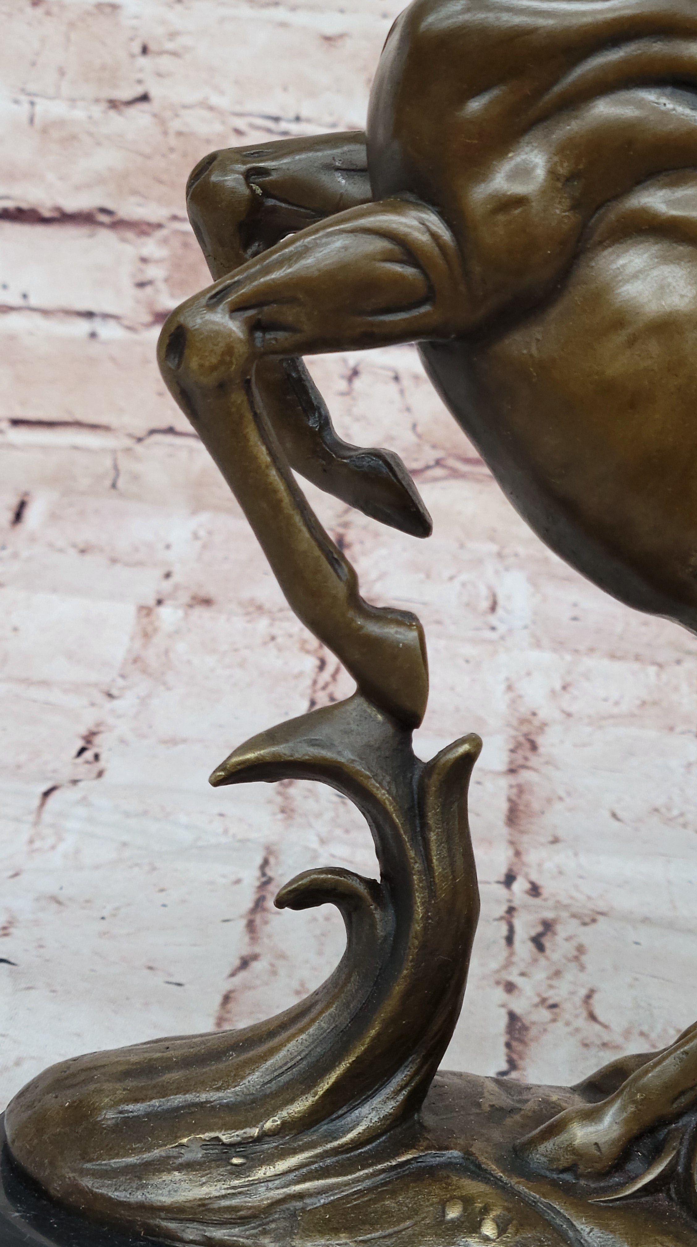 This striking bronze sculpture encapsulates the raw essence of a horse's primal reaction - the intense mixture of fear and excitement. With its powerful hind legs reared high into the air and a wide-open mouth releasing a resounding neigh, this artwork vividly captures a moment of equine emotion that's both mesmerizing and potentially hazardous. The rearing horse's natural response to its surroundings is brilliantly conveyed in this piece, making it instantly recognizable to horse enthusiasts and admirers of equine beauty.