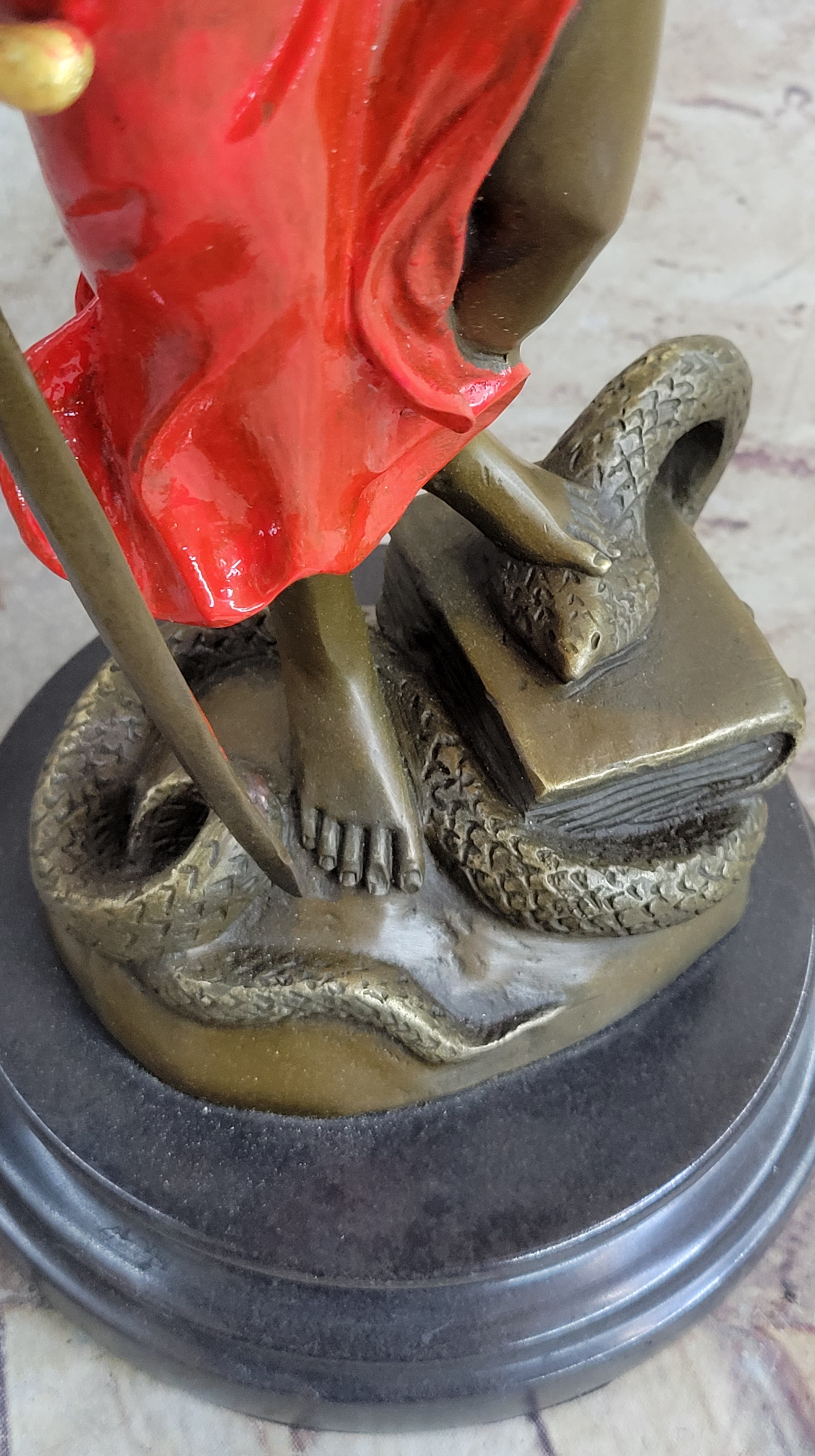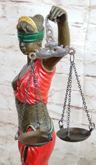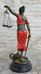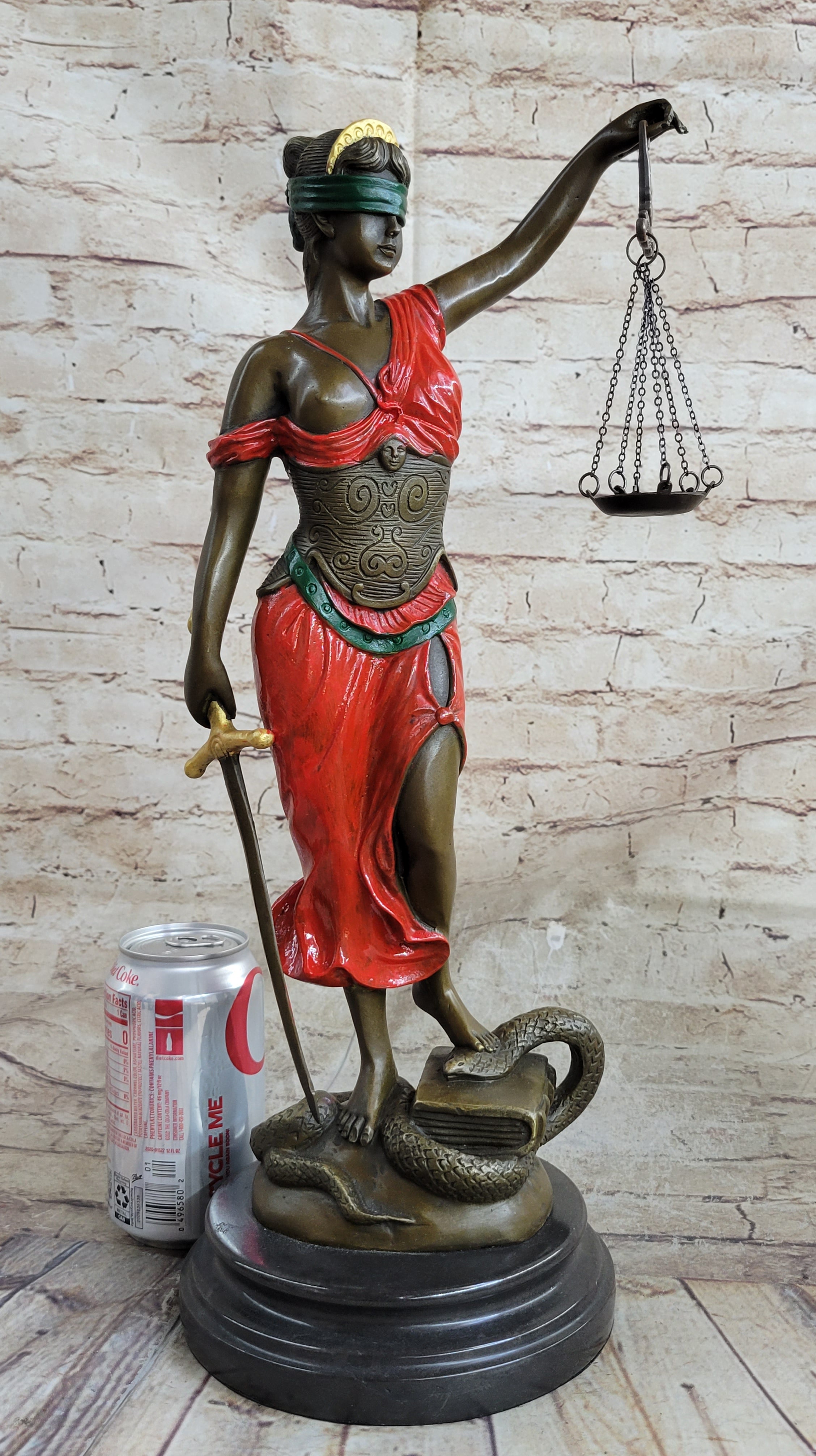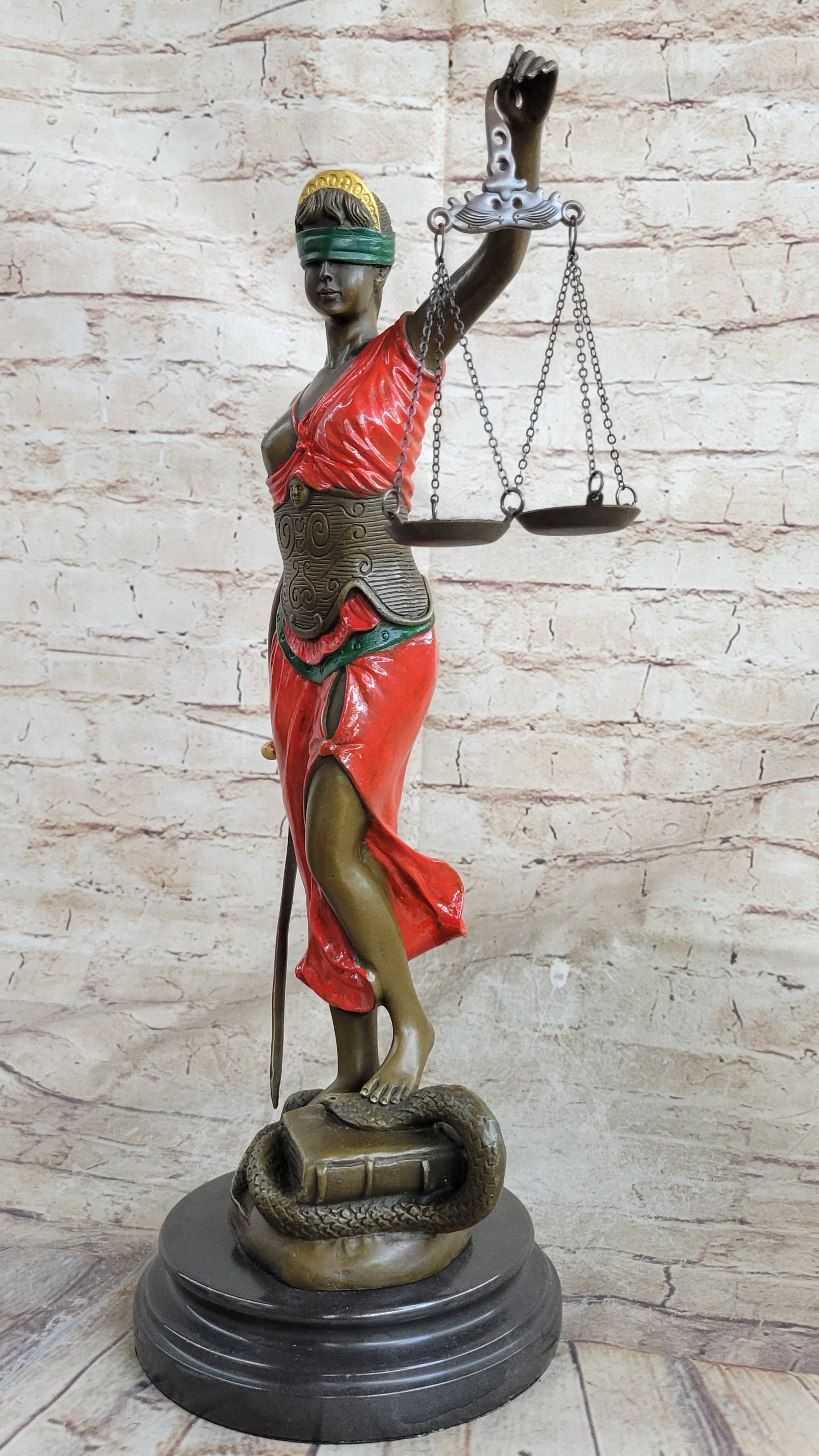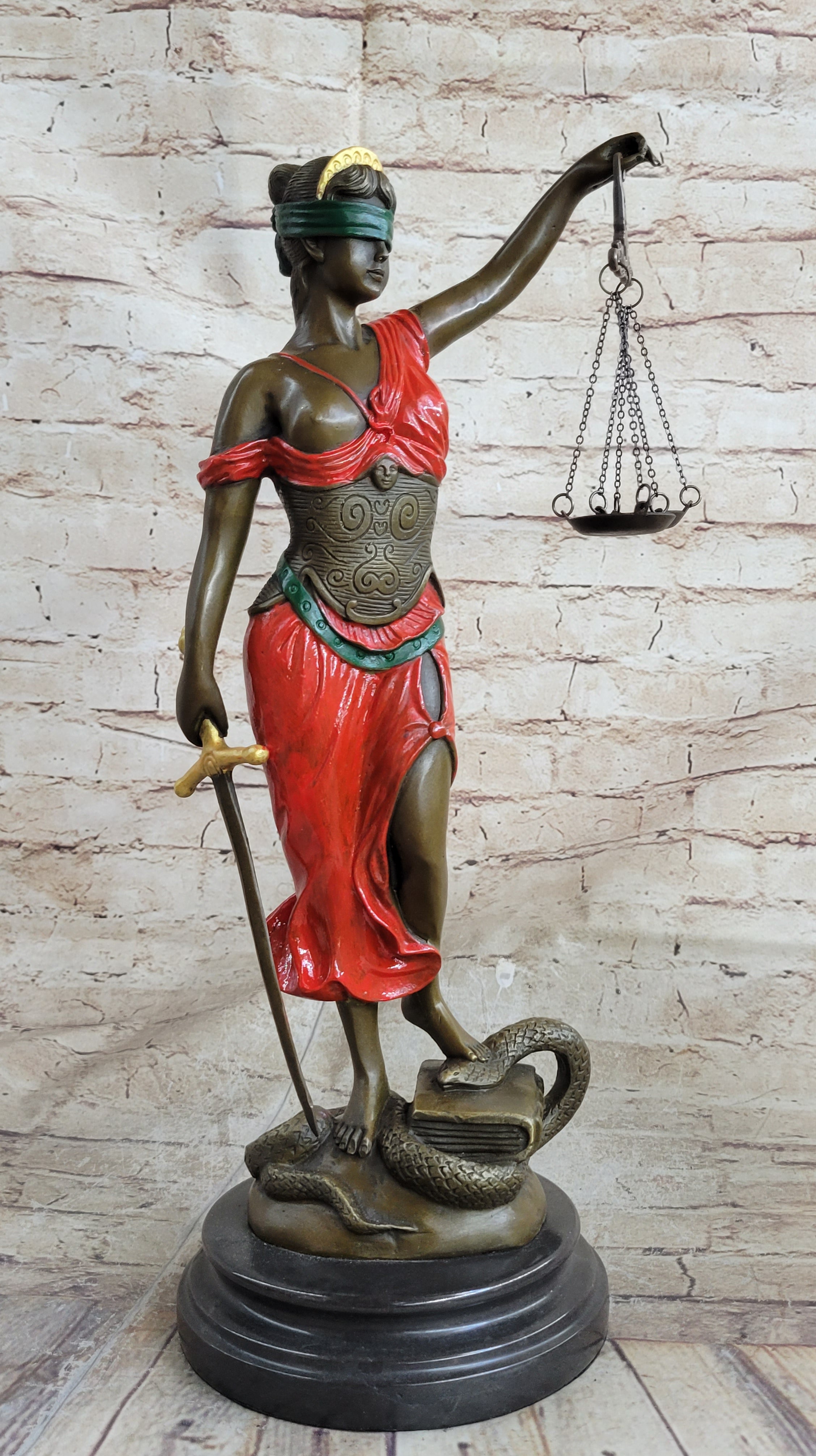 This remarkable bronze sculpture portrays Lady Justice, the embodiment of moral force and the symbolic representation of justice in judicial systems. Rooted in ancient symbolism, Lady Justice is depicted as a blindfolded figure, signifying her impartiality in meting out justice without bias. In her left hand, she delicately balances the scales, representing truth and fairness, a profound measure of the strength behind a case's support and opposition. Lady Justice's right hand holds a sword, symbolizing the power of reason and justice, a force that can either protect or challenge any party involved. Her stance, with one foot on a book and the other on a snake, carries significant meaning. The book signifies the lessons of history, encouraging us to stand against wrongdoing while embracing the virtues of the past. The snake, representing hatred, is kept at bay by Lady Justice's resolute foot, preventing it from gaining a foothold. This sculpture is a testament to the enduring concept of justice and the principles it embodies. Crafted using the age-old lost-wax casting method, the sculpture boasts intricate details and a multi-color patina finish. Mounted on a black marble base, this piece captures the timeless essence of Lady Justice and serves as a powerful symbol of the pursuit of fairness and righteousness in society.