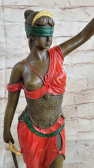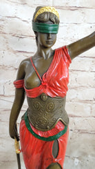 Red Lady Justice Bronze Statue – Blindfolded Woman with Scales & Sword on Marble Base