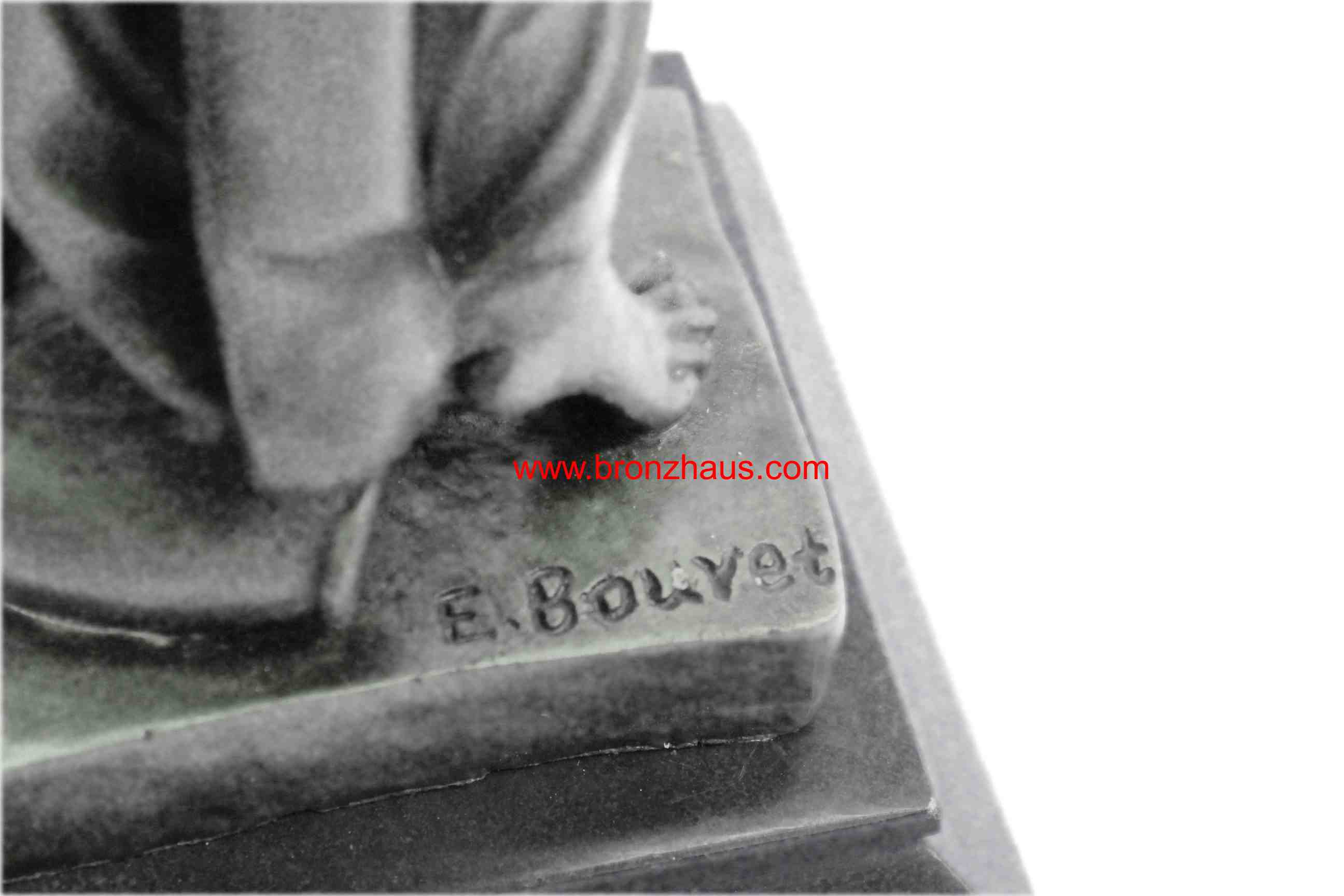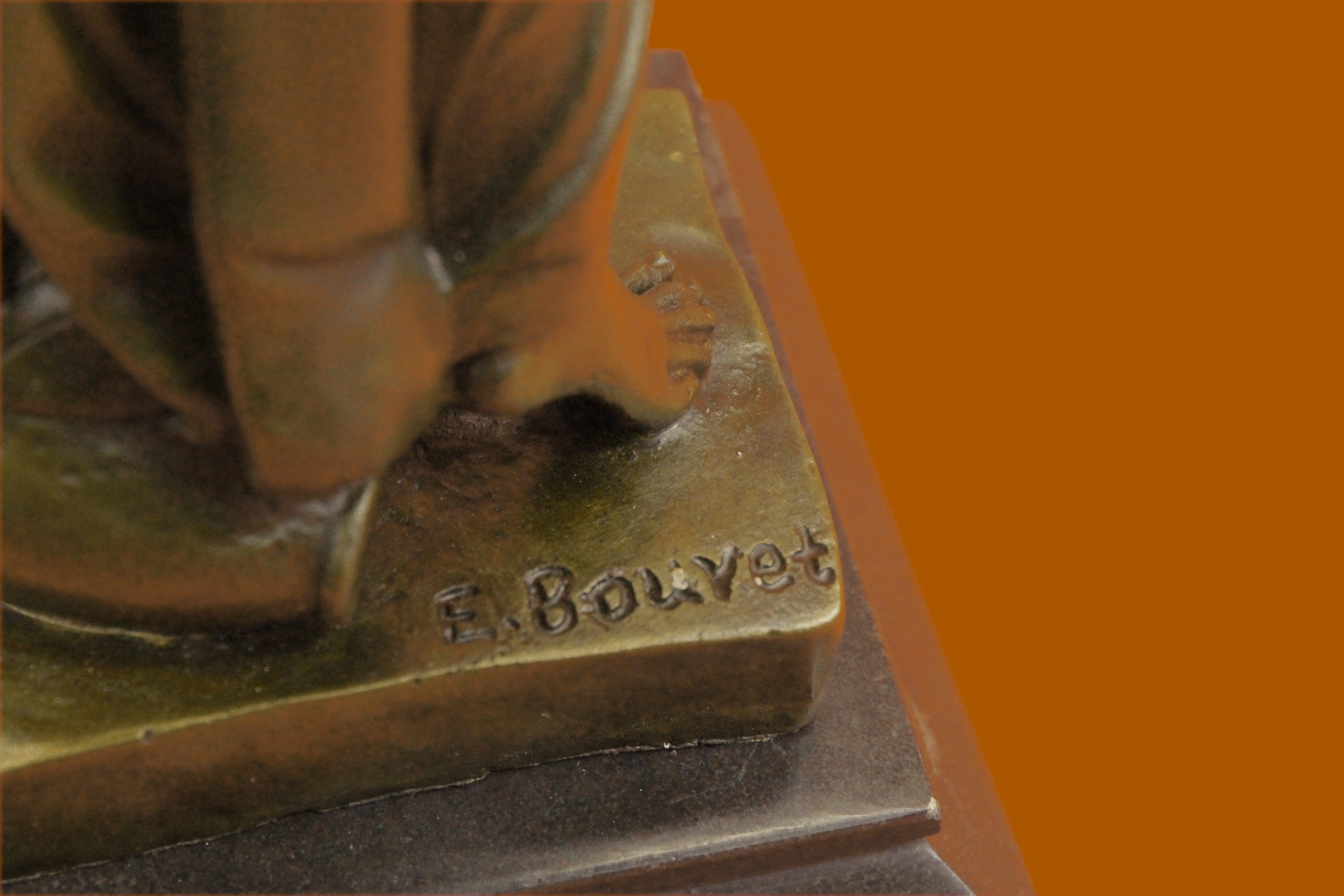 Resting proudly on a round black marble base, this piece is a harmonious blend of artistry and craftsmanship. The artist's signature, E. Bouret, adds a personal touch to this already exquisite sculpture, making it a valuable addition to any art collection or a standout piece in your home or office décor.Bronze Dimensions with Marble Base: Height 15" X Width 5"