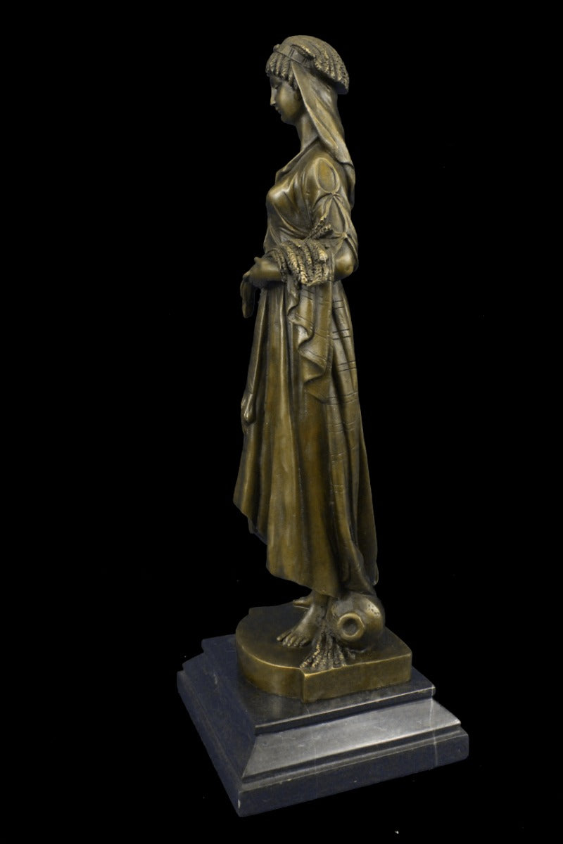 This exquisite bronze sculpture, created by the celebrated French artist Eutrope Bouret (1833-1906), captures a timeless moment of a woman gracefully gathering wheat. The intricate details meticulously sculpted into the bronze piece showcase the artist's mastery, making it a truly remarkable work of art.
