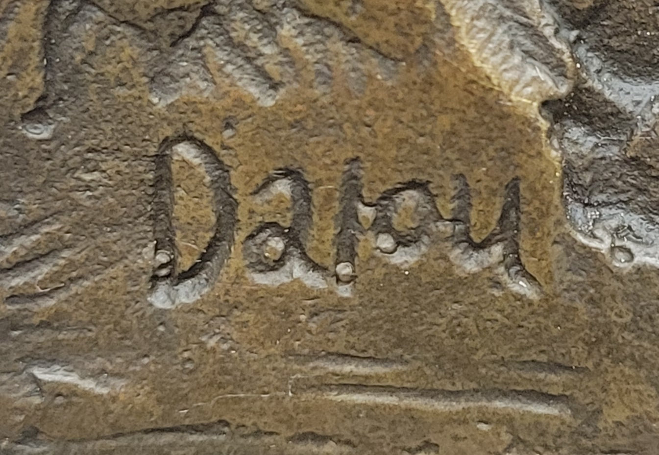 Mounted on a sleek black marble base, this sculpture exudes sophistication and grace, making it a striking piece for any home or collection. Signed by the talented artist Dalou, it is a timeless keepsake that will be cherished for years to come.Bronze Dimensions with Marble Base: Height 18.5" X Width 9"