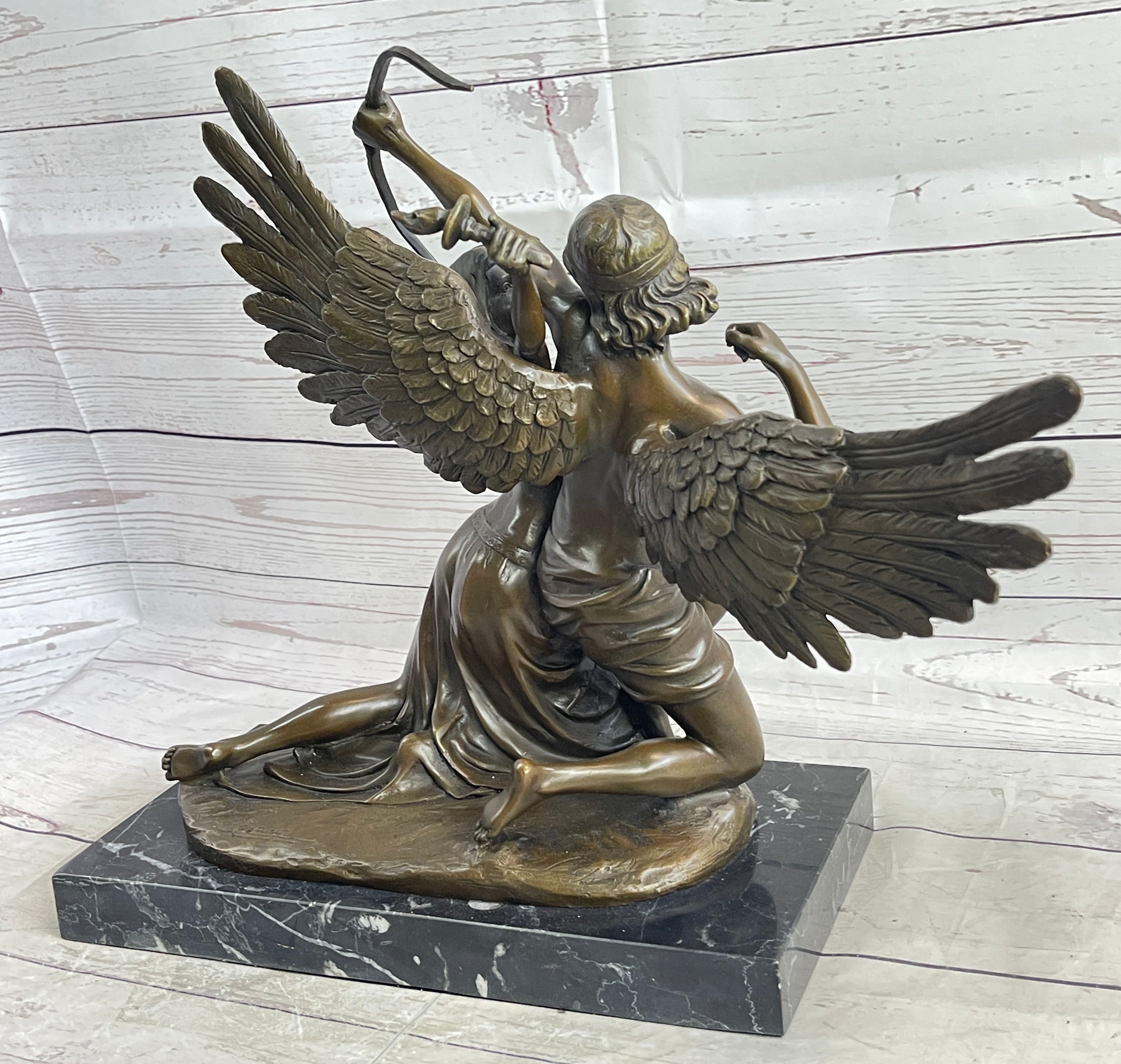 Handmade with meticulous attention to detail, this sculpture is a true masterpiece. Crafted from 100% bronze, it showcases the artist's skill in capturing the intricacies of the human form. The Angel's flowing hair, wild with curls, and the meticulously detailed wings add to the sculpture's beauty. Both figures possess perfectly proportioned bodies, showcasing the remarkable anatomy of the female and male forms.