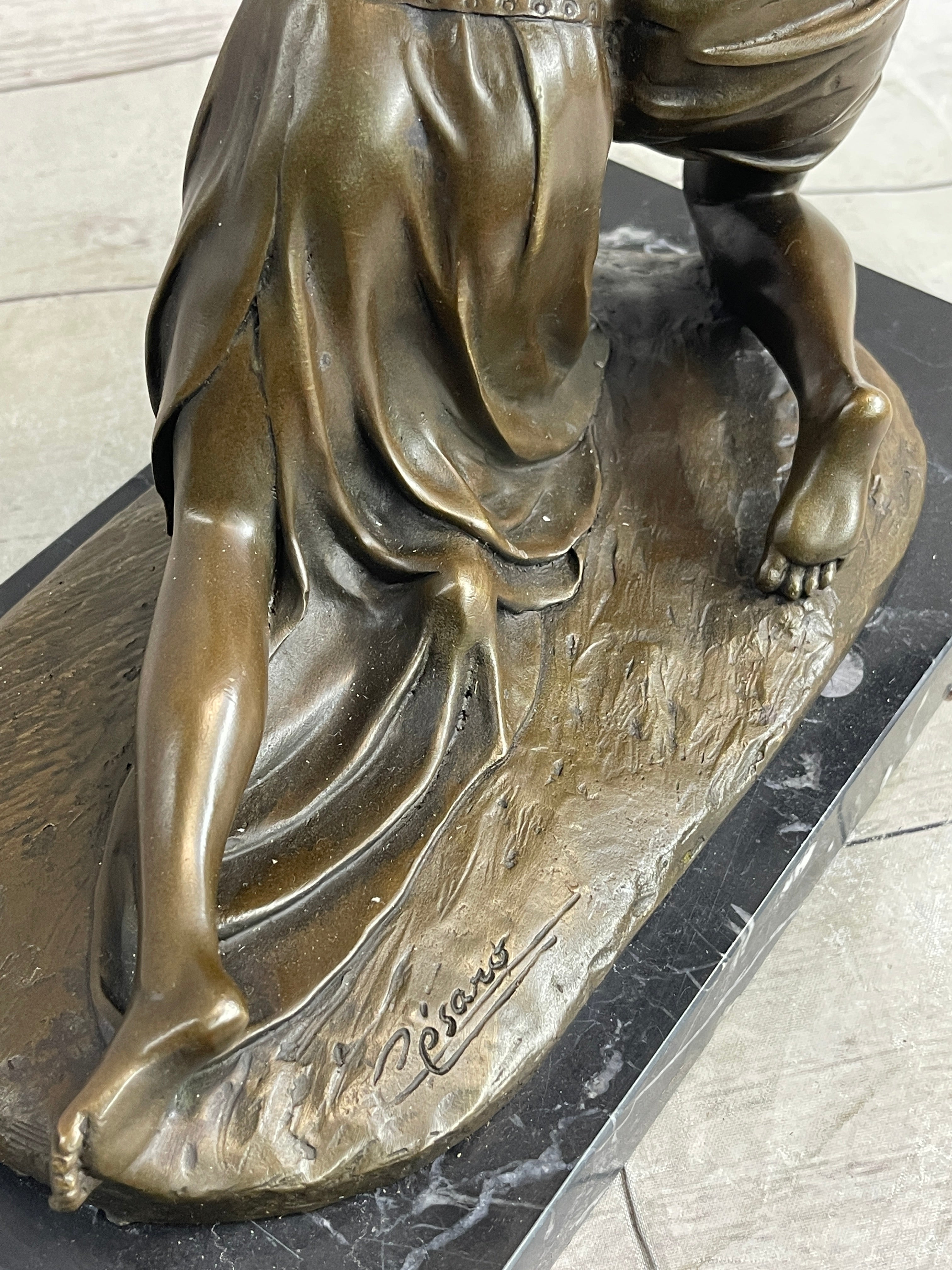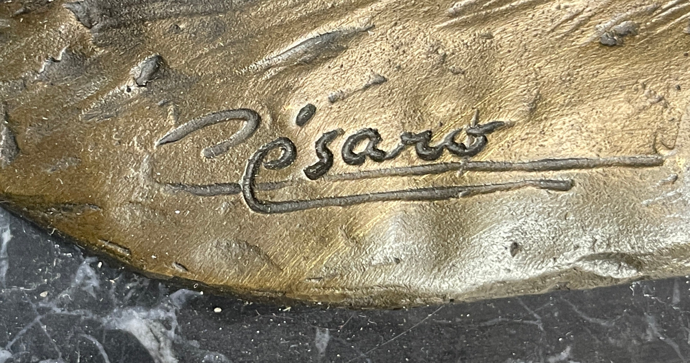 Mounted on a black marble base with a rich brown patina, this sculpture is a striking addition to any collection. It bears the signature of the talented artist Cesaro, further affirming its authenticity and artistic value. Experience the enchanting embrace of love and admiration with this remarkable bronze masterpiece.Bronze Dimensions with Marble Base: Height 14" X Width 15"