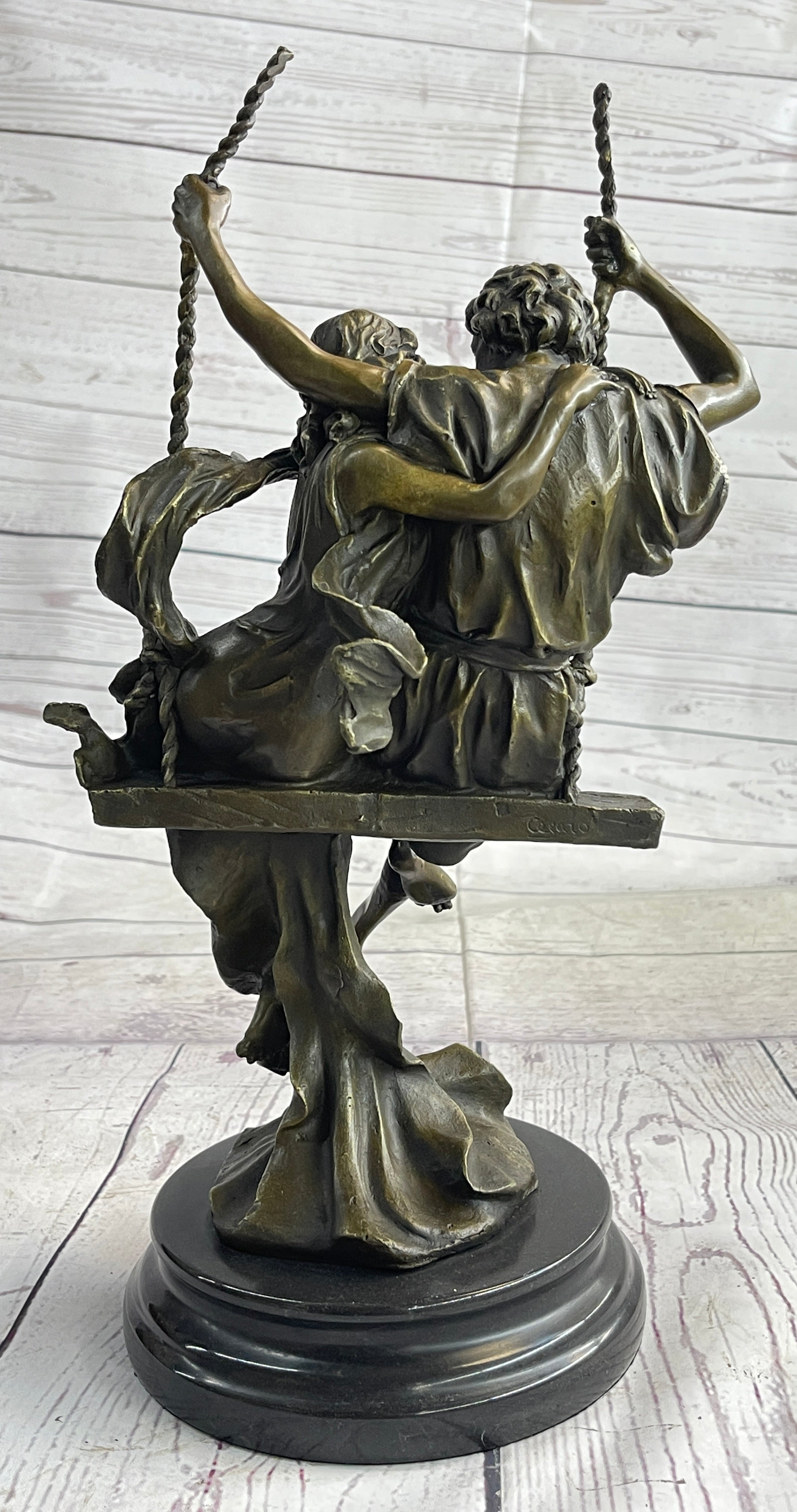 This exquisite piece bears the signature of renowned artist Cesaro, ensuring its authenticity and artistic value. Whether as a centerpiece in your living room or a cherished addition to your art collection, the Couple on a Swing Sculpture brings a timeless beauty and a celebration of love into your home. Embrace the charm and emotional depth of this masterpiece, and let it be a symbol of everlasting romance and joy.Bronze Dimensions with Marble Base: Height 14" X Width 7.5"