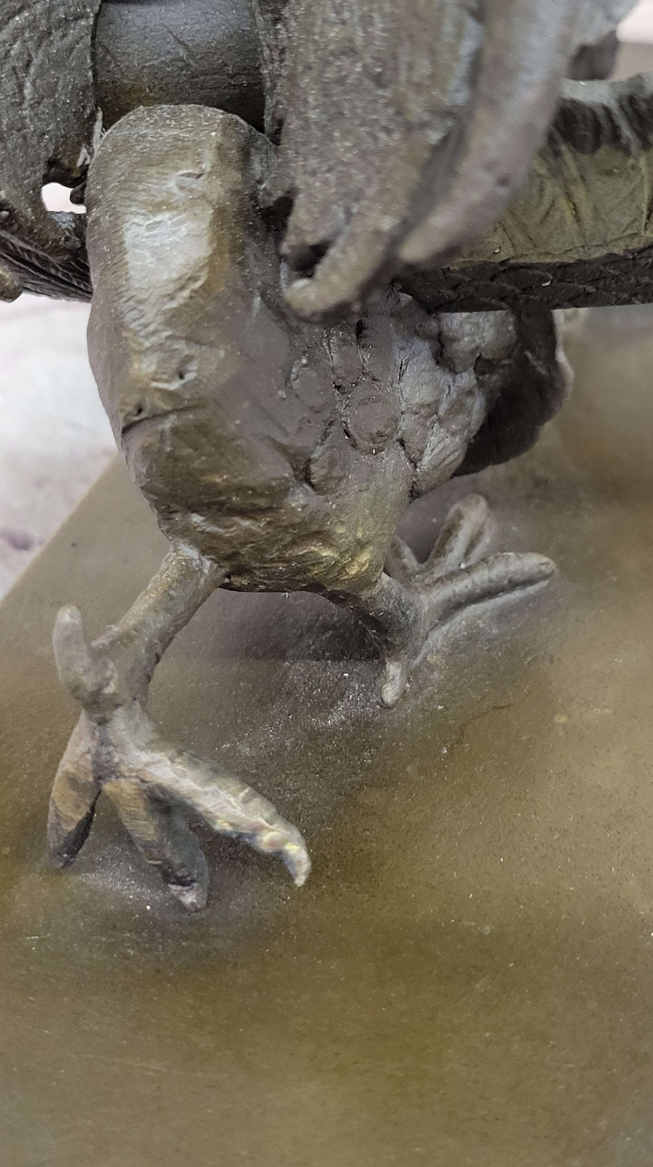 Celebrate the energy and passion of this "Two Rooster Cock Fight" sculpture, a testament to Miguel Lopez's artistic vision and skill. Whether displayed in a home, office, or gallery setting, this genuine bronze artwork is sure to captivate and inspire, inviting viewers to appreciate the artistry and intricate details that make it truly remarkable.Bronze Dimensions with Marble Base: Height 9" X Width 13.5"