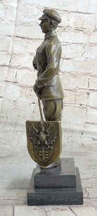 This striking bronze sculpture, titled "Polish Soldier Warrior," serves as a powerful tribute to the brave warriors of Poland, embodying the essence of strength, valor, and patriotism. Crafted with meticulous attention to detail using the lost wax method, the sculpture captures the resolute spirit of the soldier as he proudly brandishes a shield adorned with the majestic crest of an eagle. Each intricately detailed feature reflects the soldier's unwavering determination and steadfast resolve in the face of adversity.