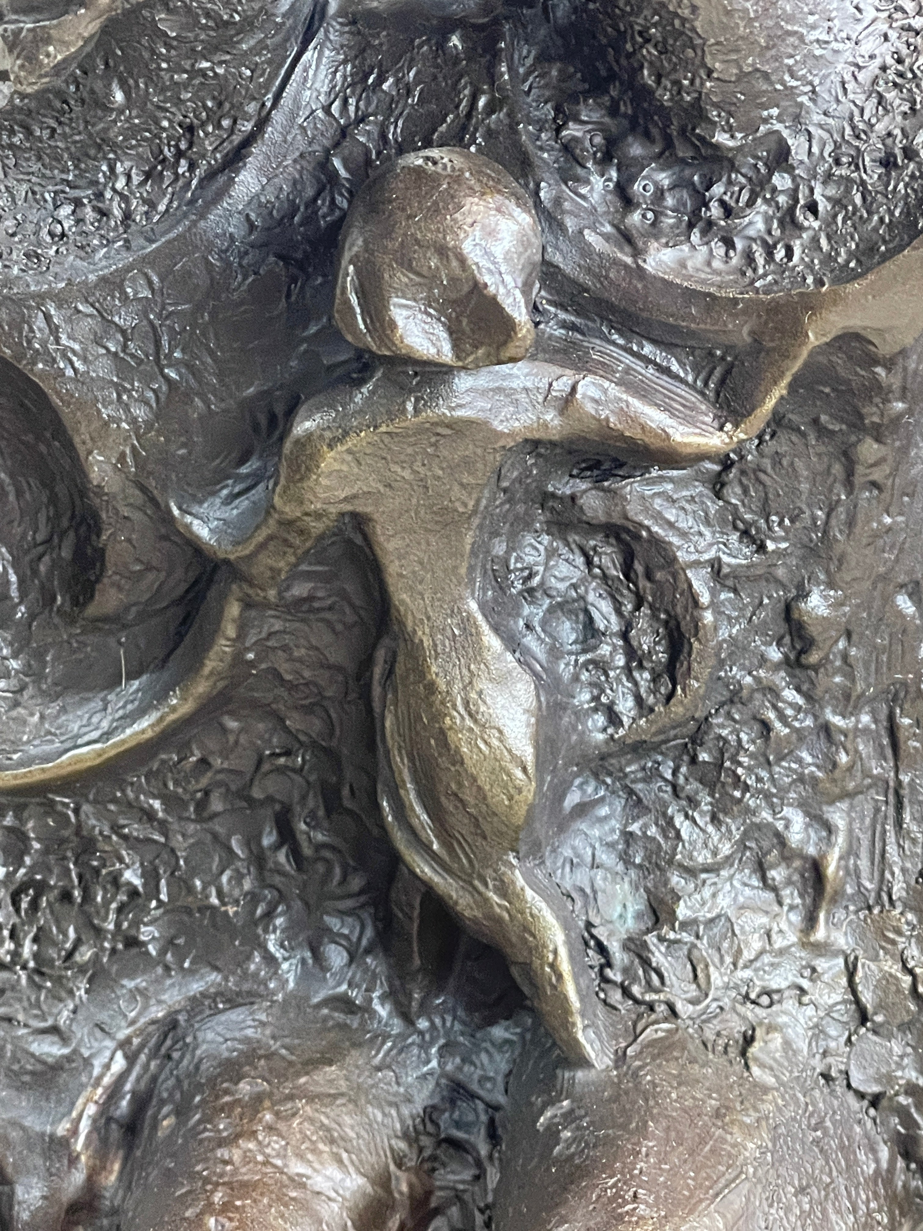 Despite the simplicity of the features, the sculpture exudes a profound sense of intimacy. The adult figures, while distinct, seamlessly blend as their outstretched arms intertwine and become one with the figure of their child. This blending of forms not only enhances the familial connection but also adds a layer of emotional depth to the artwork. The use of the lost-wax casting method contributes to the meticulous craftsmanship, ensuring that every detail is faithfully preserved in the final three-dimensional composition.