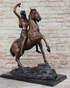 Handmade with dedication and skill, this bronze sculpture pays homage to the rich heritage of Western art. The use of the lost wax method ensures the highest quality and fidelity to the artist's original vision. As you behold this exquisite figurine, you will be transported to a bygone era, where the struggles and triumphs of the West come alive in Remington's artistry. Own a piece of history and add a touch of Western heritage to your collection with this exceptional bronze sculpture by Frederic Remington.Bronze Dimensions with Marble Base: Height 26" X Width 22"
