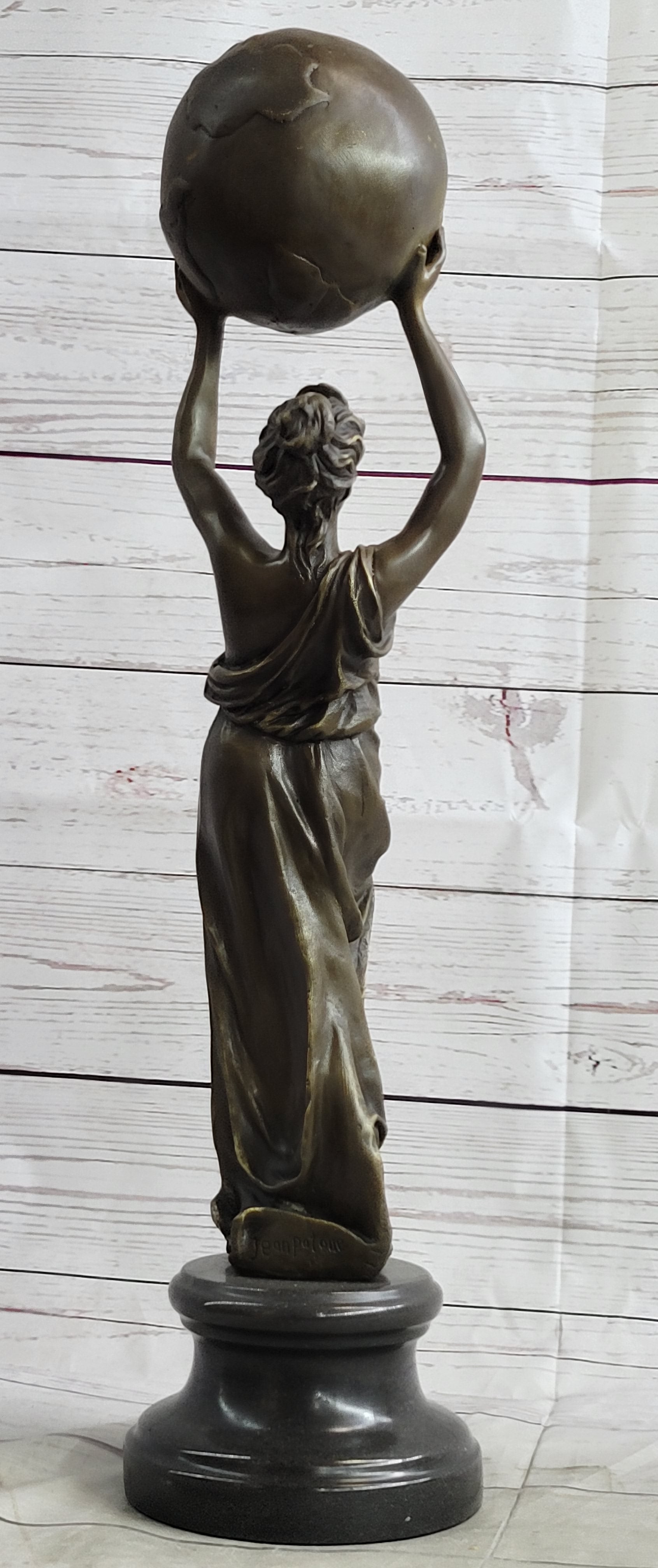 The artist Jean Patoue's signature stands as a testament to the authenticity of this remarkable bronze masterpiece. Perfectly suited for display in a variety of settings, from private spaces to galleries, "Worldly Strength" encapsulates the essence of empowered womanhood and serves as an inspiring reminder of the strength that lies within us all.Bronze Dimensions with Marble Base: Height 20" X Width 5.5"